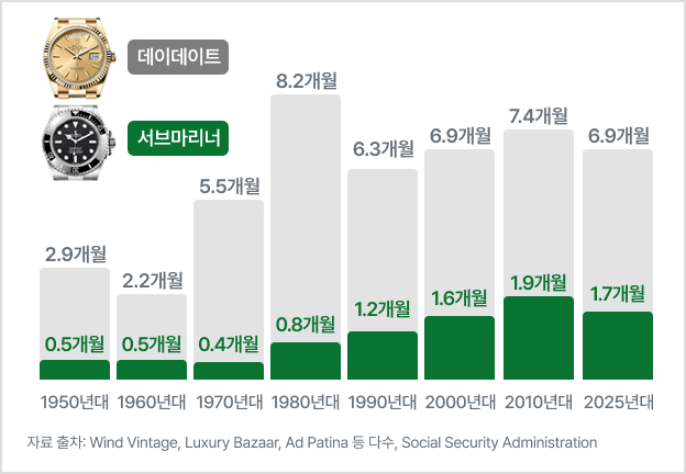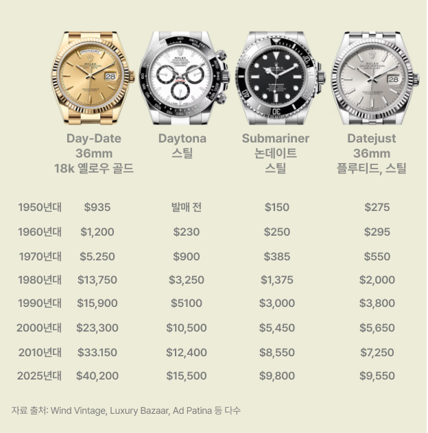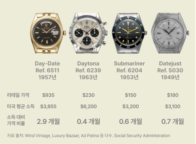 1960년대부터 1980년대까지 데이-데이트를 구매하려면 평균 6~9개월치 월급이 필요했습니다. 반면, 스틸 소재 롤렉스는 1~2개월치 월급으로 구매할 수 있었죠.