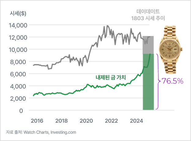 70그램의 순금은 현재 시장에서 약 $10,000(약 ₩14,000,000)의 가치를 지니고 있습니다. 중고 시장에서 빈티지 데이-데이트의 평균 가격이 ₩18,000,000~₩22,000,000임을 감안하면, 구매가의 60%에서 75% 정도가 순금 자체의 가치에 해당합니다.