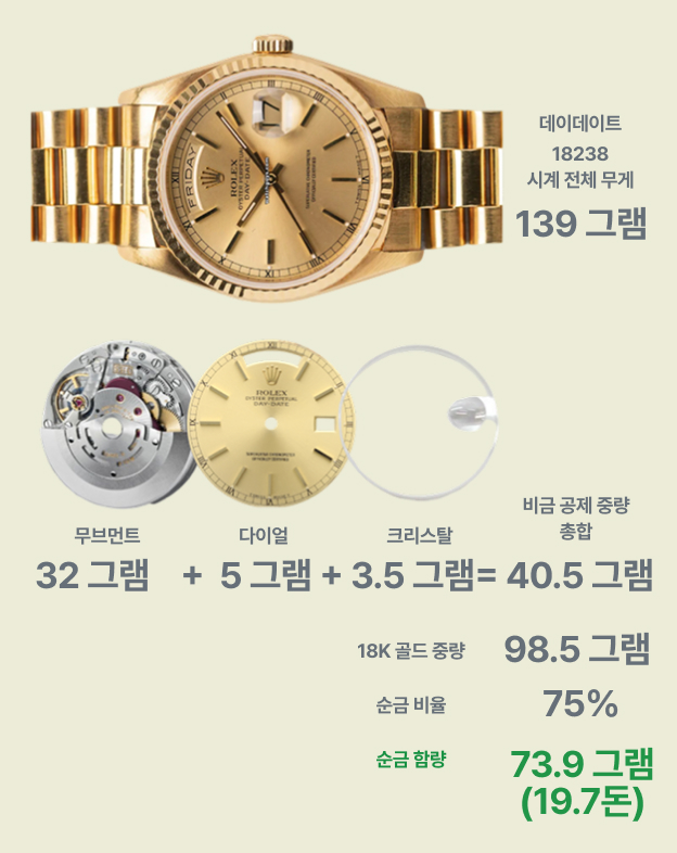 흥미로운 사실: 36mm 사이즈 데이-데이트를 구매하면, 사실상 70그램(19돈)의 순금을 소유하는 셈입니다.