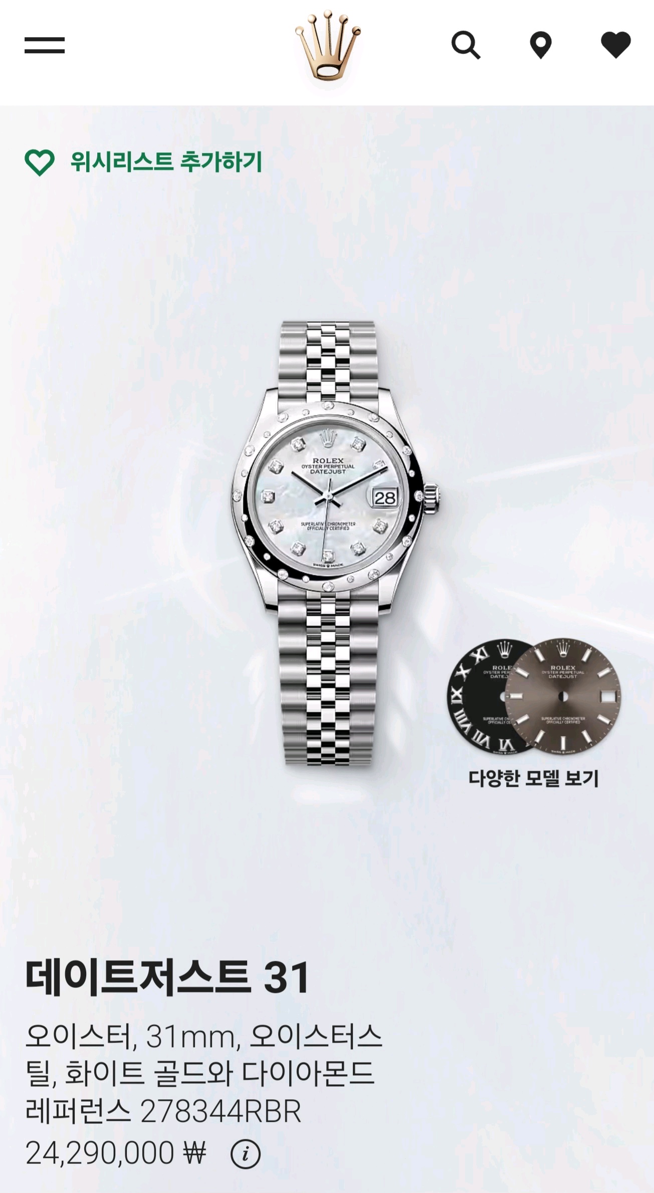 Datejust31,M278344RBR-0006,데이트저스트,데이저스트,레이디,데이트,데잇저스트,데잇,화이트진주자개,다이아몬드,스테인레스스틸+화이트골드,스테인레스스틸,쥬빌리브레이슬릿,사파이어크리스탈,31mm,롤렉스 데이저스트 데이트저스트 31 278344RBR 진주 자개 다이아 다이아몬드,Rolex Datejust 31 278344RBR steel mop mother of pearl diamonds,화이트 진주자개,스테인리스 스틸,쥬빌리 브레이슬릿,사파이어 크리스탈,Stainless steel,Hidden folding clasp,Date / diamond-set indices,Datejust 31,데이저스트 31,Datejust,Rolex,롤렉스,화이트,다이아몬드 세팅,진주자개