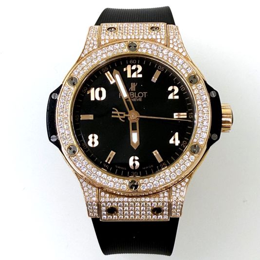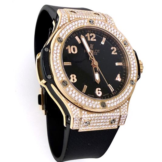 위블로 빅뱅 빅 뱅 38 쿼츠 38 로즈 레드 골드 로즈골드 로골 파베 다이아몬드 다이아 파베 38 쿼츠,361.PX.1280.RX.1704,블랙,로즈 골드,러버,스트랩,38mm,다이아몬드 세팅,쿼츠,Cal. HUB2900,Switzerland,Rose gold,Deployant folding clasp,Applied arabic numerals & baton indices,Big Bang Gold Pave,빅뱅 골드 파베,Big Bang,Hublot,위블로