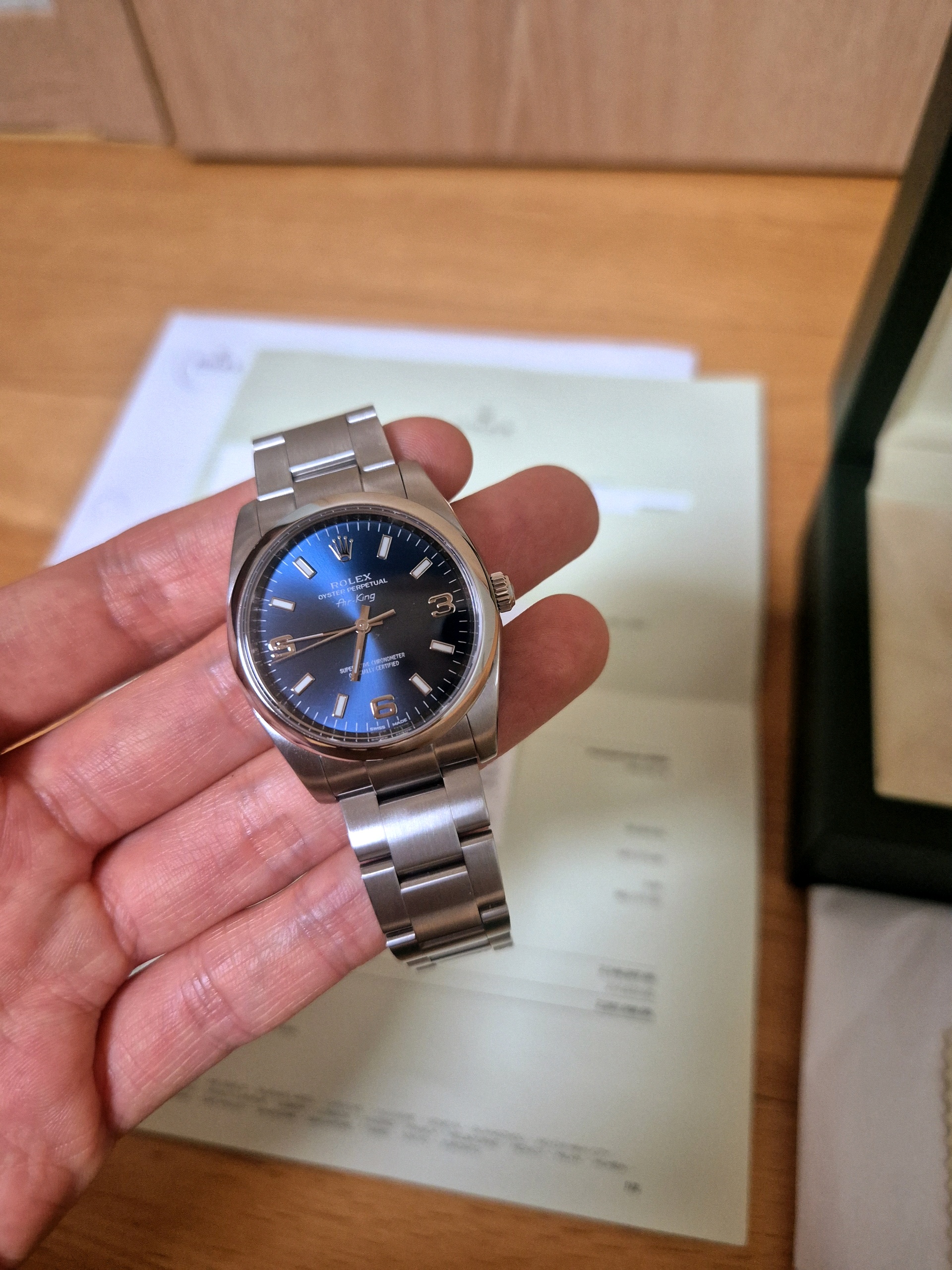롤렉스,로렉스,Rolex,Air King,에어킹,114200-0001,114200,34mm,스테인리스 스틸,스테인레스 스틸,돔 베젤,아라빅,쿼터 아라빅,사파이어 크리스탈,구형 에어킹,빈티지 에어킹,셀프와인딩,기계식,오토매틱,Air-King,Folding clasp,Applied 3-6-9 arabic & baton indices,Stainless steel
