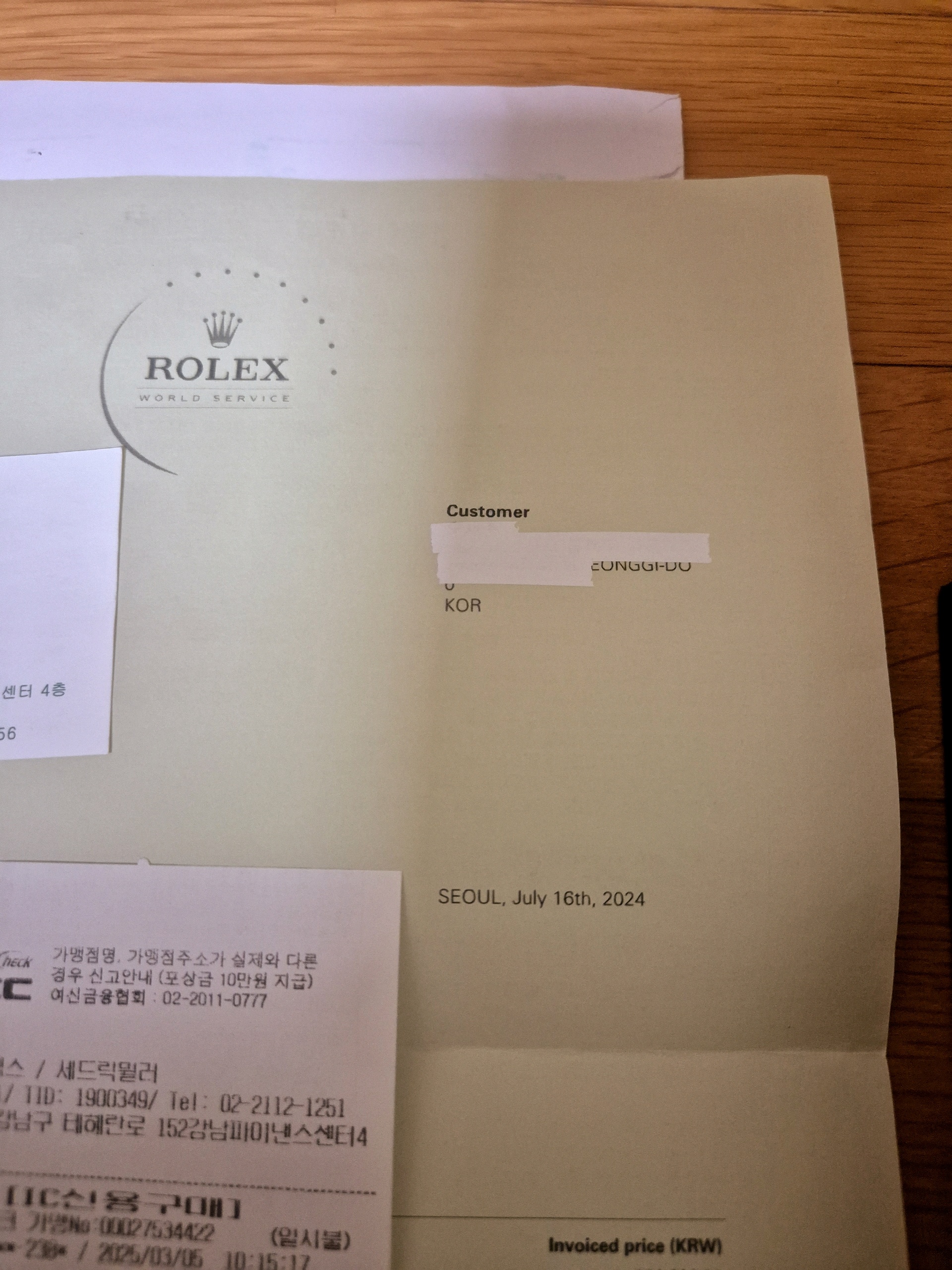 CSセンター修理後に提供するロレックスオーバーホールカードは紛失しておりません(写真速受付請求書とお支払い領収書を差し上げます)