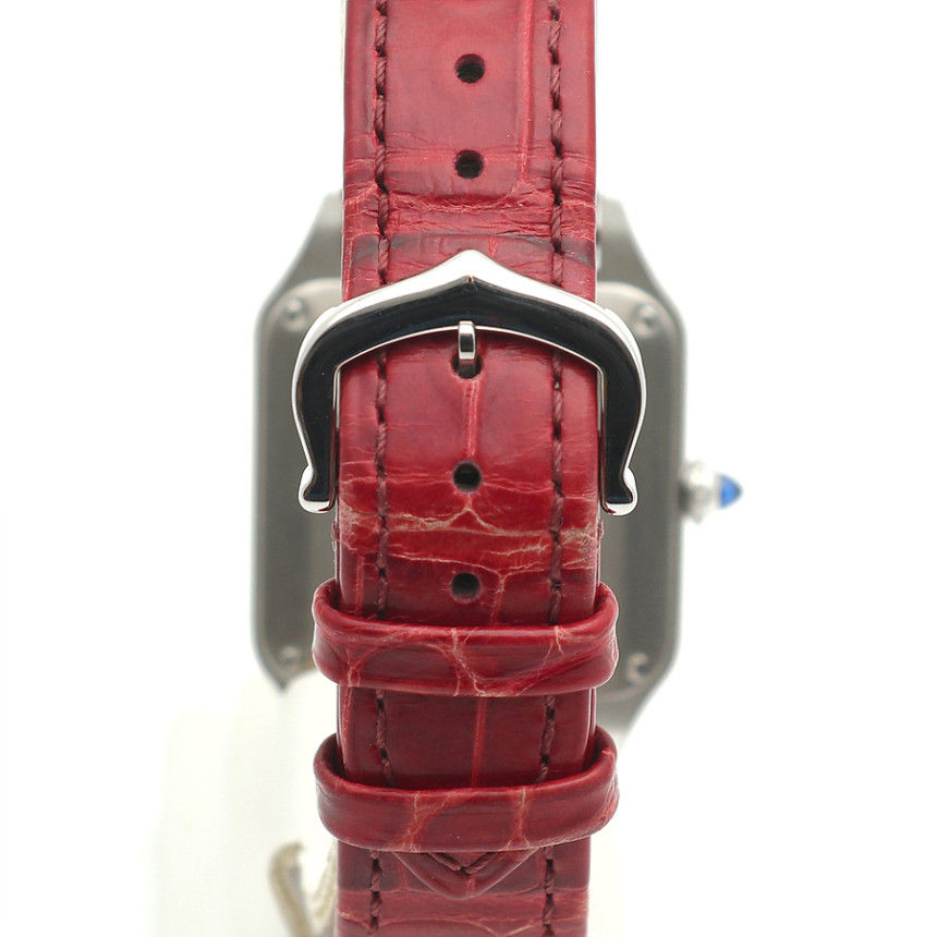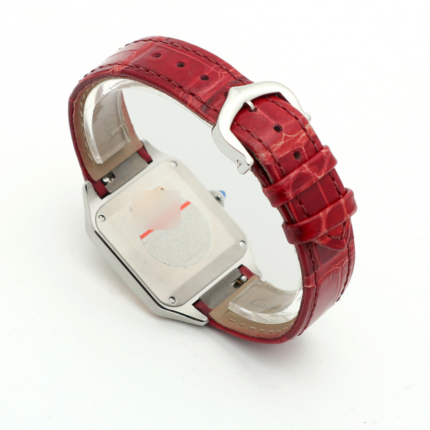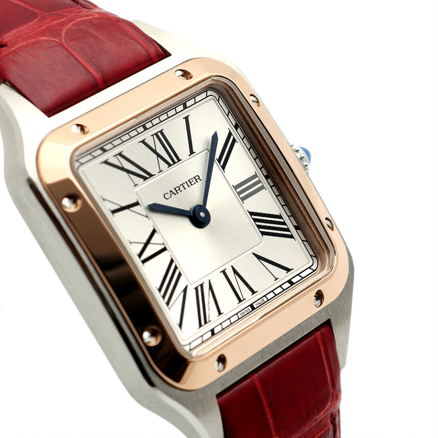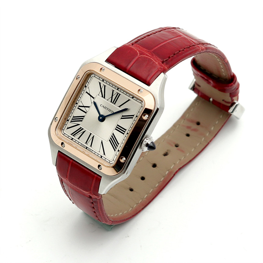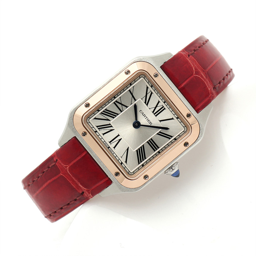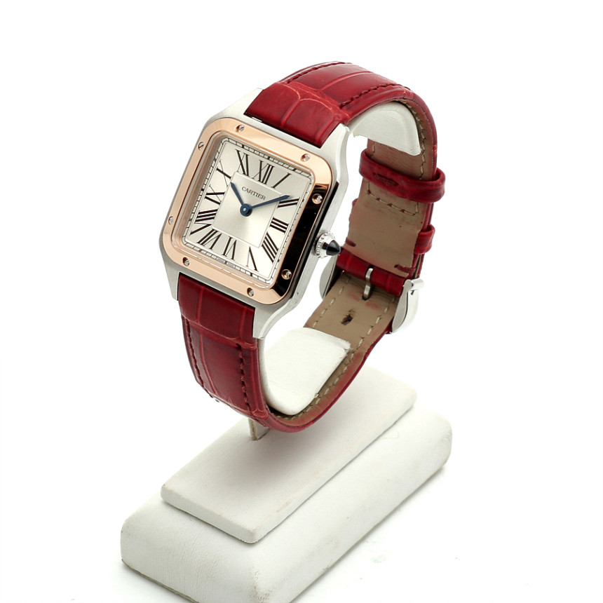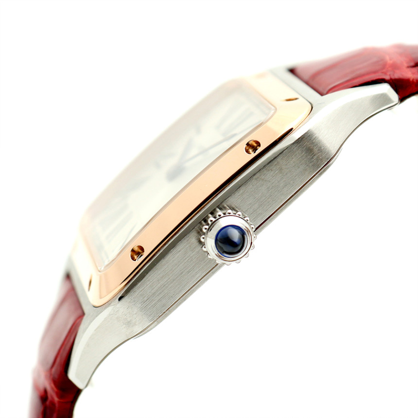 - 素材と特徴:サントスデュモンウォッチ、スモールモデル(横27.5×縦38ミリ)、スチールケース、18Kピンクゴールドベゼル