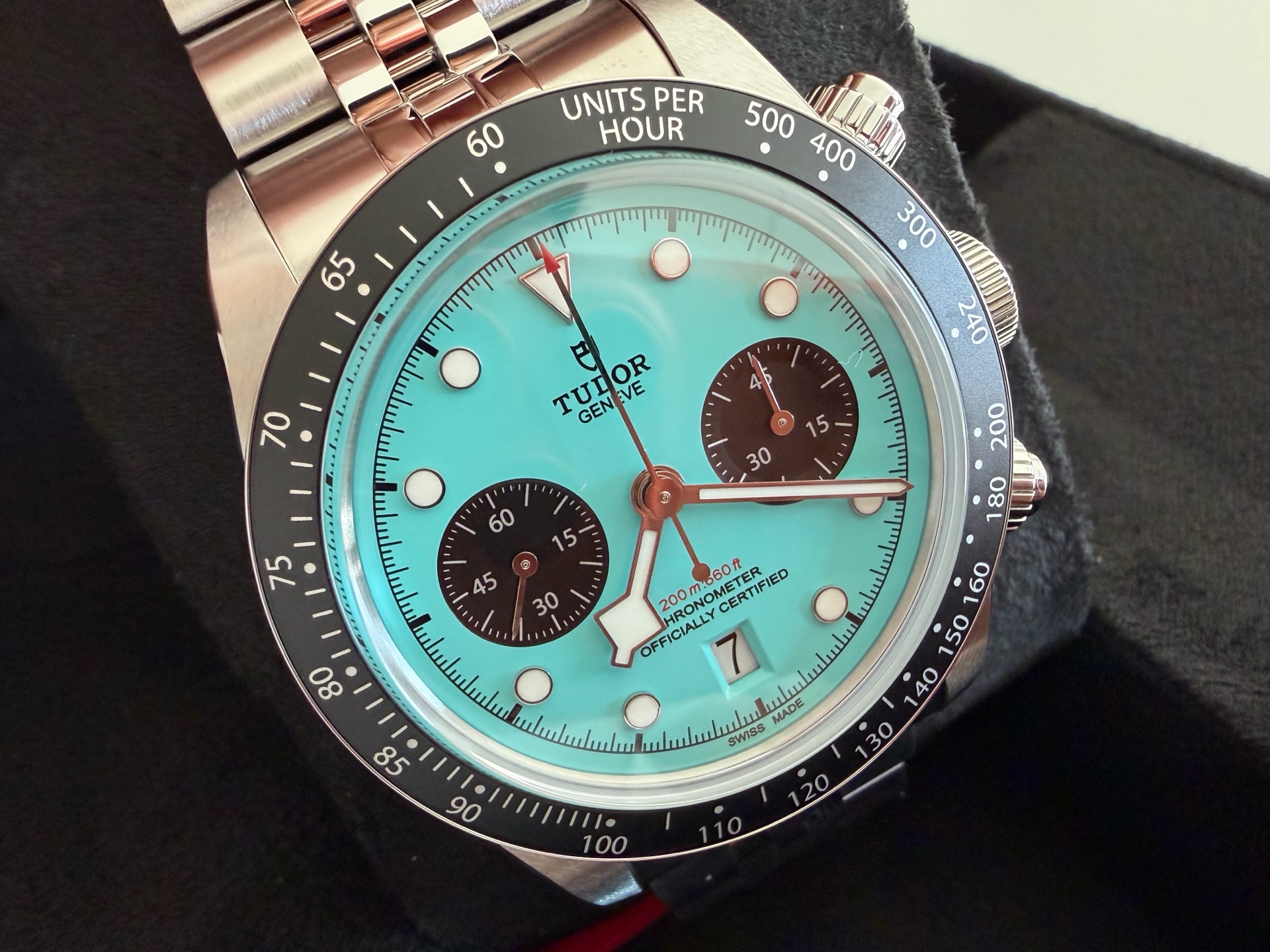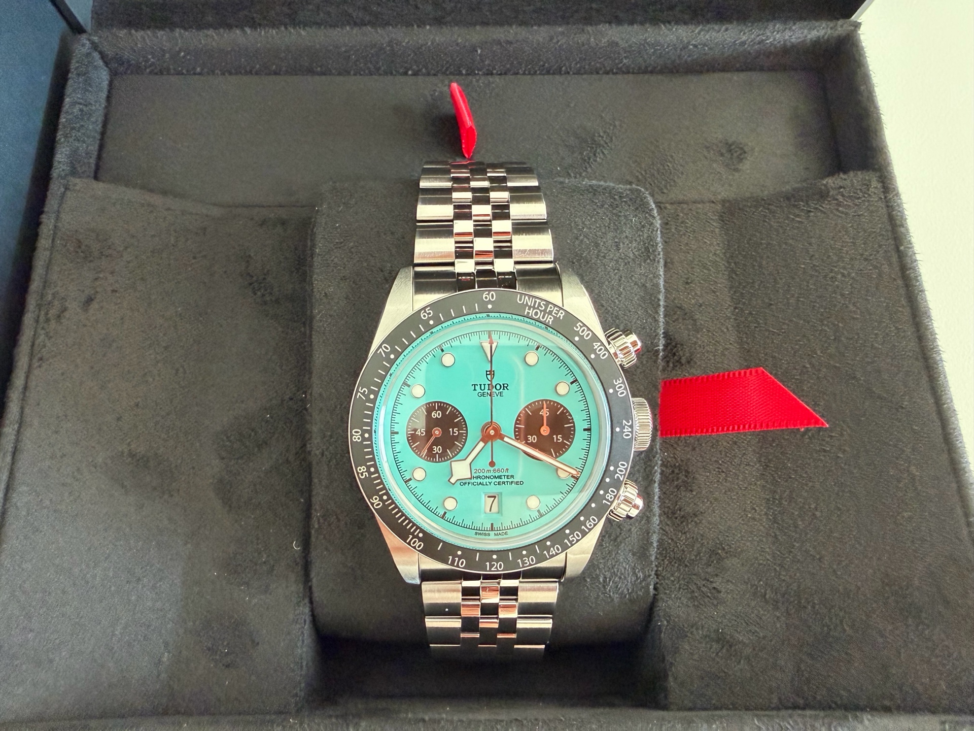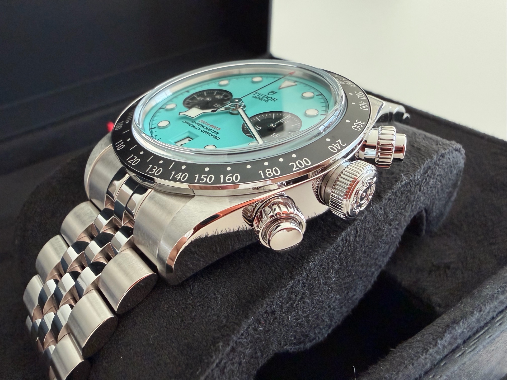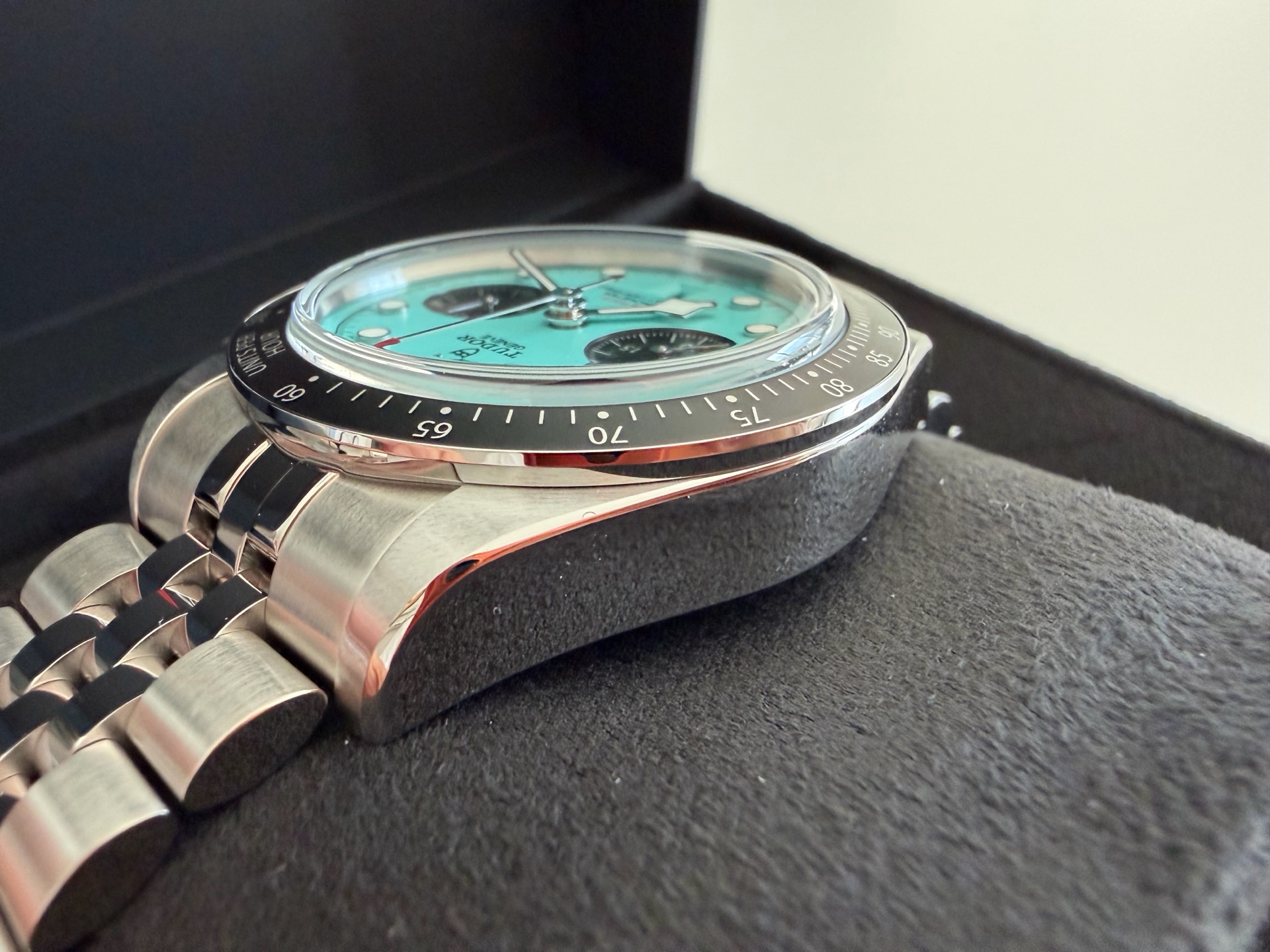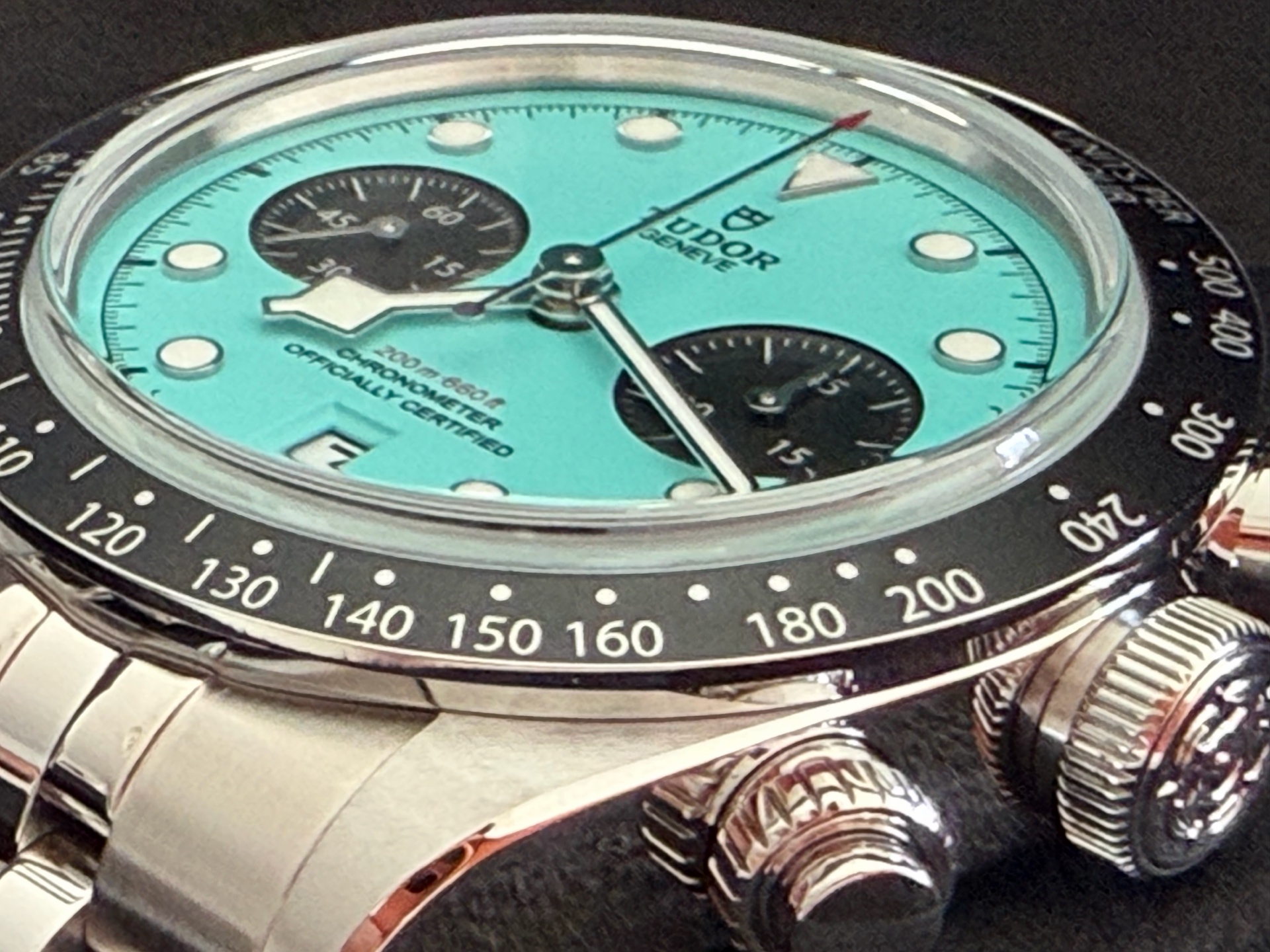 M79360N-0024,Tudor Daring Watches Black Bay Chrono Chronograph Flamingo Blue 79360N,튜더 데어링 블랙베이 블랙 베이 크로노 크로노그래프 플라밍고 플래밍고 블루 터콰이즈 크로노 크로노그래프 79360N,플라밍고 블루,스테인리스 스틸,41mm,타키미터,셀프 와인딩,Stainless steel,Folding clasp,Date,chronograph subdial,small seconds / applied hour markers,Black Bay Chrono,블랙 베이 크로노,Tudor,튜더,Date, chronograph subdial, small seconds / applied hour markers
