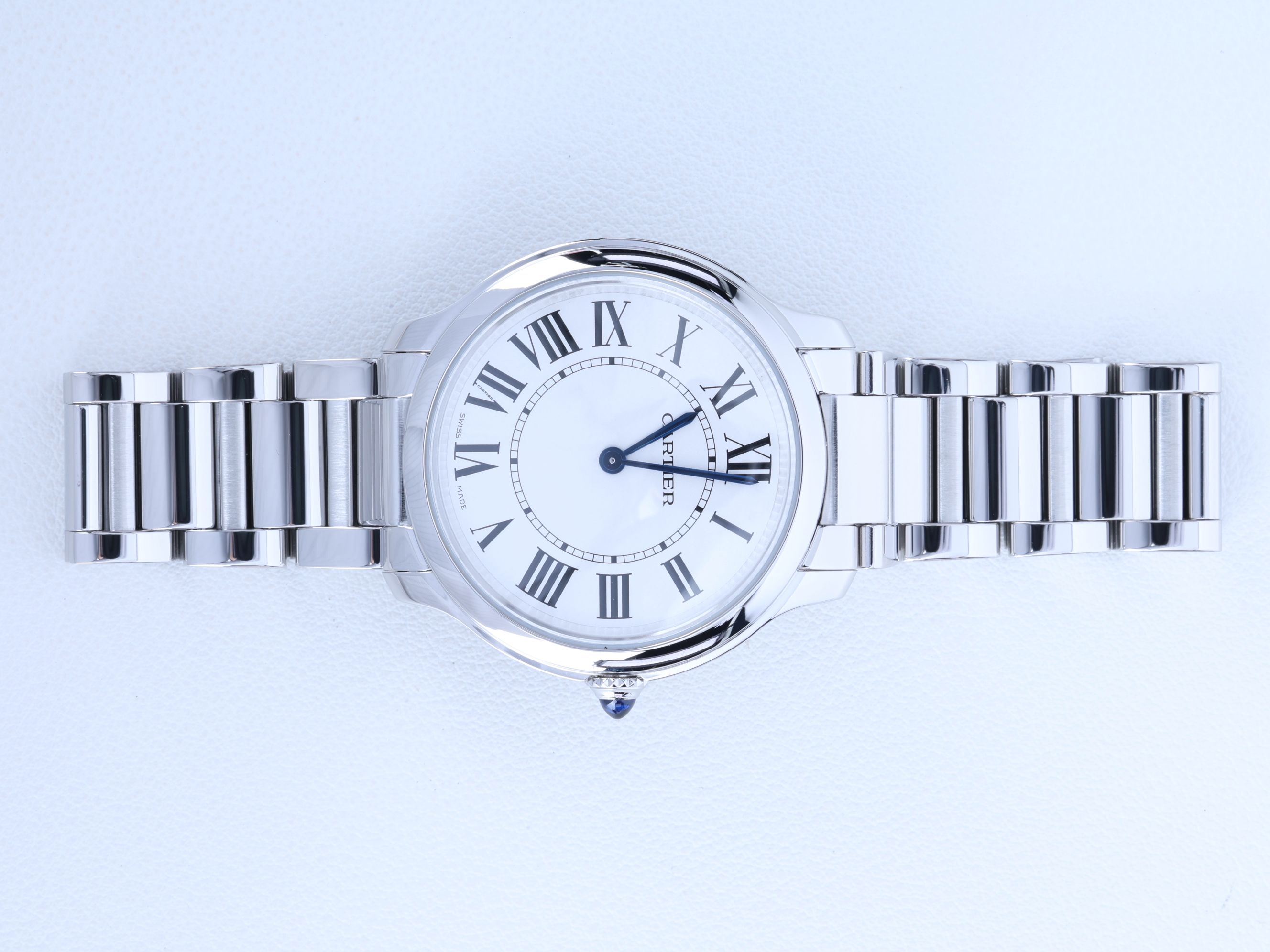 WSRN0034,실버,로만,스테인리스 스틸,36mm,쿼츠,Switzerland,Stainless steel + spinel,Folding clasp,Roman numeral indices,Ronde Must MM,롱드 머스트 드 까르띠에 워치 MM,Ronde de Cartier,Cartier,까르띠에,.실버,로만,폴딩 클라스프,원형,클래식,남녀공용