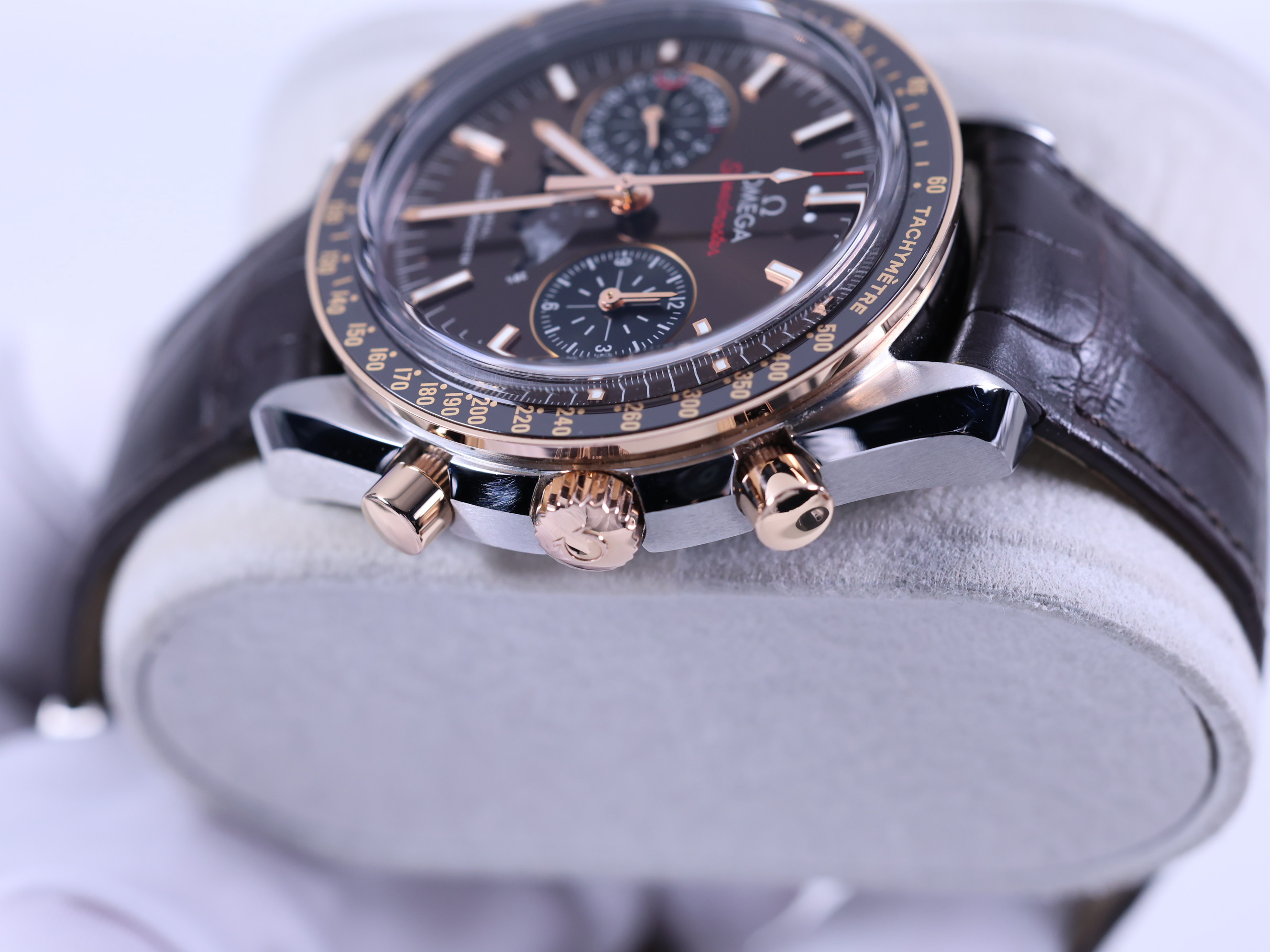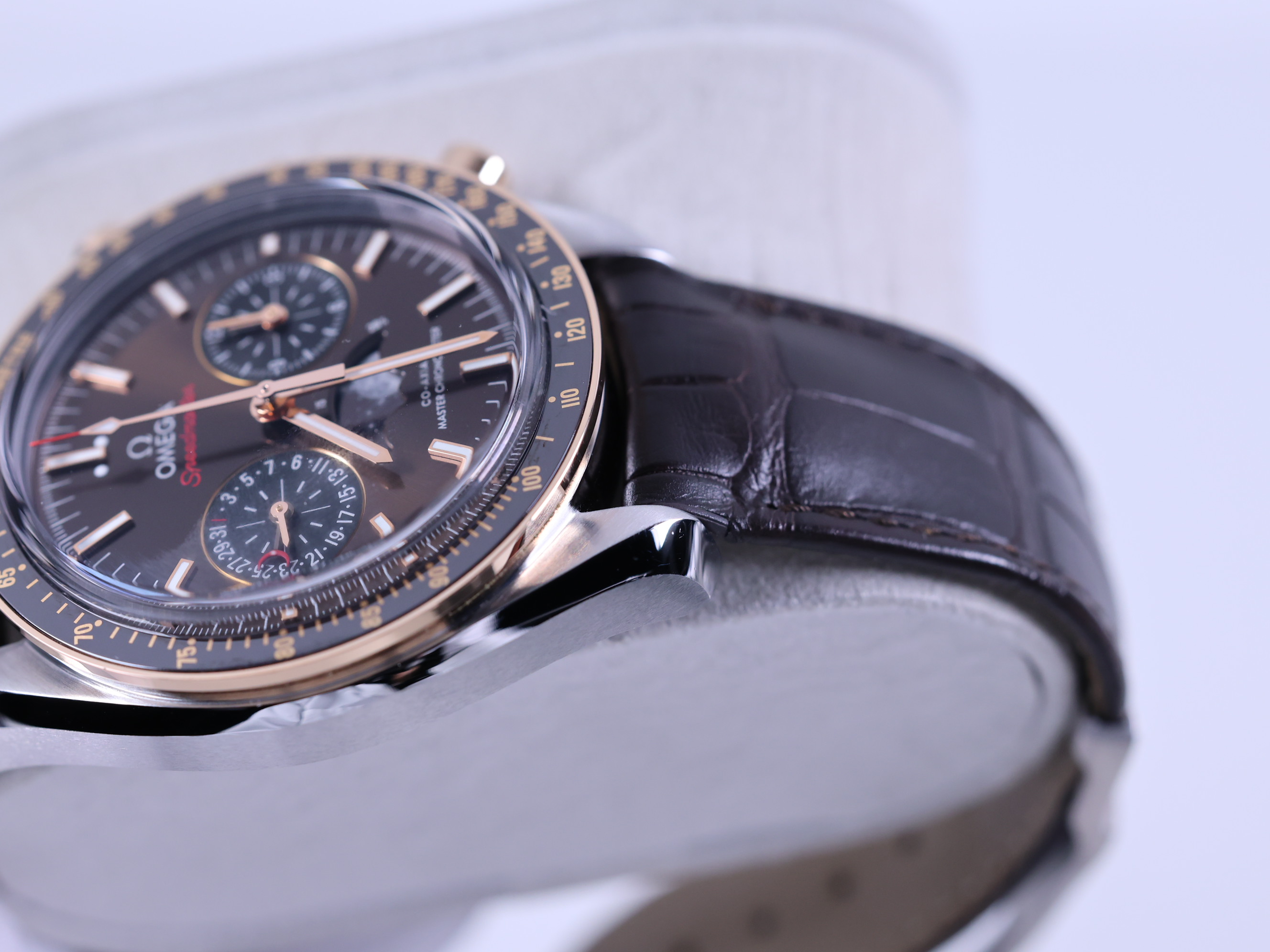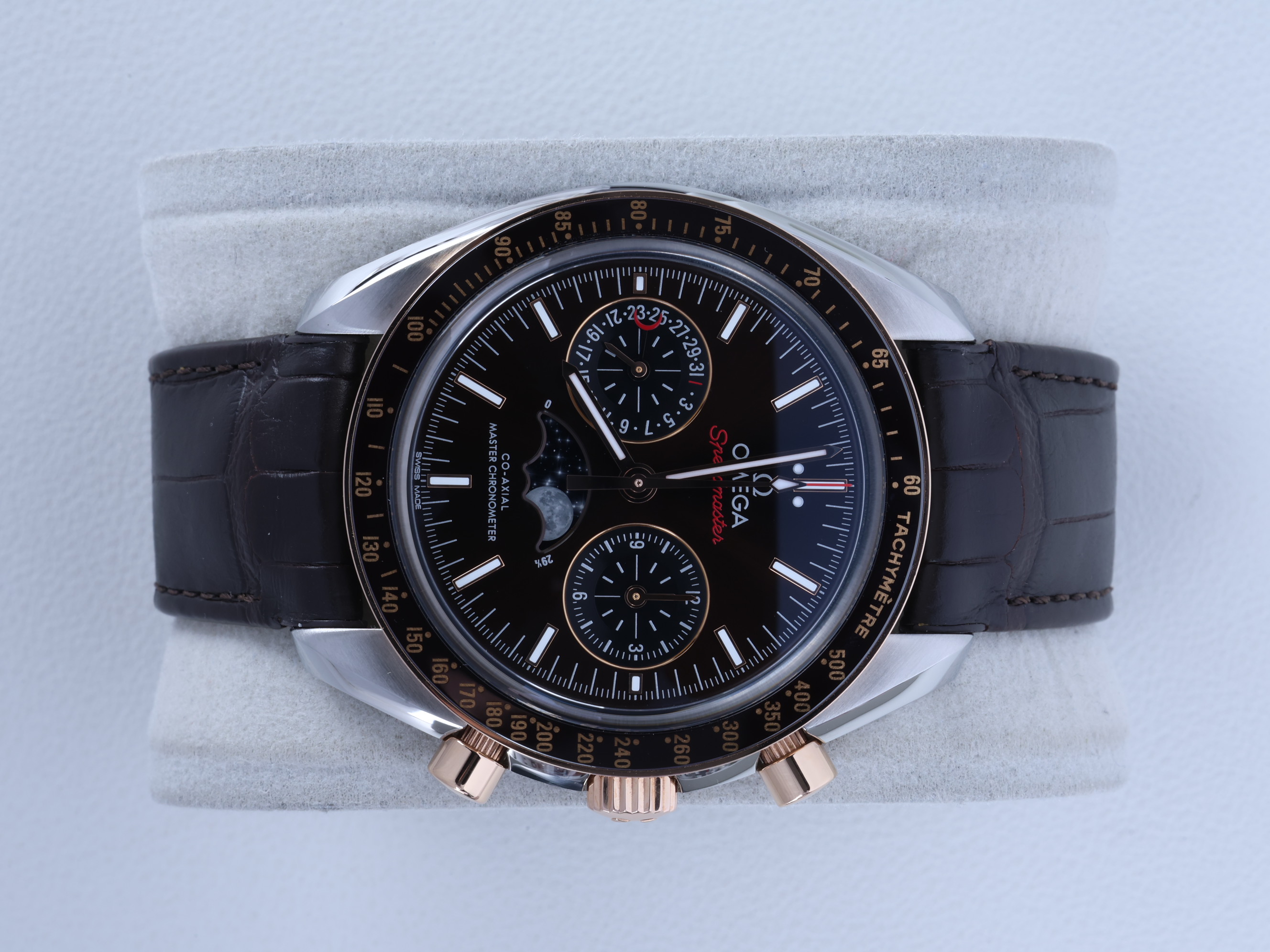 Omega Speedmaster Moonphase 304.23.44.52.13.001,Speedmaster Moonphase Brown,Speedmaster Brown Dial,오메가 스피드마스터 문페이즈 브라운,오메가 스피드마스터 문페이즈 44미리,오메가 스피드마스터 문페이즈 세라믹 베젤,브라운,타키미터,셀프와인딩,Speedmaster Moonphase,스피드마스터 문페이즈,Speedmaster,Omega,오메가,Switzerland,Rose gold,Deployant folding clasp,Date indicator with moonphase,chronograph subdial,small seconds / applied stick indices,Hour + minute + central chronograph + counter (2) + small seconds,스테인리스 스틸,셀프 와인딩,.브라운,바,디플로이언트,데이트,문페이즈,크로노그래프,투명 케이스백,21 mm,원형,레이싱,남성용,Date indicator with moonphase, chronograph subdial, small seconds / applied stick indices
