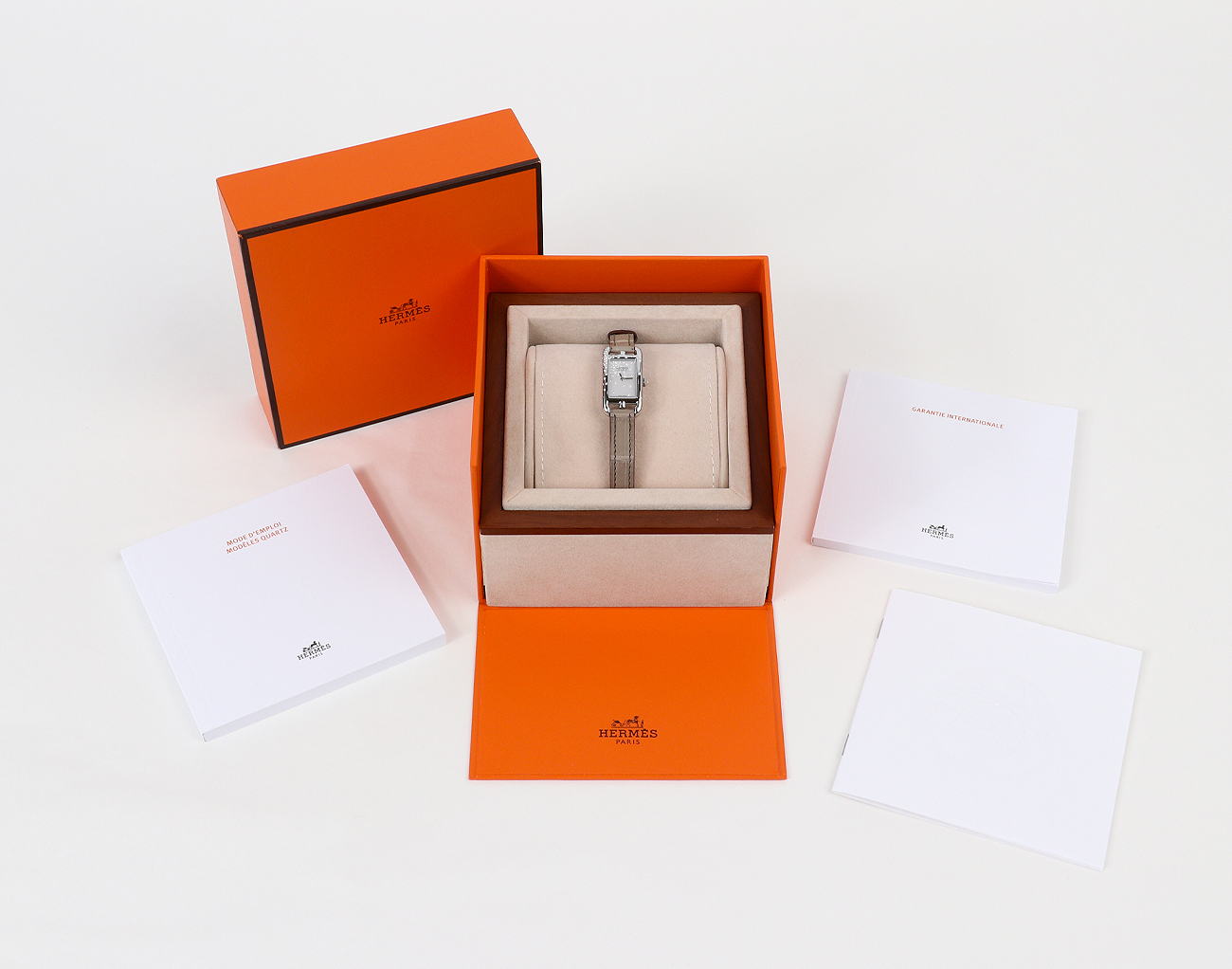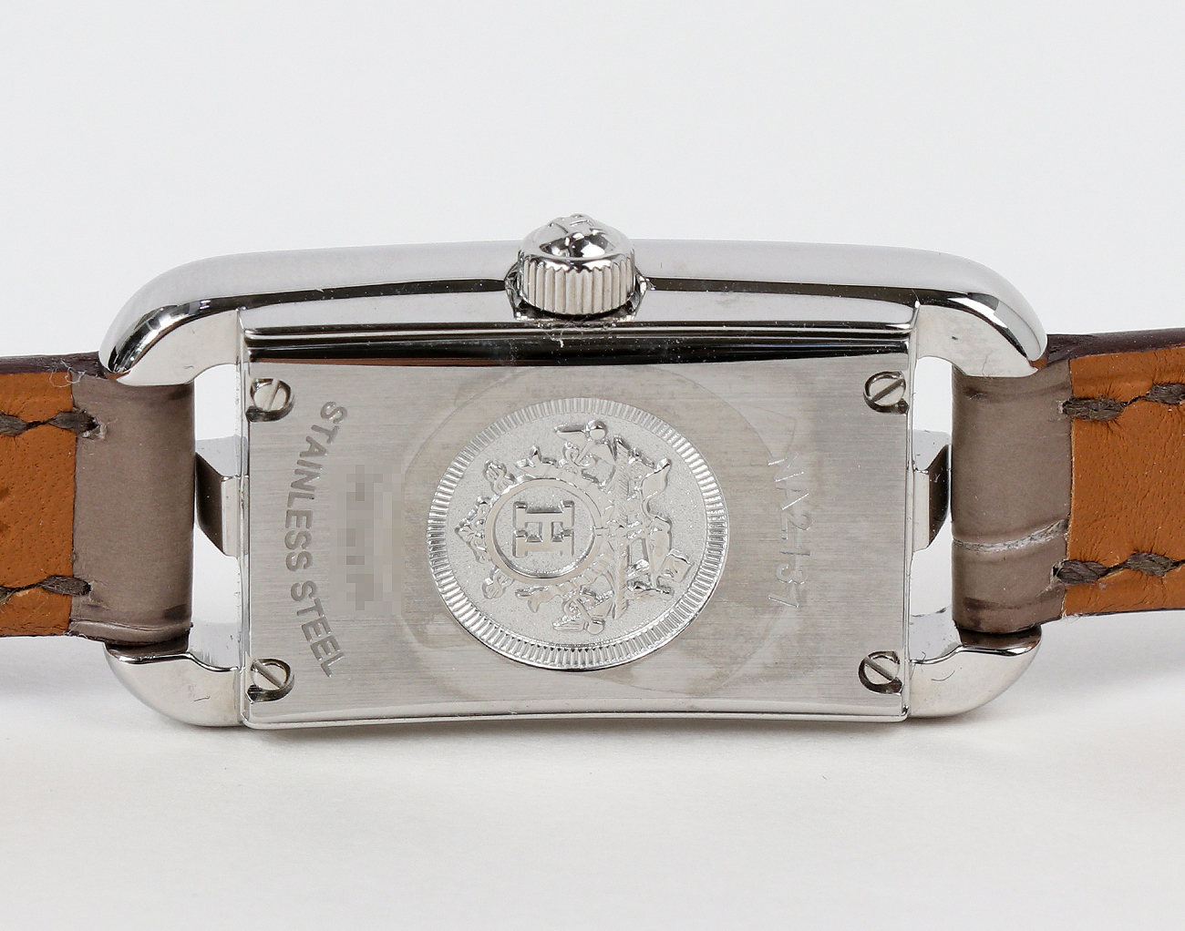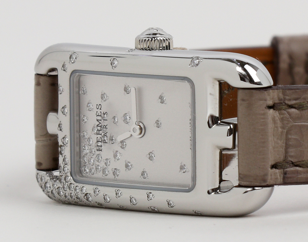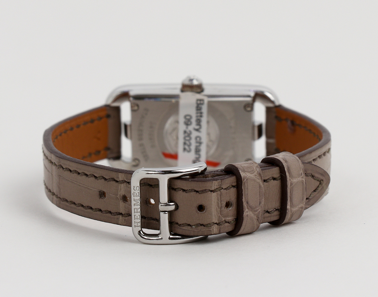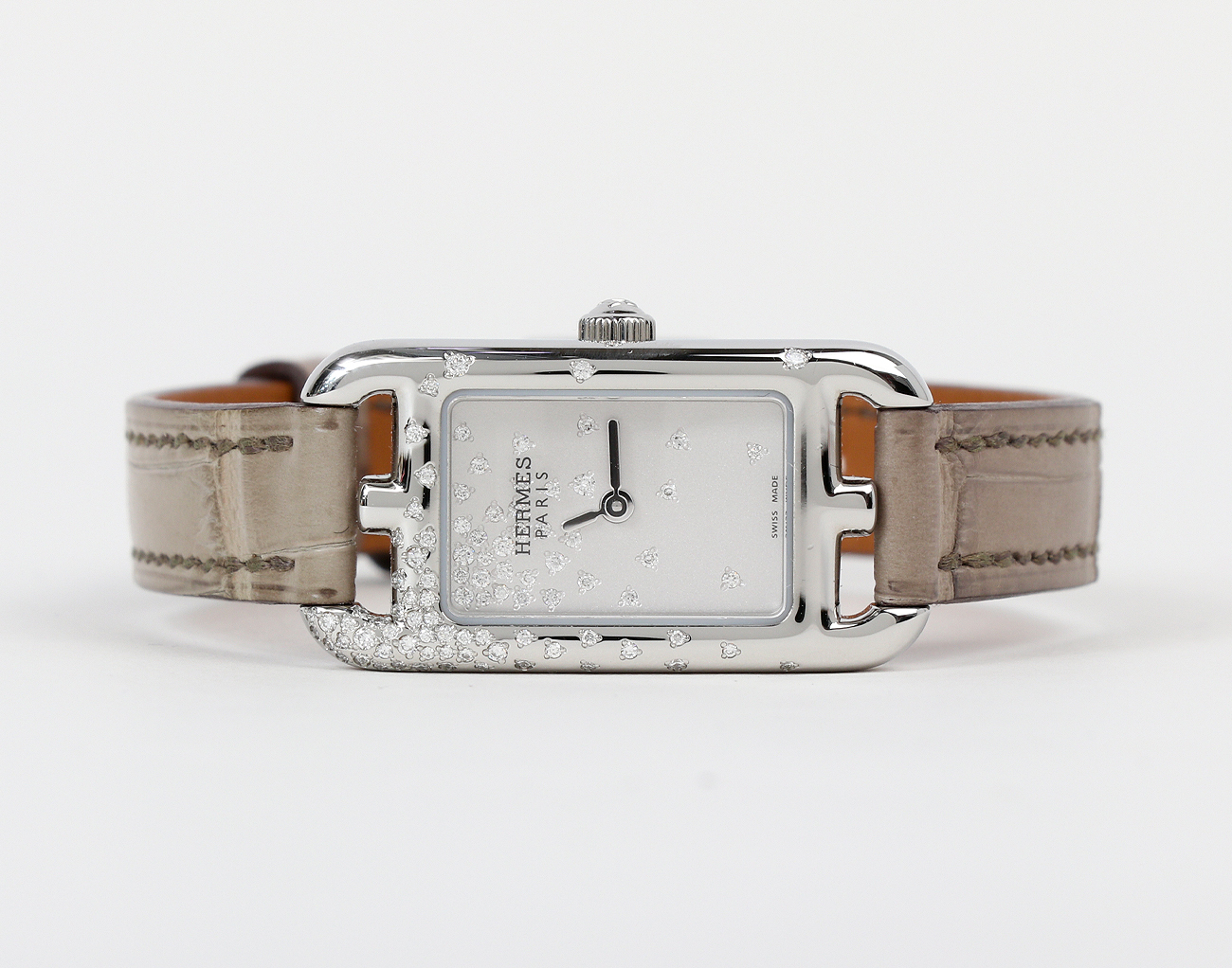 컬러 무광 엘리게이터 스킨 소재의 쇼트 스트랩이 특징입니다.쿼츠 무브먼트를 탑재한 에르메스 타임피스는 사용하지