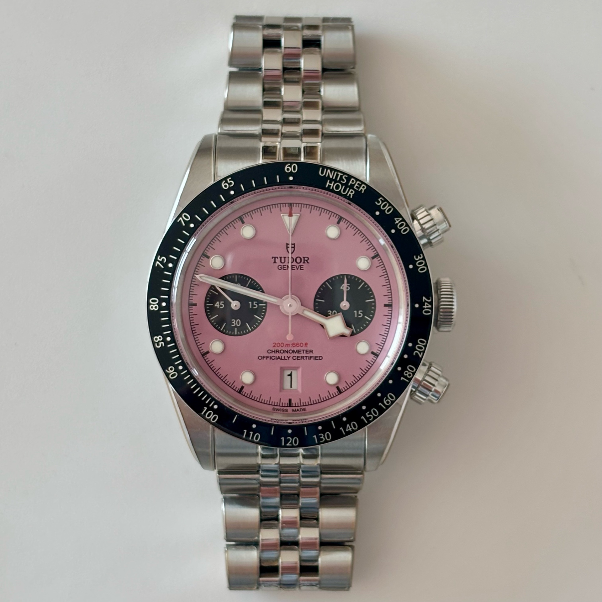 M79360N-0019,Black Bay Chrono 79360N,Tudor Black Bay Chrono Chronograph Pink Steel,튜더 블랙 베이 핑크 크로노 크로노그래프 핑크 스틸 핑크 79360N,핑크,사파이어 크리스탈,41mm,셀프와인딩,Stainless steel,Folding clasp,Date,chronograph subdial,small seconds / applied hour markers,Black Bay Chrono,블랙 베이 크로노,Tudor,튜더,셀프 와인딩,스테인리스 스틸,Date, chronograph subdial, small seconds / applied hour markers