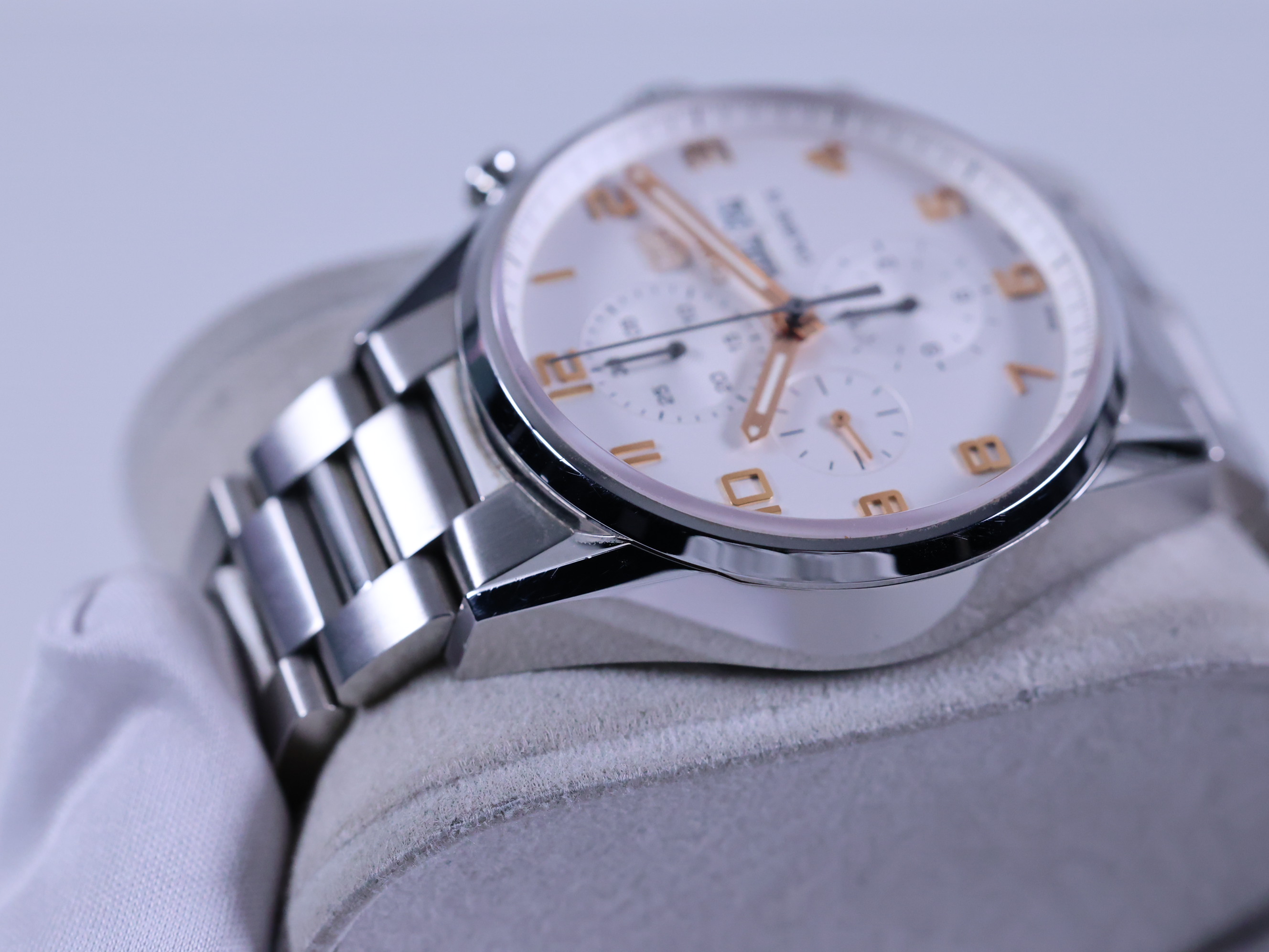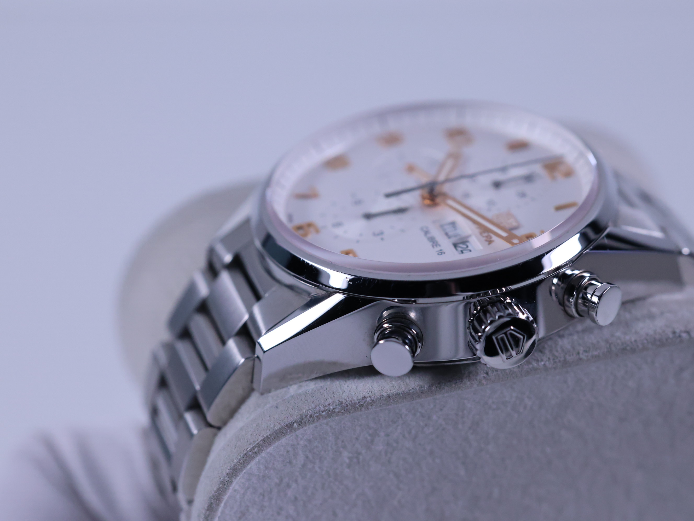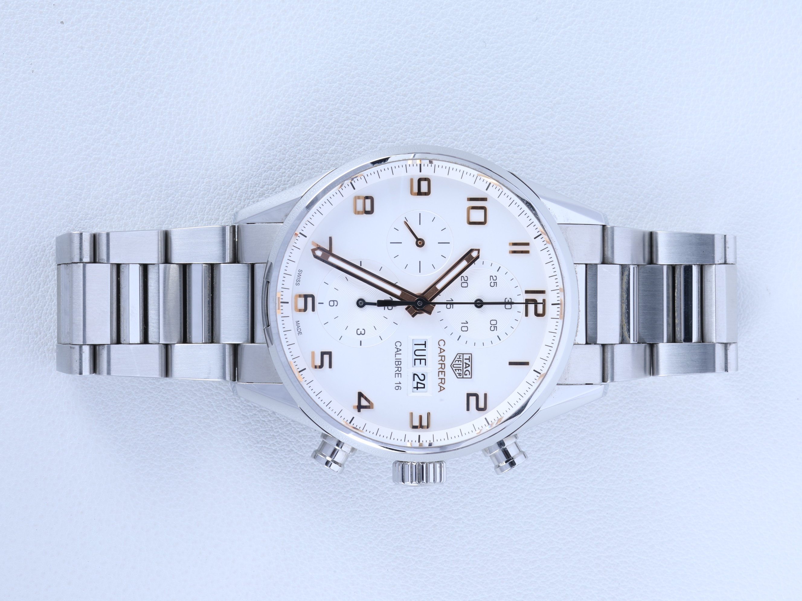 TAG Heuer Carrera Chronograph Day Date,TAG Heuer Carrera Chronograph Calibre 16,TAG Heuer Carrera Chronograph Grey,태그호이어 까레라 크로노그래프 칼리버 16,태그호이어 까레라 크로노그래프 스틸 43,태그호이어 까레라 크로노그래프 43 스틸 브레이슬릿,태그호이어 까레라 칼리버 16 크로노그래프,태그호이어 까레라 크로노그래프 스틸,태그호이어 까레라 크로노그래프,태그호이어 까레라 크로노그래프 데이데이트 그레이 화이트,CV2A1AC.BA0738,화이트,사파이어 크리스탈,43mm,셀프 와인딩,Stainless steel,Push-button folding clasp,Day-date, chronograph subdials, small seconds / applied rose gold plated arabic numeral indices,Hour + minute + small seconds + chronograph,Carrera Chronograph Day-Date Calibre 16,까레라 크로노그래프 칼리버 16,Carrera,TAG Heuer,태그 호이어