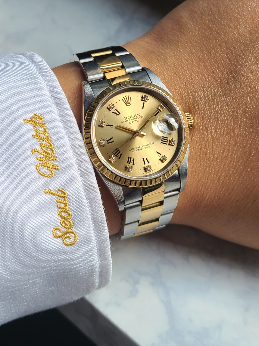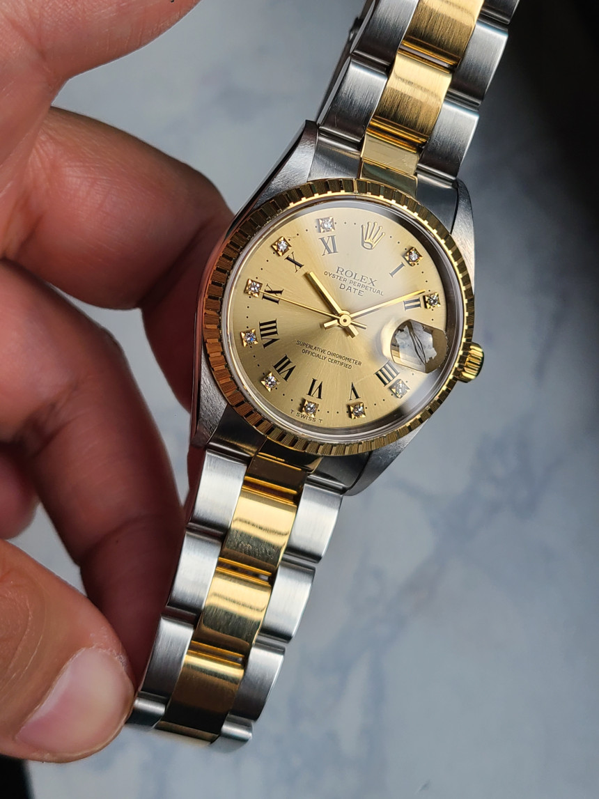 롤렉스 로렉스 오이스터 퍼페츄얼 데이트 15223 샴페인 로만 다이아 다이아몬드 오이스터,15223-CHROMDIAOYS1,15223,샴페인,스테인리스 스틸,옐로우 골드,오이스터 브레이슬릿,34mm,엔진 턴 베젤,셀프 와인딩,Cal. 3135,Switzerland,Yellow gold,Folding clasp,Date / roman numerals & diamond-set indices,Oyster Perpetual Date,오이스터 퍼페츄얼 데이트,Oyster Perpetual,Rolex,롤렉스,로만,다이아몬드 세팅,로만, 다이아몬드 세팅,스테인리스 스틸, 옐로우 골드