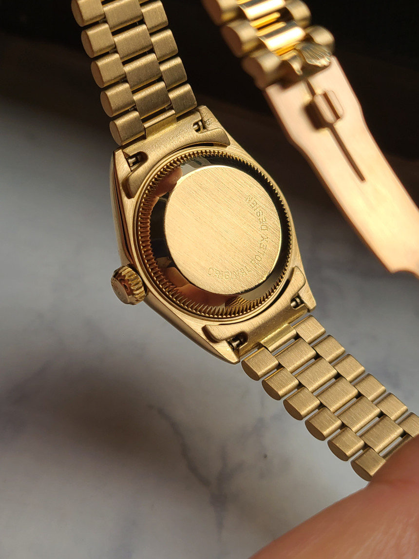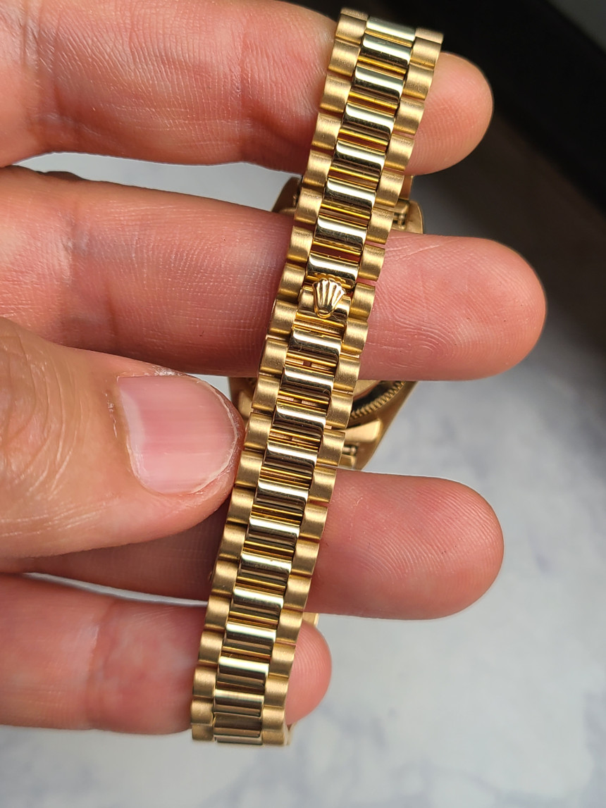 다이얼은 롤렉스의 가장 상징적인 샴페인골드 (Champagne Gold) 색상의 골드 다이얼이 적용되어 있으며, 이는 옐로우골드 소재와 가장 잘 어울리는 상징성을 지니고 있습니다. (★사진참조)