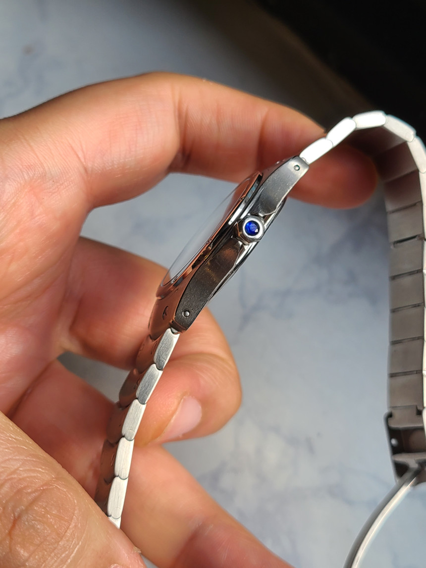 까르띠에 상징과도 같은 푸른 색상의 카보숑 (Cabochon) 블루 사파이어 보석 크라운이 들어가 있으며, 역시 귀금속 보석의 전문 분야답게 고급스러운 푸른색의 크라운 용두가 매우 시계를 한층 더 높여줍니다.