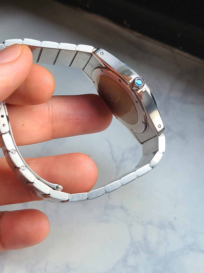 까르띠에 상징과도 같은 푸른 색상의 카보숑 (Cabochon) 블루 사파이어 보석 크라운이 들어가 있으며, 역시 귀금속 보석의 전문 분야답게 고급스러운 푸른색의 크라운 용두가 매우 시계를 한층 더 높여줍니다.