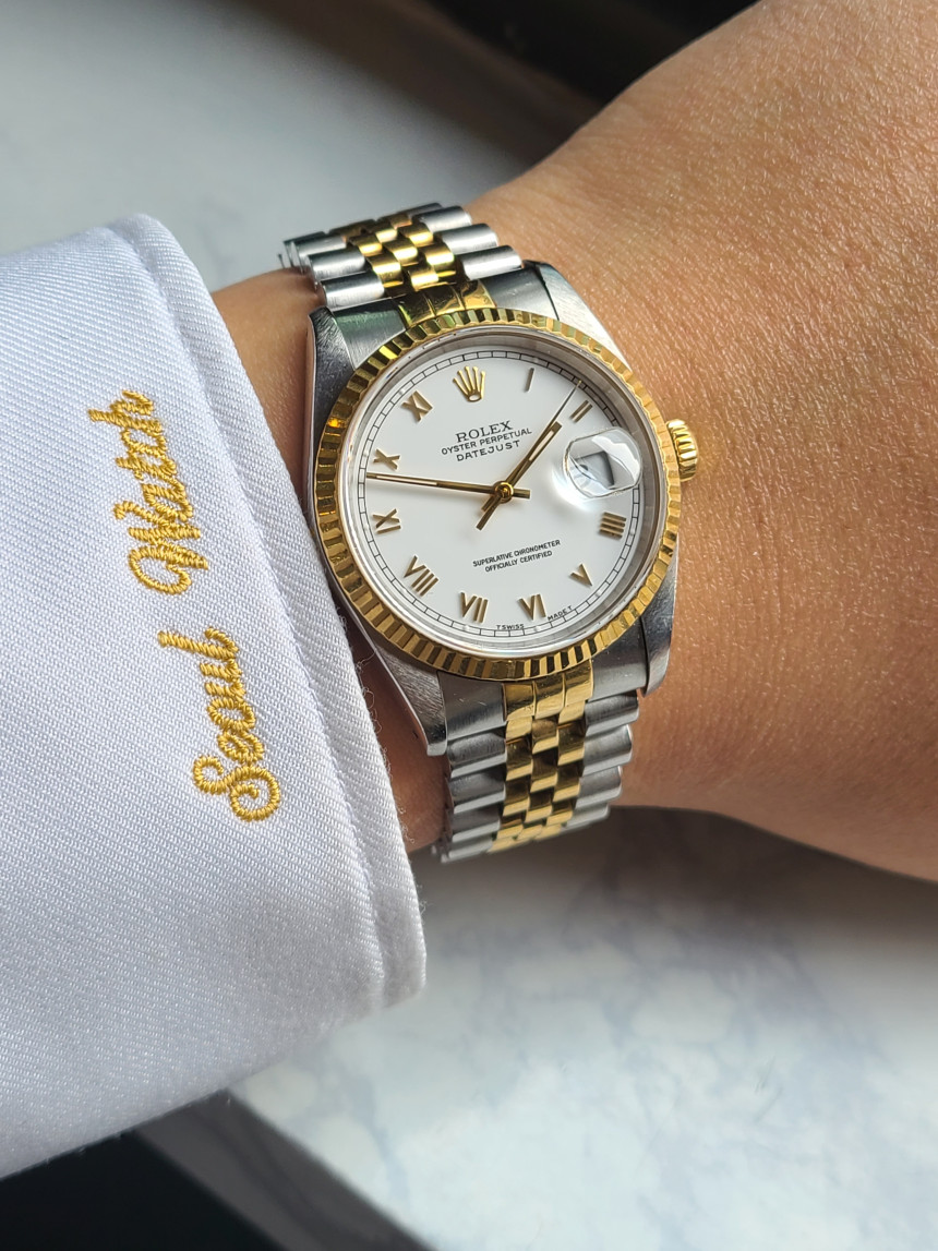 18K 옐로우골드 콤비로 구성된 디자인과 깔끔한 화이트 색상의 스키니 로만 다이얼은 최고의 조합이라 아무리 봐도 질리지 않는 조합입니다.