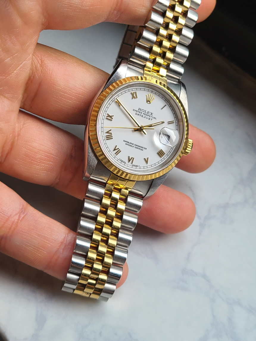 16233-WHROM1,Rolex Datejust 36 16233 Steel Yellow Gold Steel White Roman Fluted Jubilee,롤렉스 데이트저스트 36 16233 스틸 옐로우 고륻 옐골 스틸 화이트 로마 로만 플루티드 쥬빌리 16233,화이트,로만,쥬빌리 브레이슬릿,사파이어 크리스탈,36mm,옐로우 골드,플루티드,Cal. 3135,Yellow gold,Folding clasp,Date / roman numeral indices,railroad minute track,Datejust 36,데이트저스트 36,Datejust,Rolex,롤렉스,스테인리스 스틸,lume plots,스테인리스 스틸, 옐로우 골드,Date / roman numeral indices, lume plots
