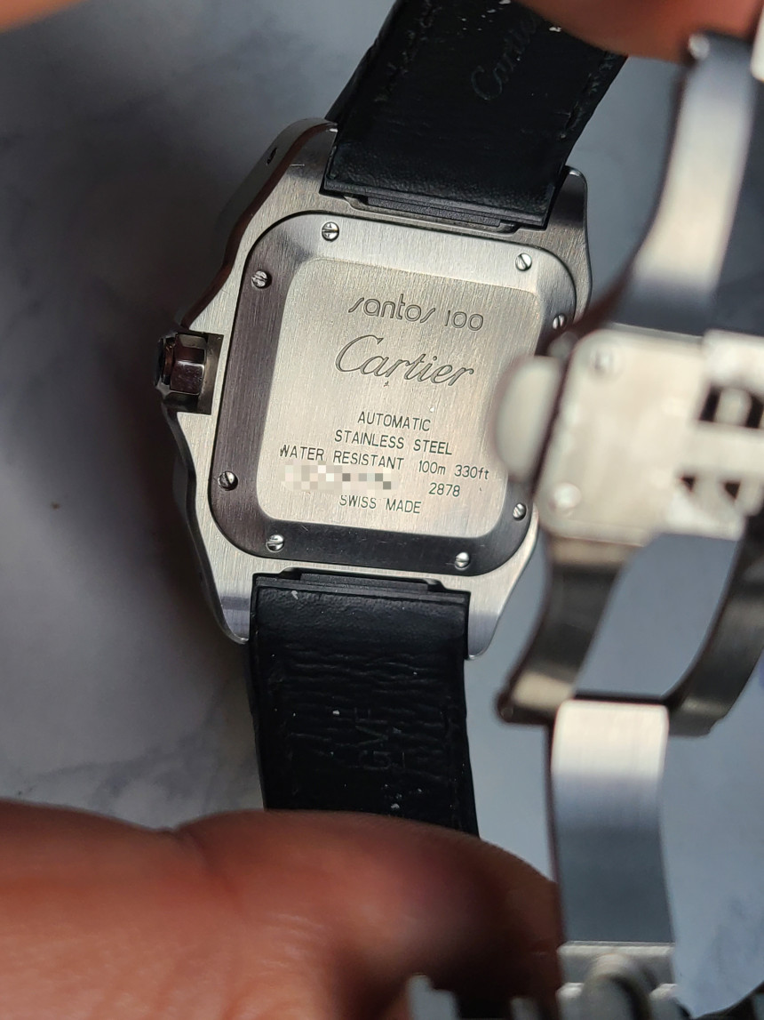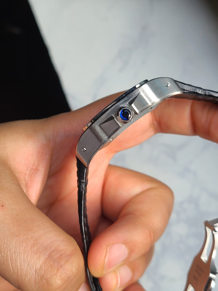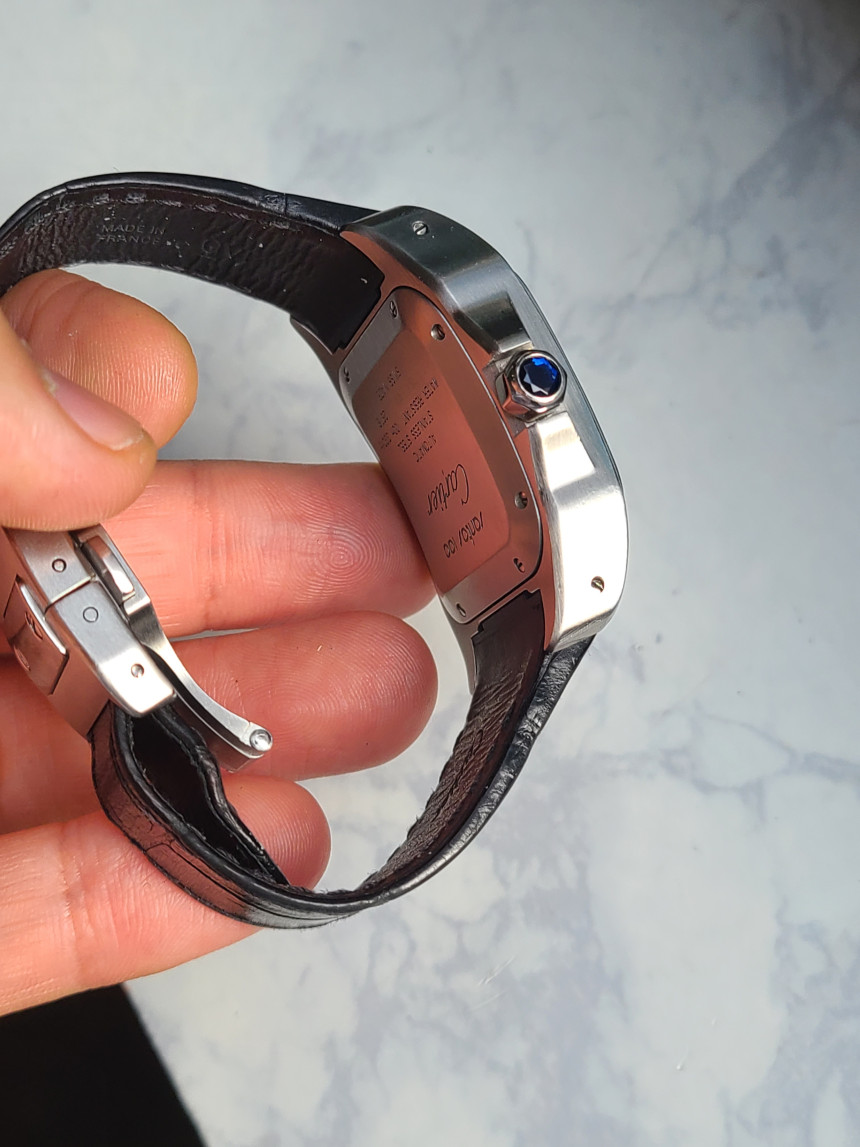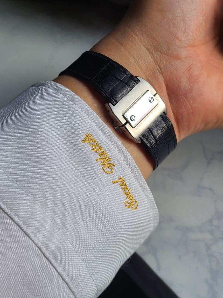 산토스 100 같은 경우 일반적인 브레이슬릿이 아닌 전용 맞춤형 엘리케이터 악어가죽 줄로 체결되어 있으며 일반 저렴한 핀버클이 아닌 까르띠에에서 가장 완성도가 높은 양방향 버터플라이 디버클이 들어갑니다.