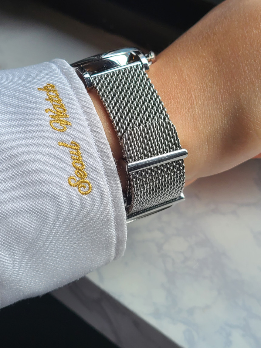 고급스러운 딥블루 색상의 컬러와 골드 색상의 인덱스 및 핸즈가 탑재된 아름다운 모델입니다. 또한 오리지널 가죽 스트랩 대신 포르토피노 전용 메쉬 브레이슬릿이 탑재되어 있는 모델입니다.