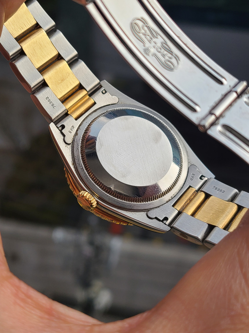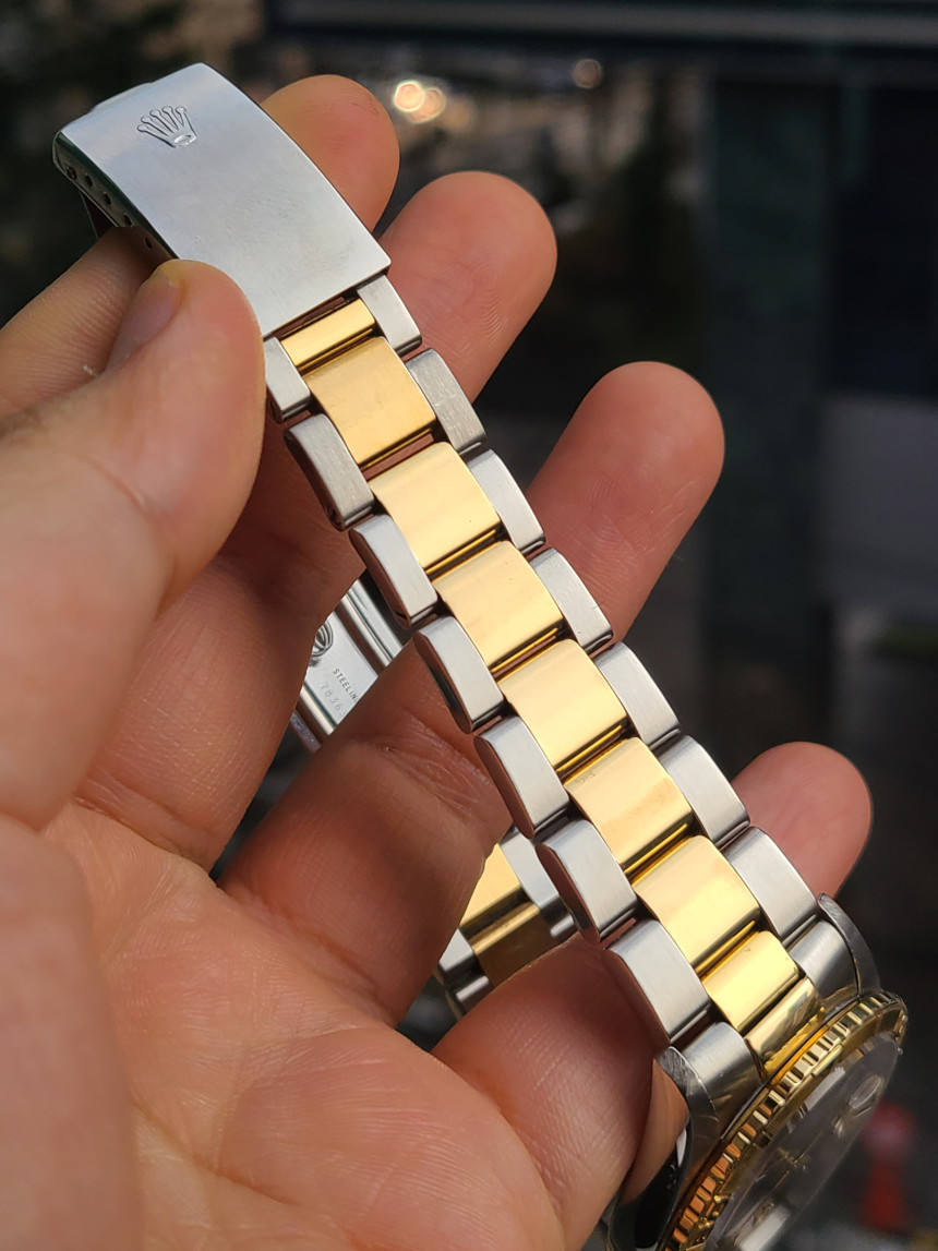 18K 옐로우골드 회전형 썬더버드 베젤과 아름다운 삼선형 콤비 브레이슬릿 조합으로 롤렉스 데이저스트 최고의 인기 모델입니다. 옐로우골드와 스틸 소재가 섞인 콤비 모델이며, 실제 금이 사용되어 출고 당시 일반 스틸보다 훨씬 고가의 모델입니다. (★사진참조)