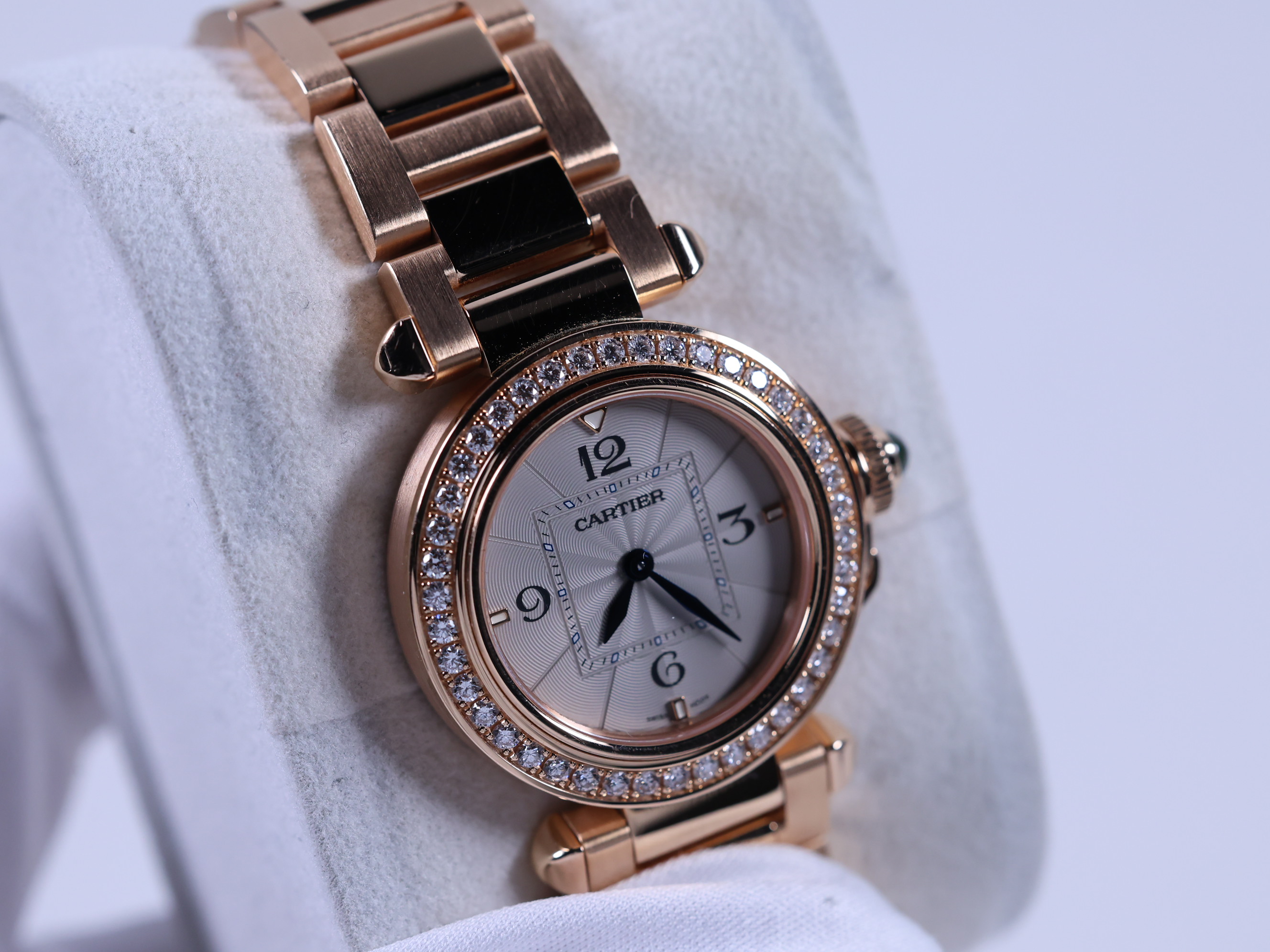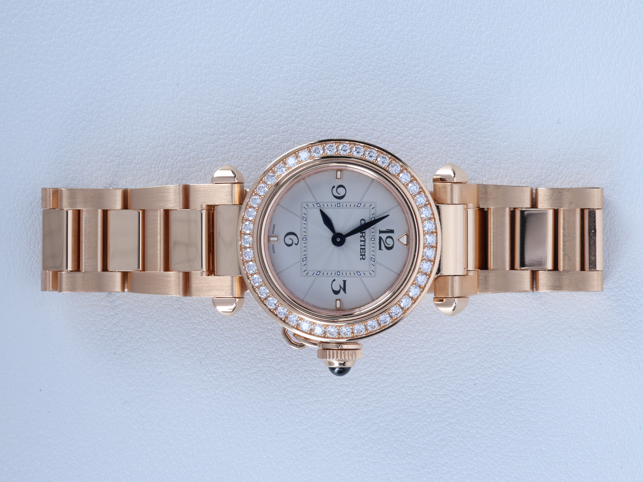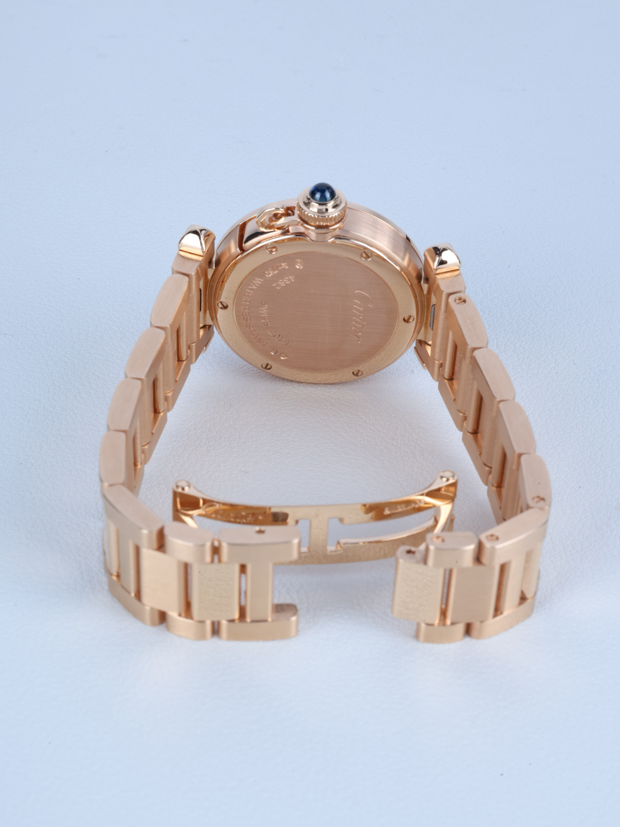WJPA0018,오팔린,아라빅,핑크 골드,30mm,다이아몬드 세팅,쿼츠,Switzerland,Pink gold + sapphire,Folding clasp,3-6-9-12 arabic numerals & hour markers,Pasha de Cartier,파샤 드 까르띠에 워치,Cartier,까르띠에,.화이트,아라빅,폴딩 클라스프,원형,클래식,여성용