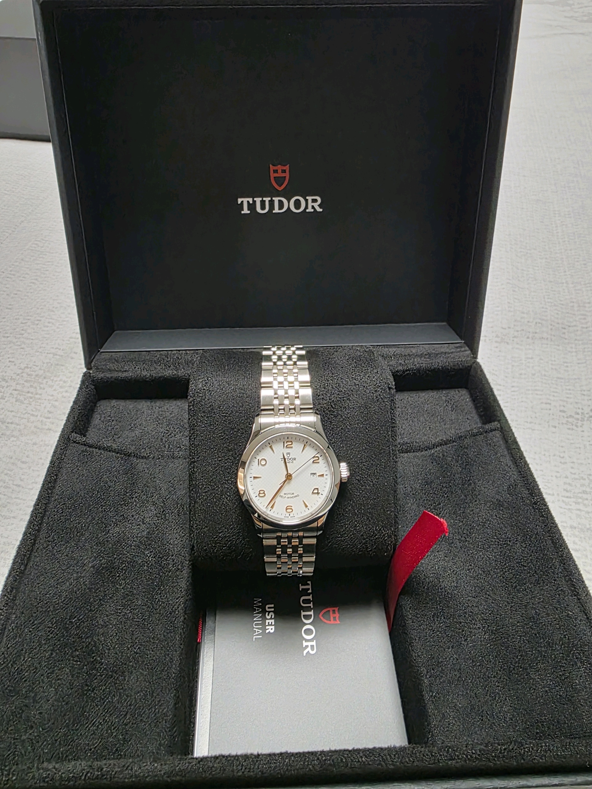 M91350-0011, Tudor 1926 28mm 91350 steel,튜더 1926 28미리 28mm 91350 스테인리스 스틸 화이트 아라빅,화이트,아라빅,스테인리스 스틸,브레이슬릿,28mm,스무스 베젤,셀프 와인딩,Cal. T201,Switzerland,Stainless steel,Folding clasp,Date / applied arabic & dagger indices,1926,Tudor,튜더,.화이트,아라빅,패턴,폴딩 클라스프,데이트,15mm,원형,클래식,여성용
