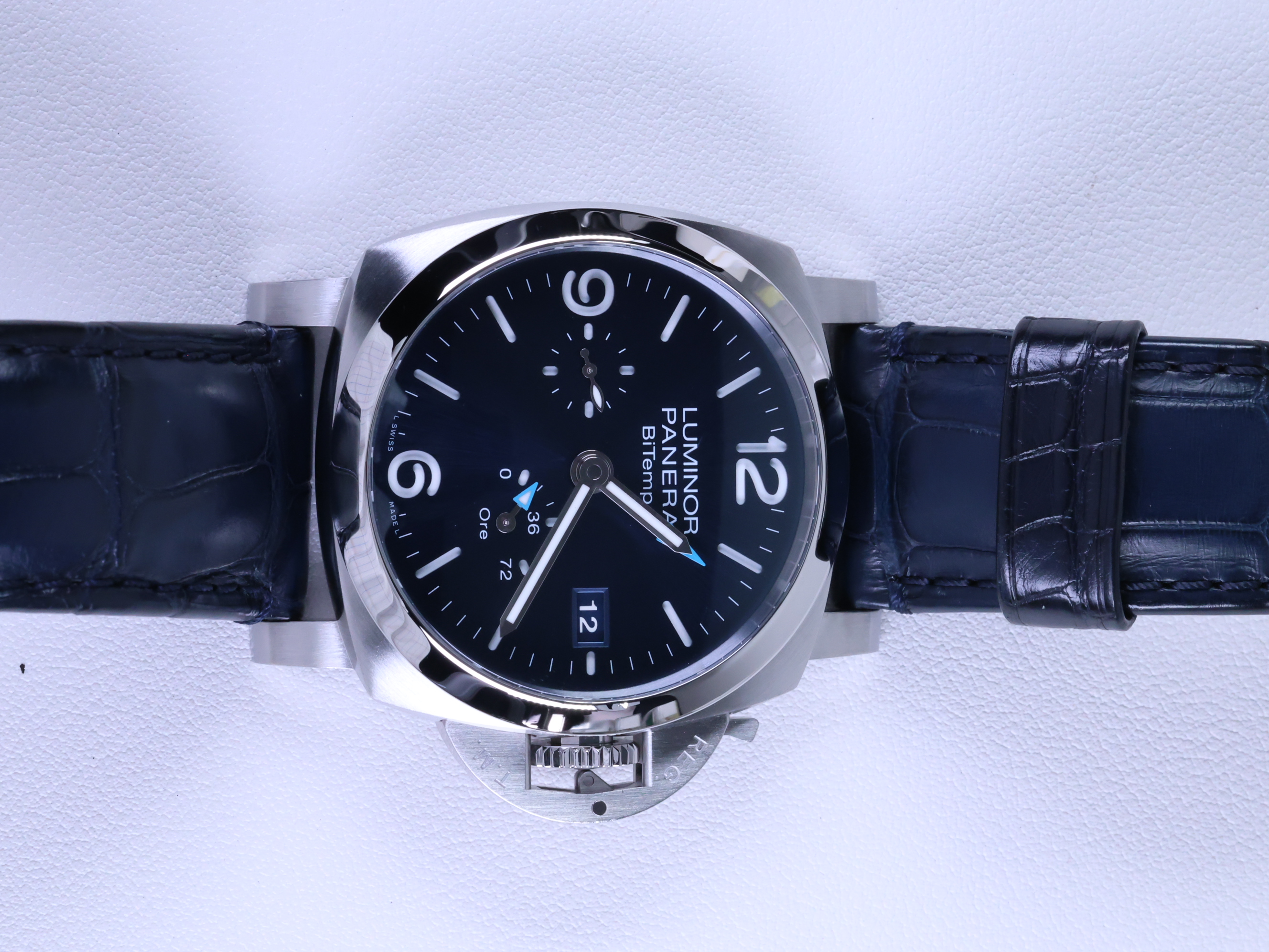 PAM01361 PAM1361 PAM 1361,Panerai Luminor BiTempo Power Reserve GMT steel blue steel GMT,파네라이 루미노르 바이템포 비템포 파워리저브 파워 리저브 GMT 스틸 블루 스틸 다이빙 다이버 시스루백 씨스루백 시스루 백 씨스루 백 투명 사파이어 케이스백,PAM01361,블루,스테인리스 스틸,가죽,스트랩,44mm,셀프 와인딩,Cal. P.9012,Switzerland,Stainless steel,Pin buckle,Date,GMT,power reserve,small seconds / engraved hour markers,Luminor BiTempo Power Reserve,루미노르 비템포 파워 리저브,Luminor,Panerai,파네라이,Date, GMT, power reserve, small seconds / engraved hour markers