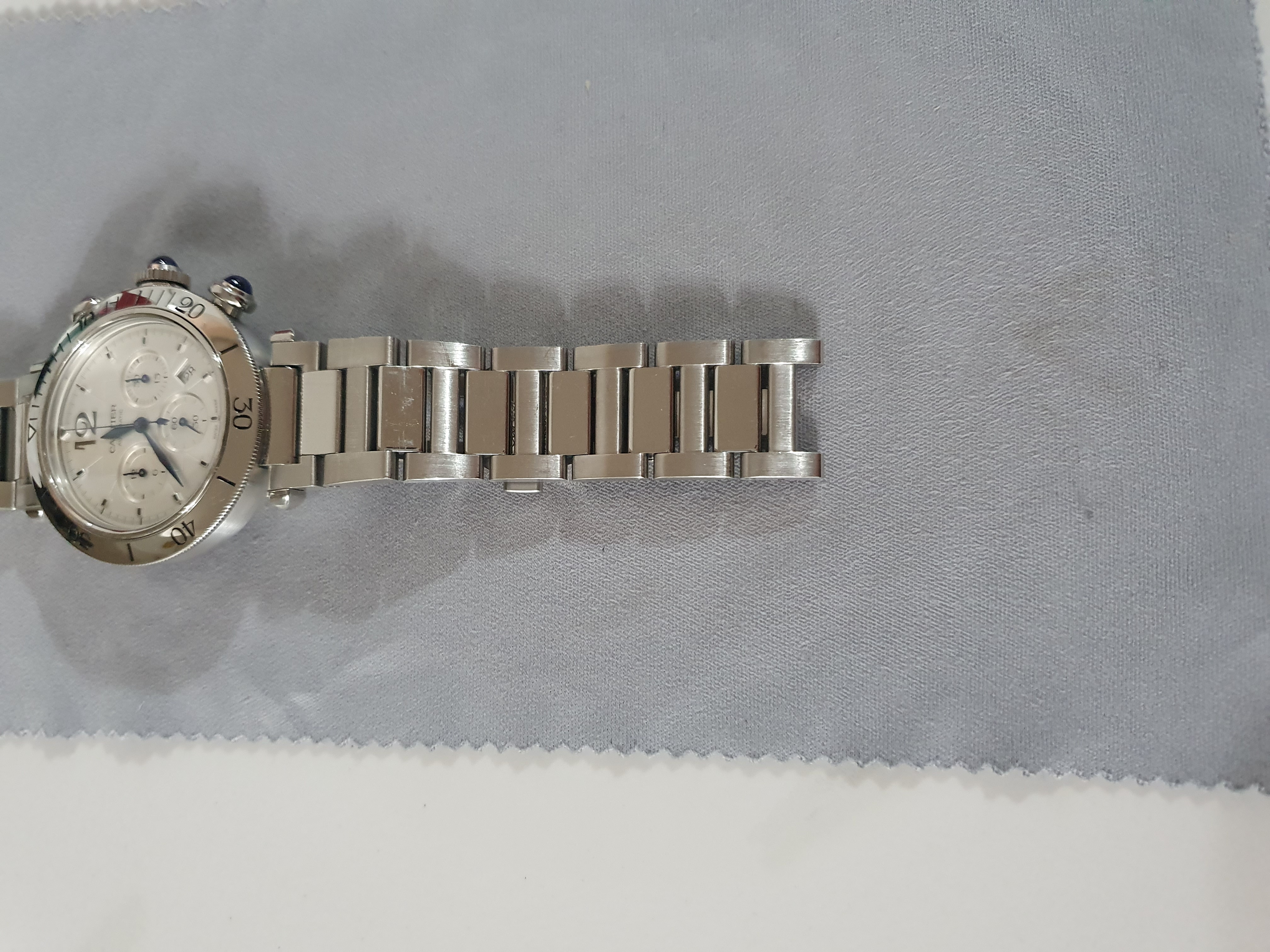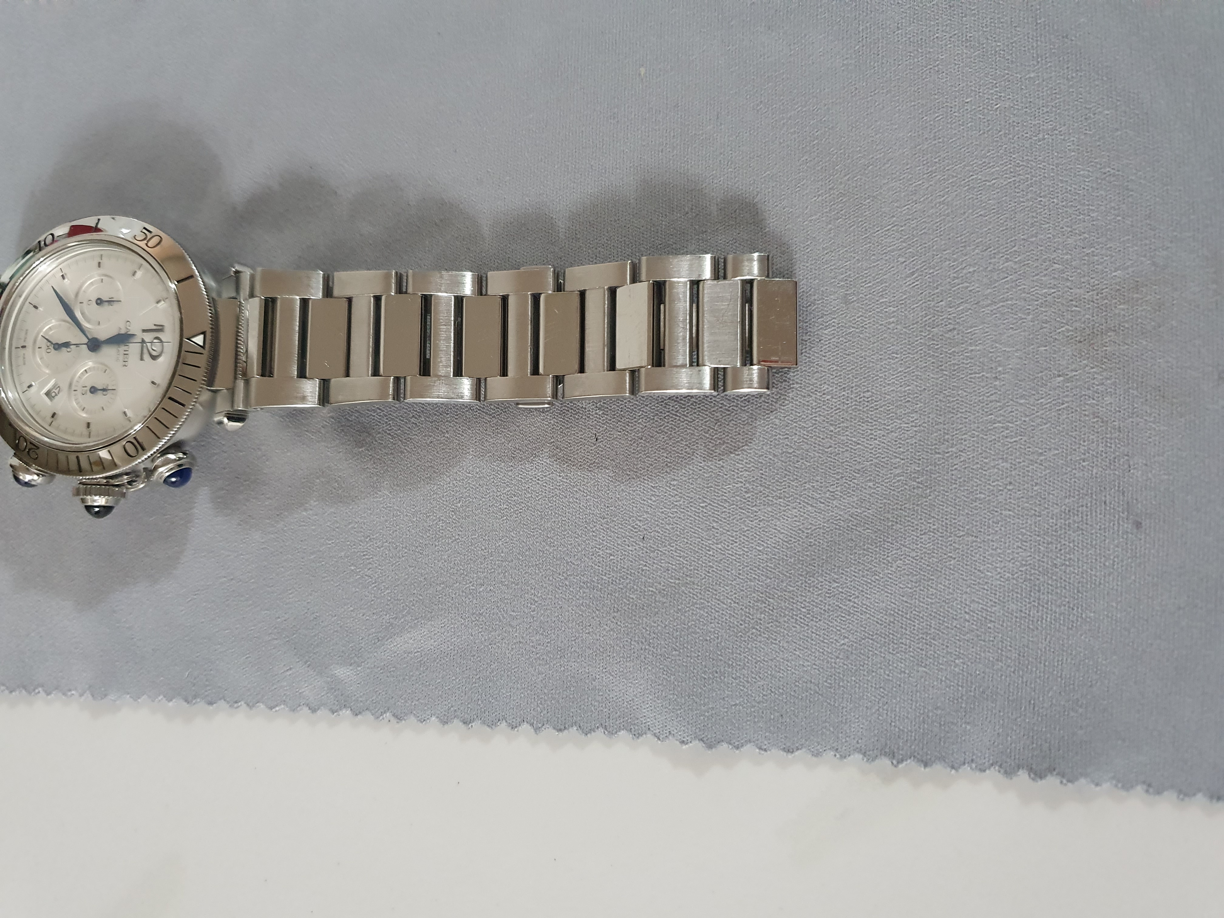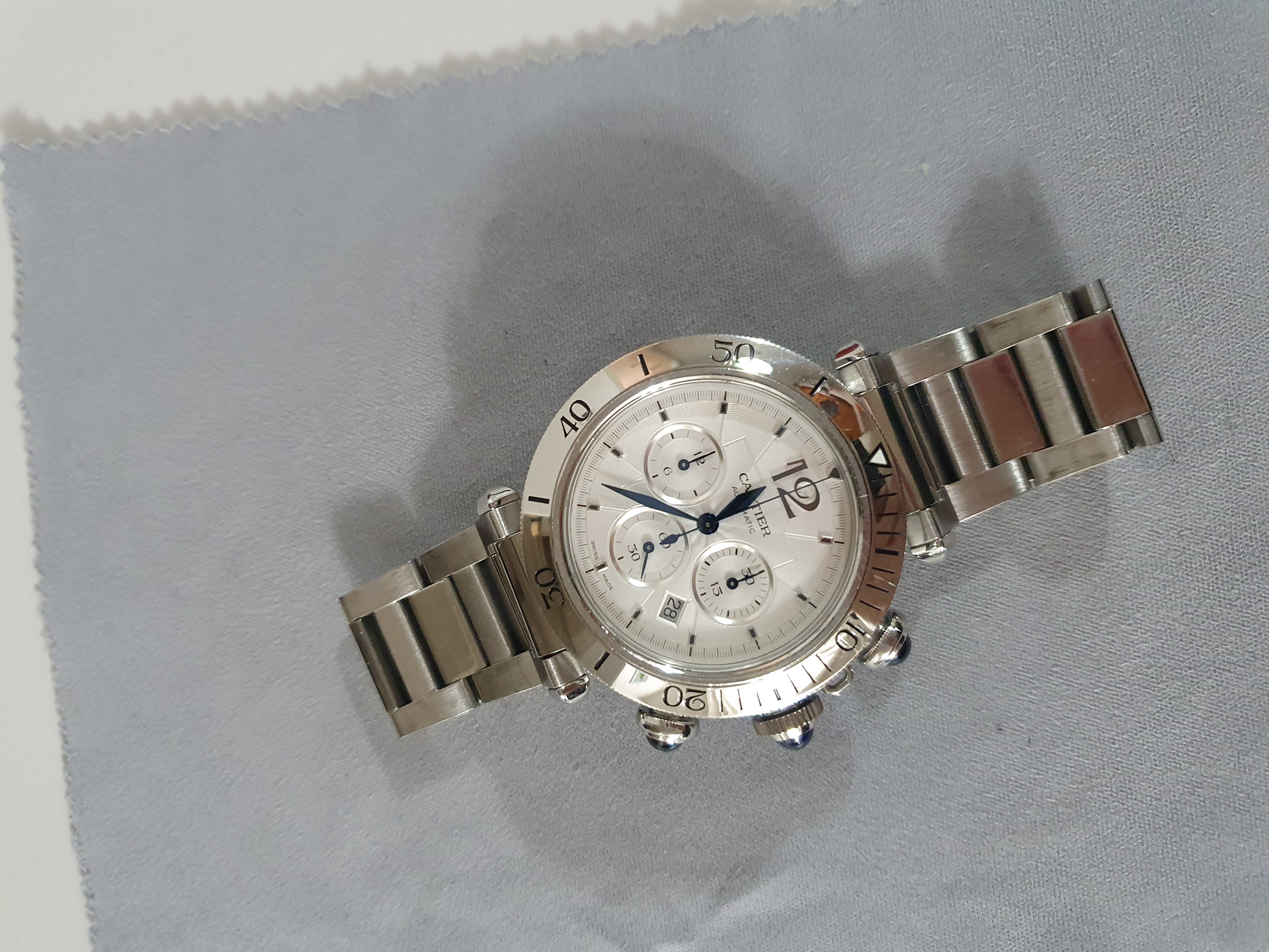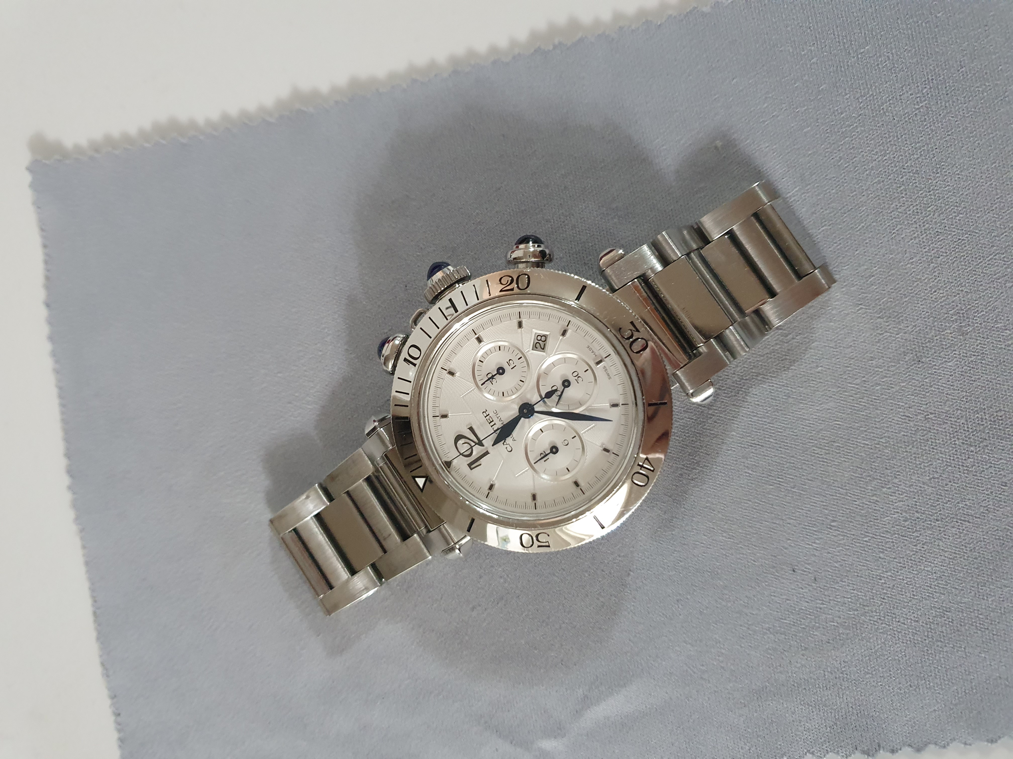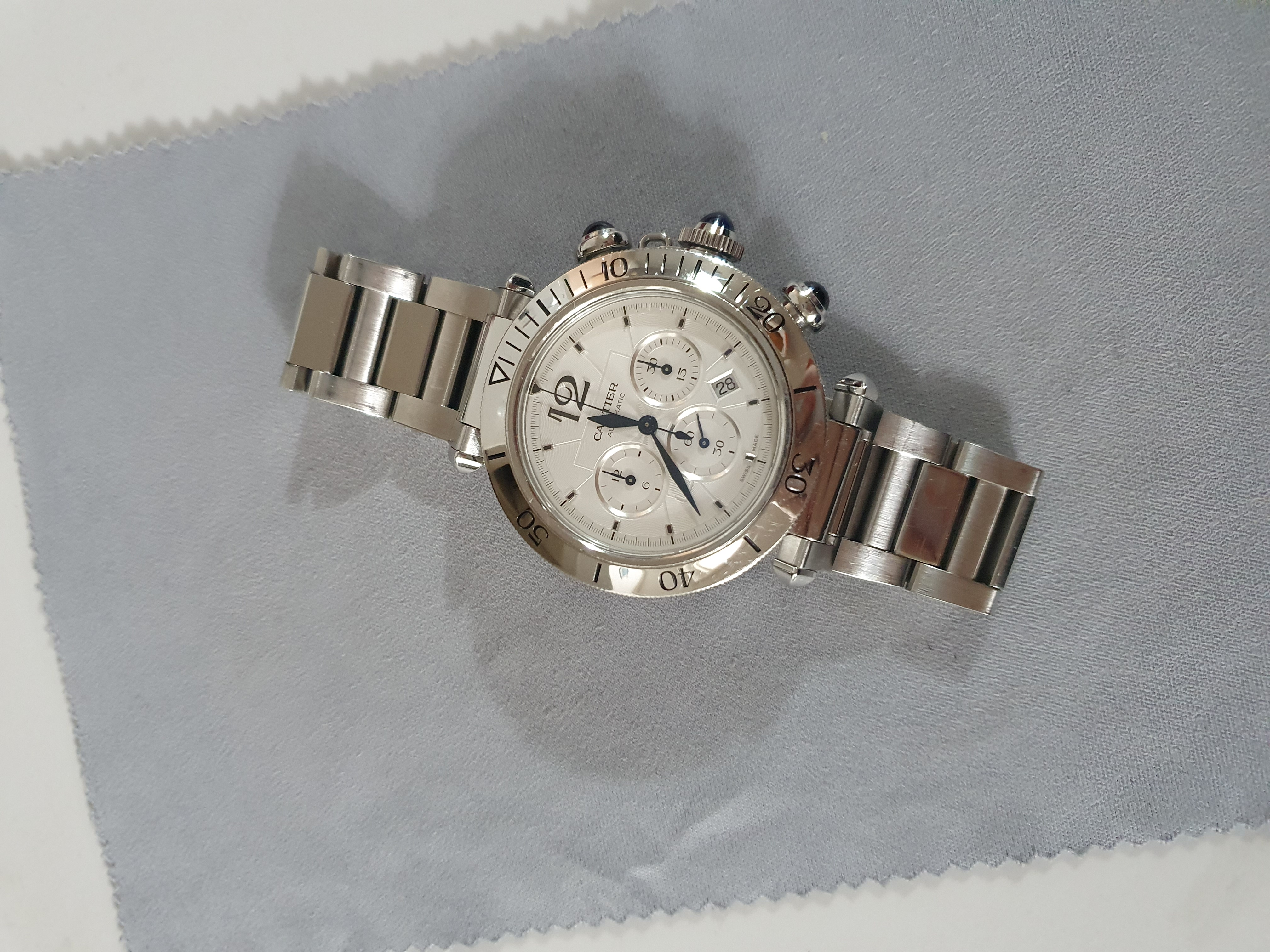 Cartier Pasha Chronograph WSPA0018,까르띠에 파샤 크로노그래프,카르띠에 파샤 크로노그래프,카르티에 파샤 크로노그래프,까르띠에 파샤 크로노 41미리,까르띠에 파샤 크로노그래프 스틸,까르띠에 파샤 스틸 크로노그래프,까르띠에 파샤 WSPA0018,실버,사파이어 크리스탈,41mm,스테인리스 스틸,셀프와인딩,Pasha Chronograph,파샤 크로노그래프,Pasha de Cartier,Cartier,까르띠에,Stainless steel + spinel,Butterfly clasp,Date,chronograph subdials,small seconds / applied hour markers,셀프 와인딩,Date, chronograph subdials, small seconds / applied hour markers,.실버,폴딩 클라스프,크로노그래프, 데이트,원형,클래식,남성용