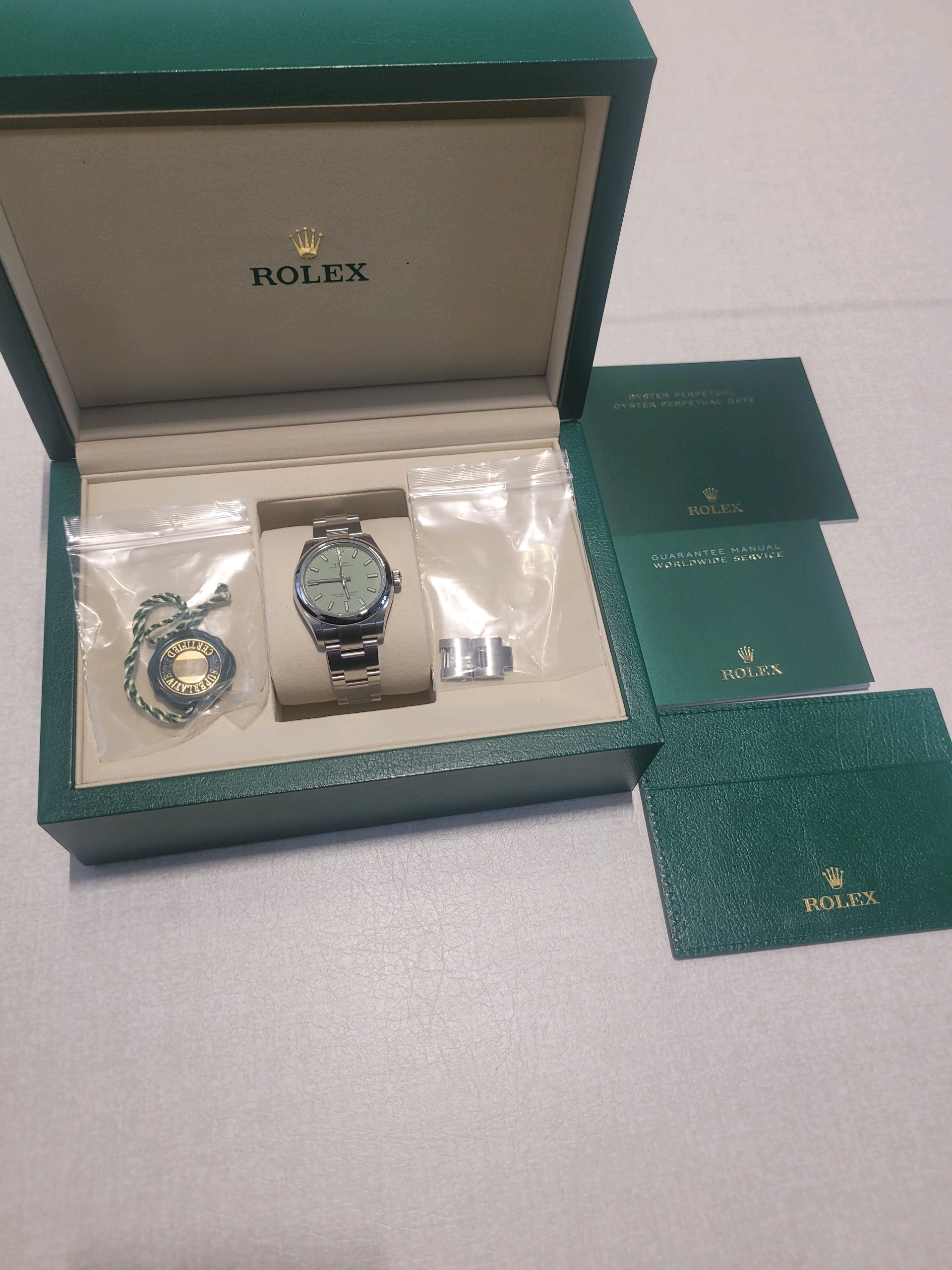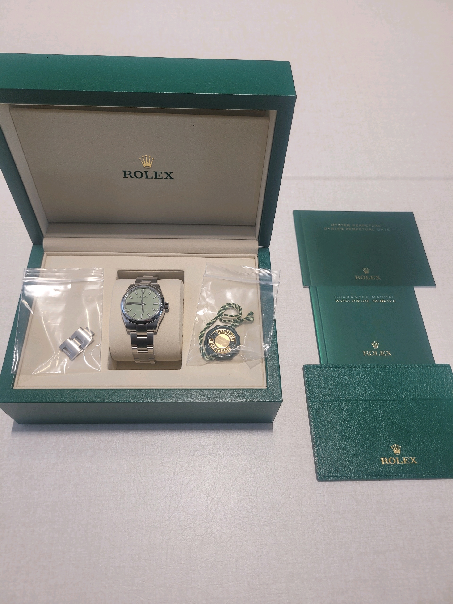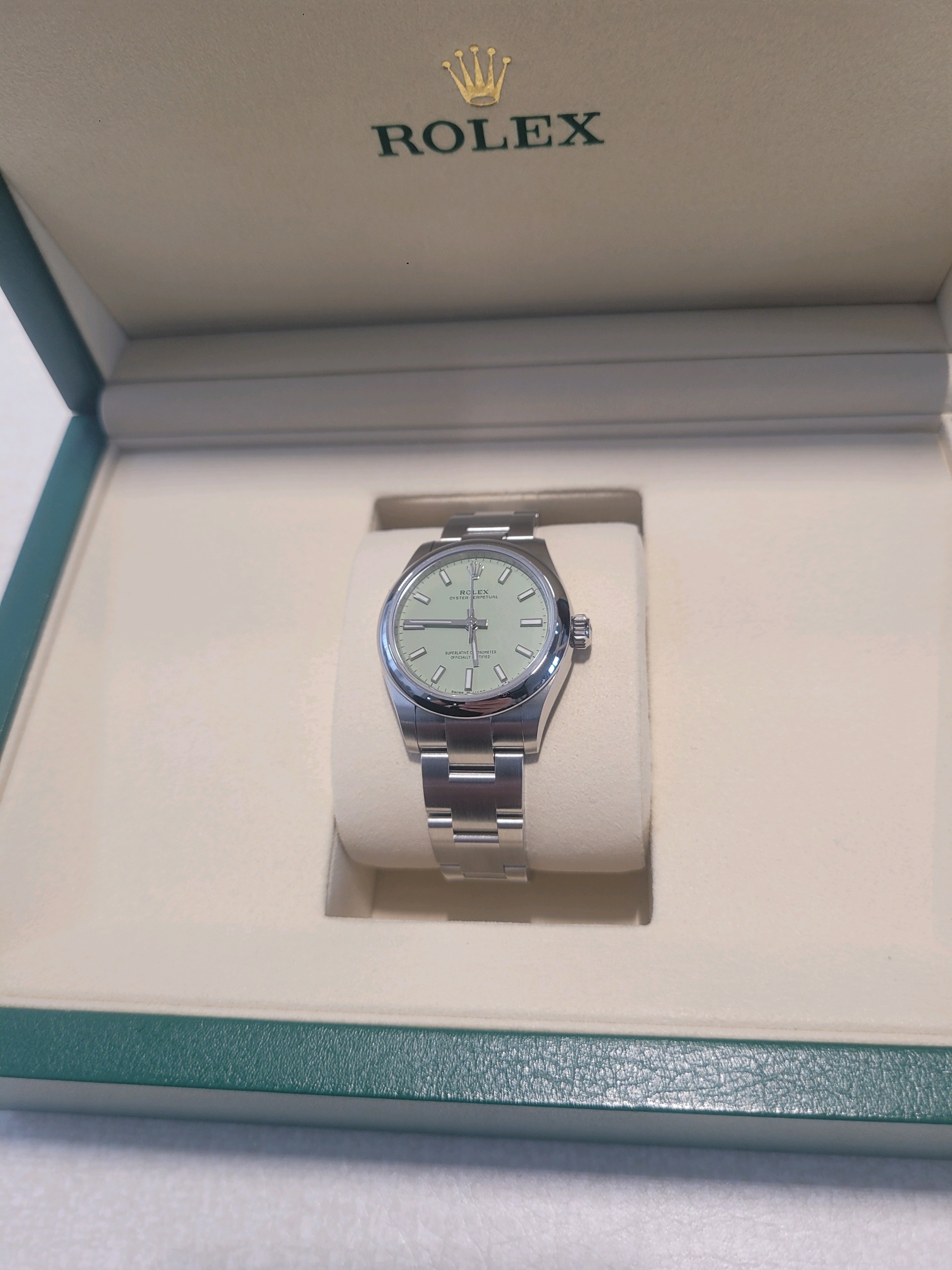 277200,Rolex Oyster Perpetual OP 31 pistachio green 31mm 277200,롤렉스 로렉스 오이스터 퍼페추얼 퍼페츄얼 오피 op 31 피스타치오 그린 31mm 277200,피스타치오,그린,초록,초록색,M277200-0012,스테인리스 스틸,오이스터 브레이슬릿,31mm,돔드,셀프 와인딩,Cal. 2232,Stainless steel,Folding clasp,Baton indices,Oyster Perpetual 31,오이스터 퍼페츄얼 31,Oyster Perpetual,Rolex,롤렉스