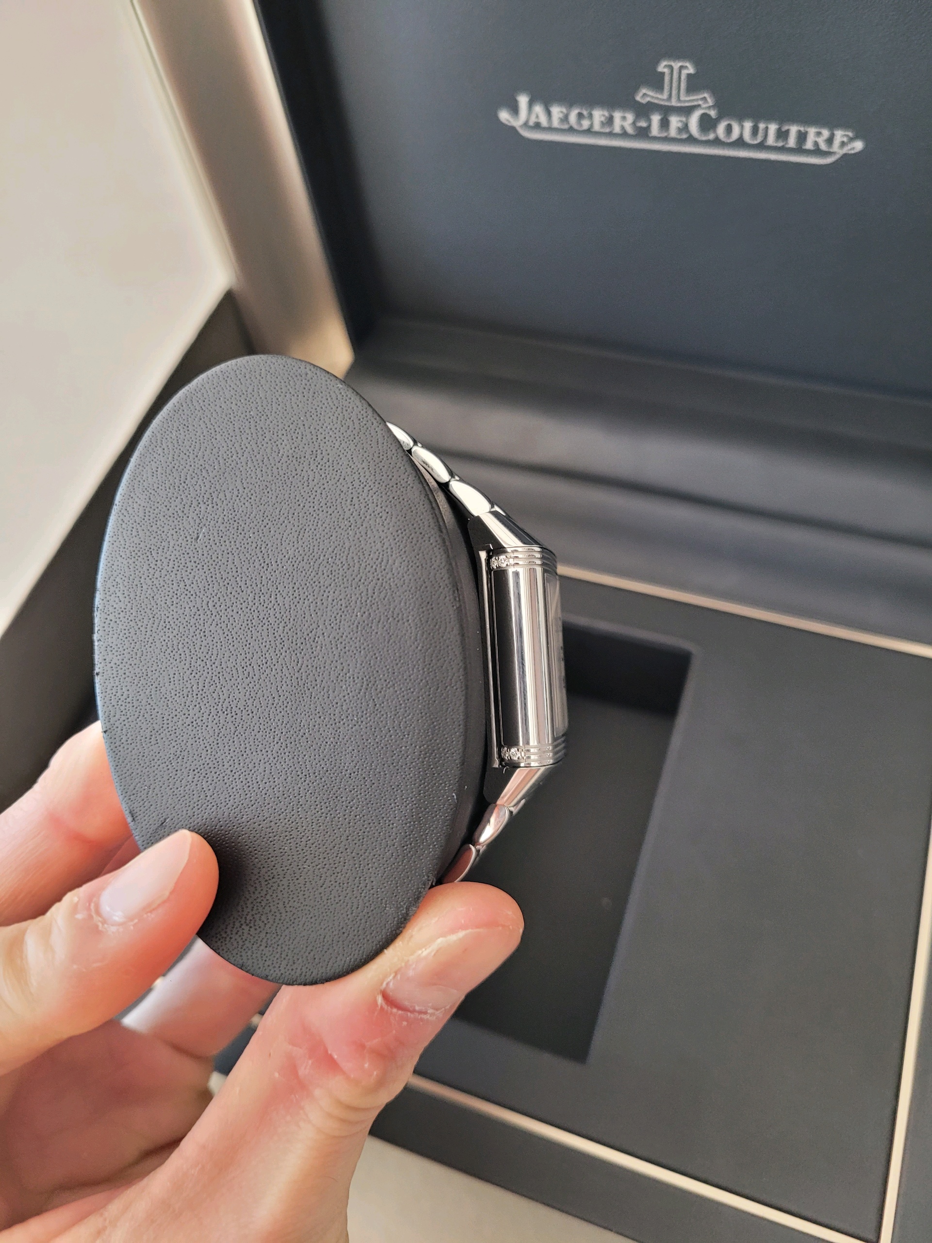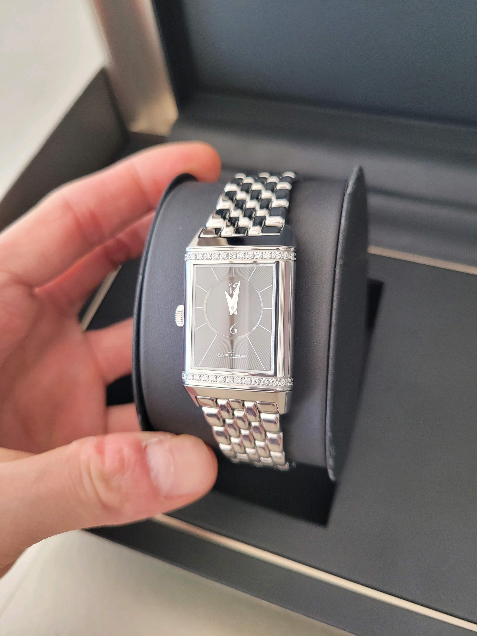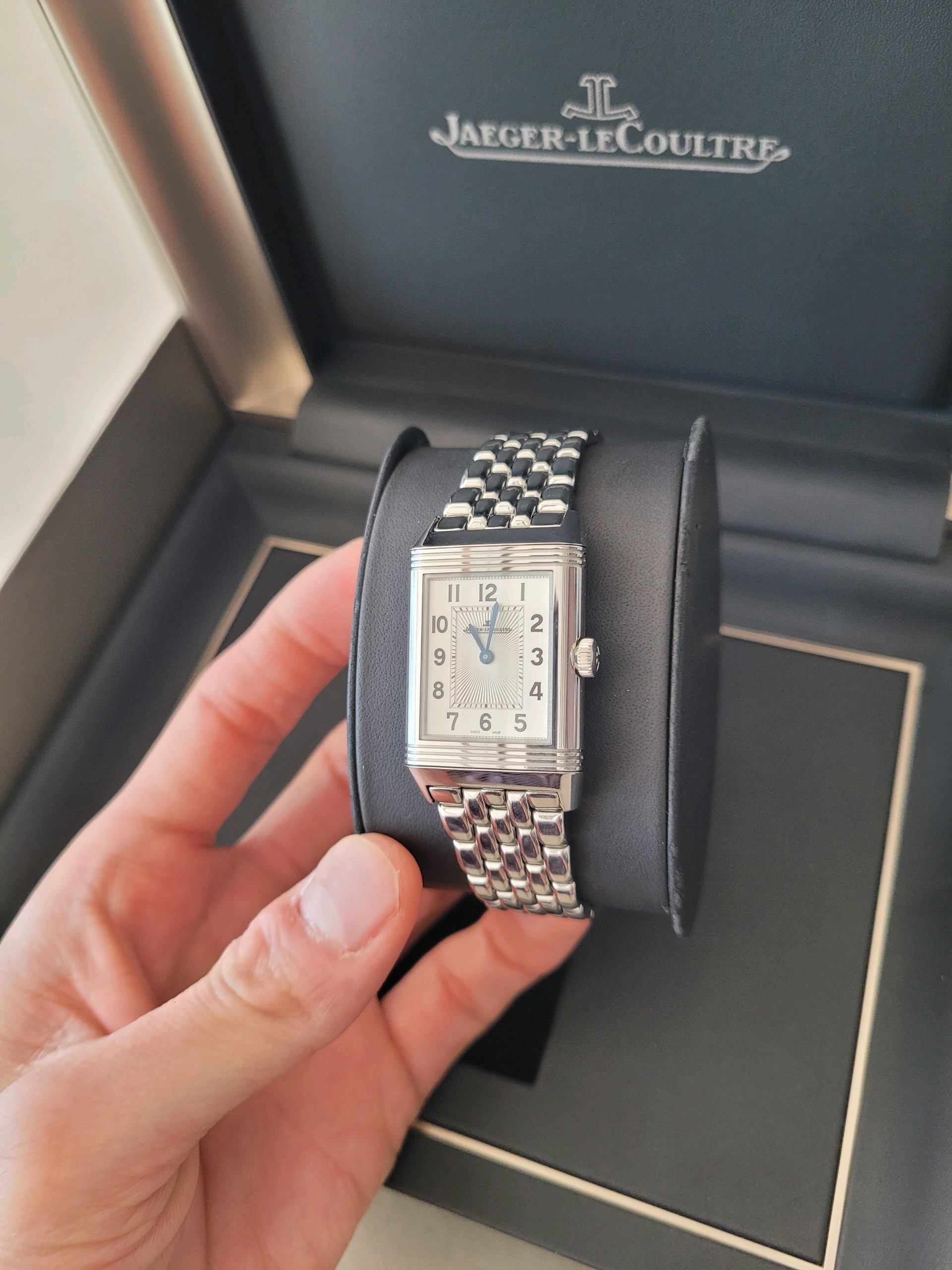 JLC 예거 르쿨트르 루꿀트르 리베르소 클래식 듀에토 Q2588120 실버 그레이 블랙 스테인리스 스틸 아라빅,Q2588120,앞면 : 실버 그레이 / 뒷면 : 블랙,스테인리스 스틸,브레이슬릿,핸드 와인딩,JLC Cal. 854B,Switzerland,Stainless steel,Folding clasp,Front: arabic numeral indices. Back: arabic numerals,Reverso Classic Duetto,리베르소 클래식 듀에토,Reverso Classic,Jaeger-LeCoultre,예거 르쿨트르,아라빅