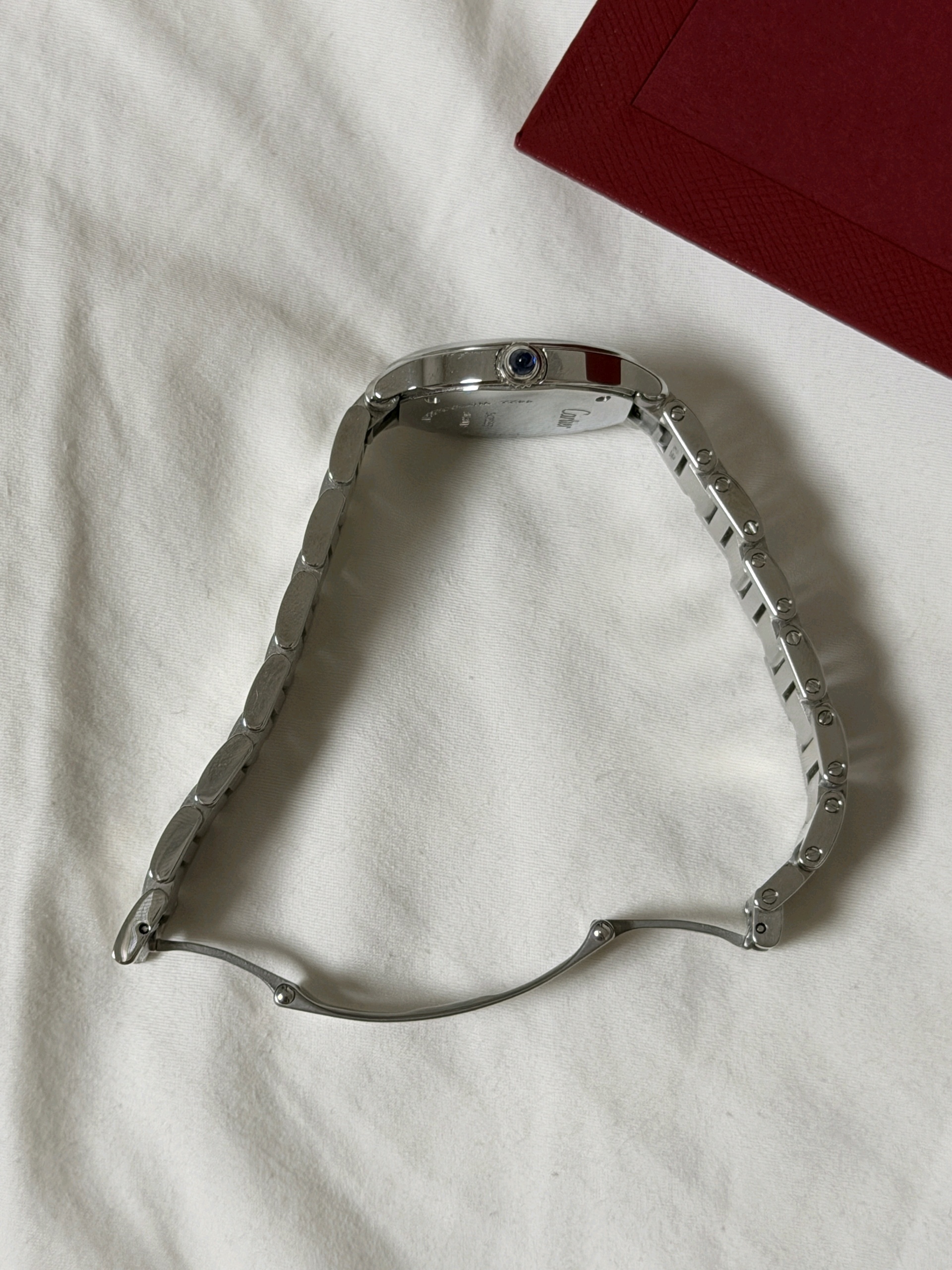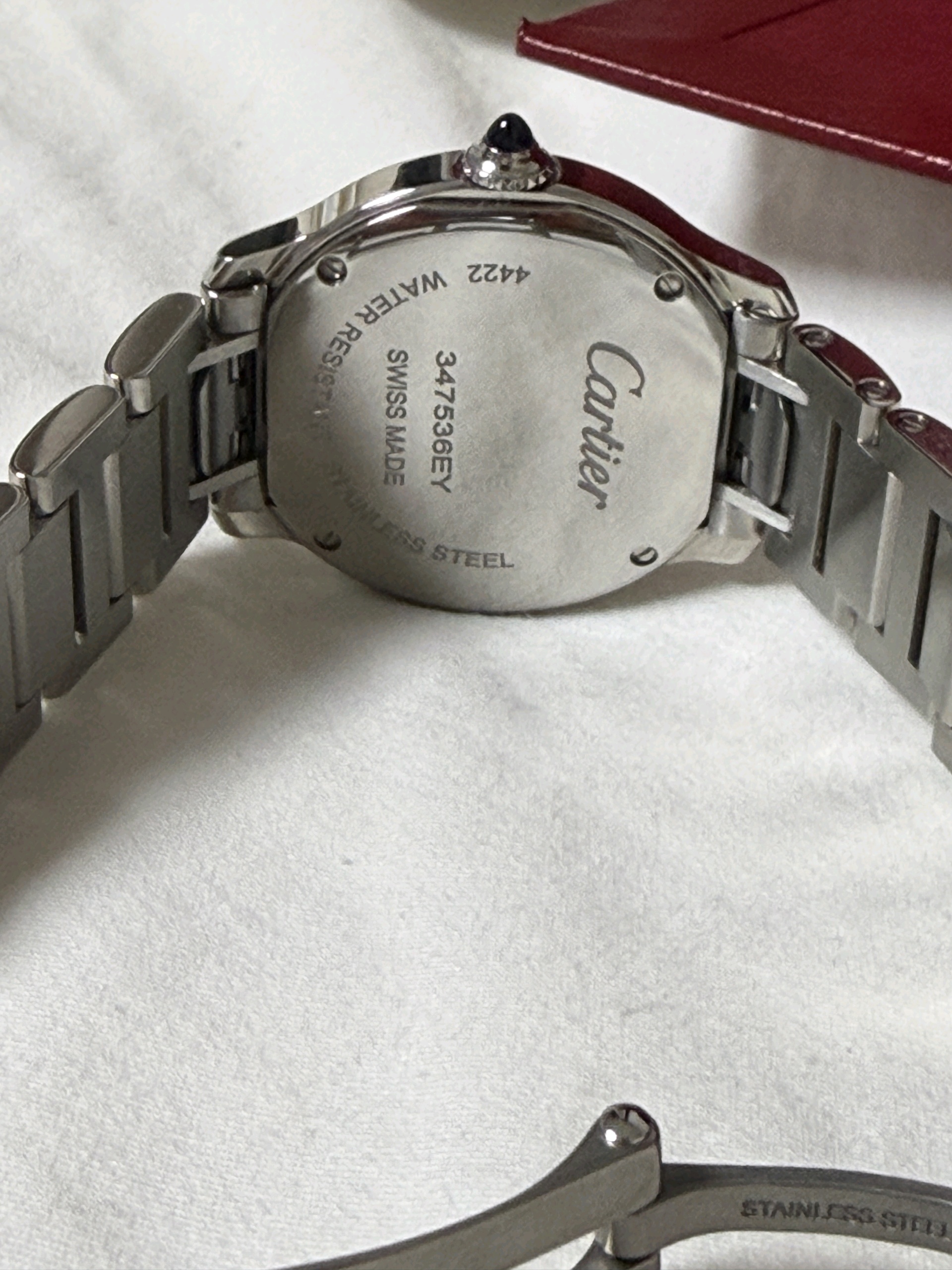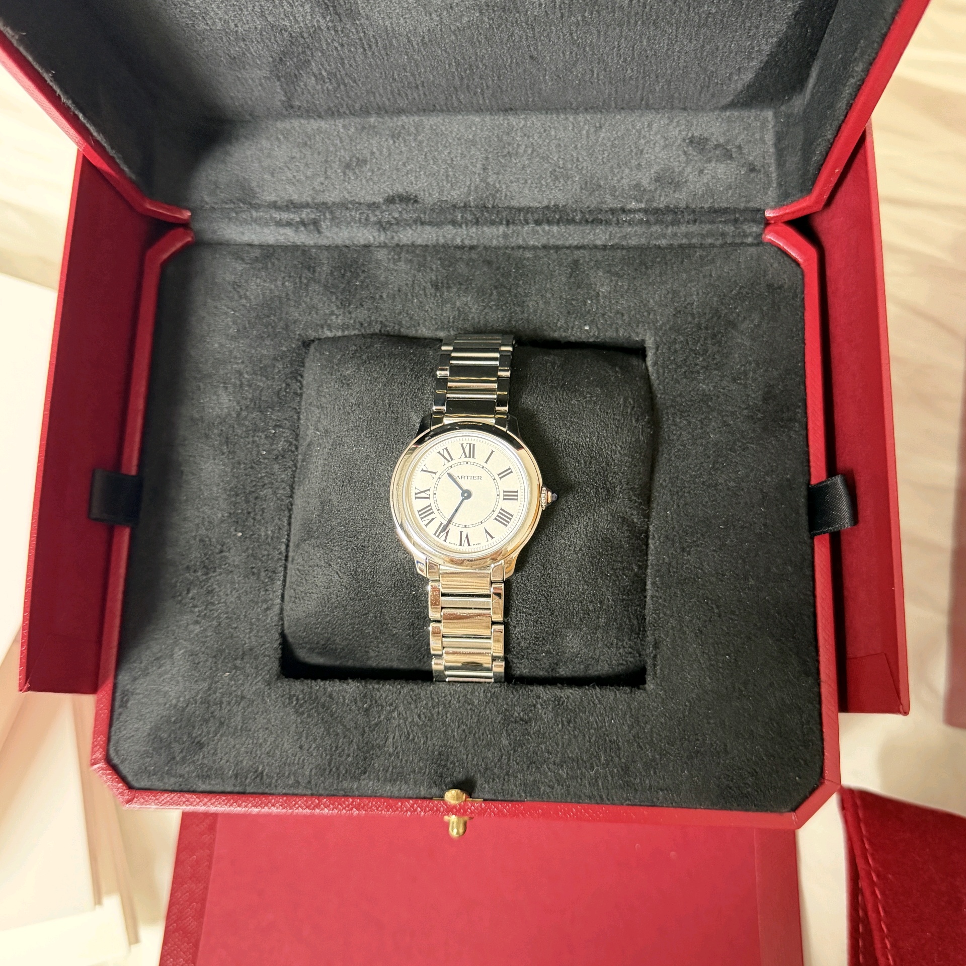 WSRN0033,까르띠에 롱드 드 까르띠에 롱드 머스트 SM 스몰 스틸 쿼츠 29mm,Cartier Ronde must de cartier small sm steel quartz 29mm,실버,스테인리스 스틸,29mm,쿼츠,Stainless teel + spinel,Folding clasp,Roman numeral indices,Ronde Must SM,롱드 머스트 SM,Ronde de Cartier,Cartier,까르띠에