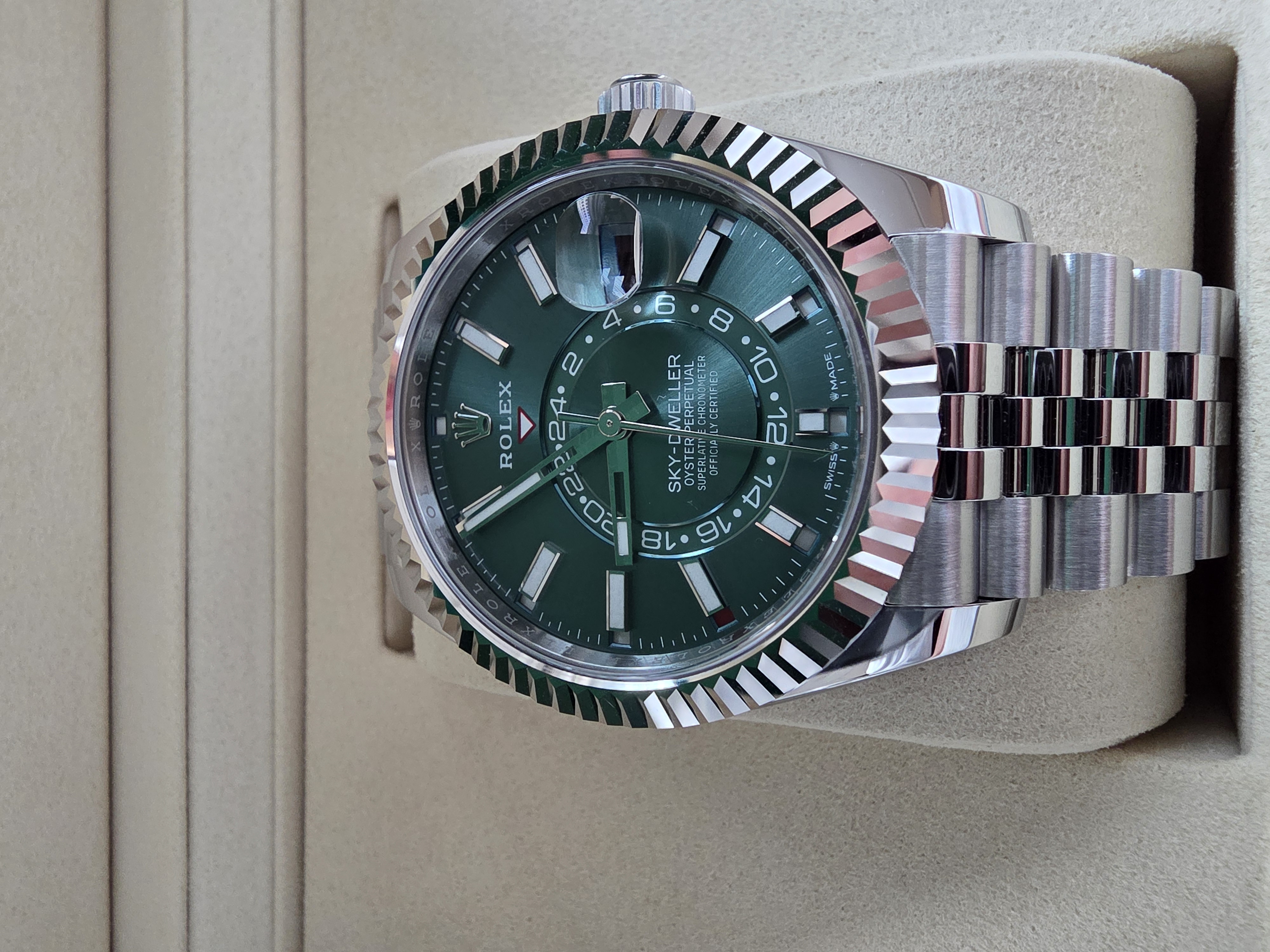 Sky-Dweller,M336934-0002,336934,민트그린,스테인레스스틸+화이트골드,쥬빌리브레이슬릿,사파이어크리스탈,42mm,Rolex,스카이 드웰러,롤렉스 스카이드웰러,롤렉스 스카이 드웰러,스드,롤렉스 스드,민트 그린,스테인레스 스틸,화이트 골드,쥬빌리 브레이슬릿,사파이어 크리스탈,스카이드웰러,롤렉스,스테인리스 스틸,Switzerland,Stainless steel,Folding clasp,Date,24-Hour subdial,calendar / baton indices,Hour + minute + seconds,남성,예물,웨딩,.그린,바,폴딩 클라스프,데이트,GMT,애뉴얼 캘린더,약 21mm,원형,파일럿,남성용,Date, 24-Hour subdial, calendar / baton indices