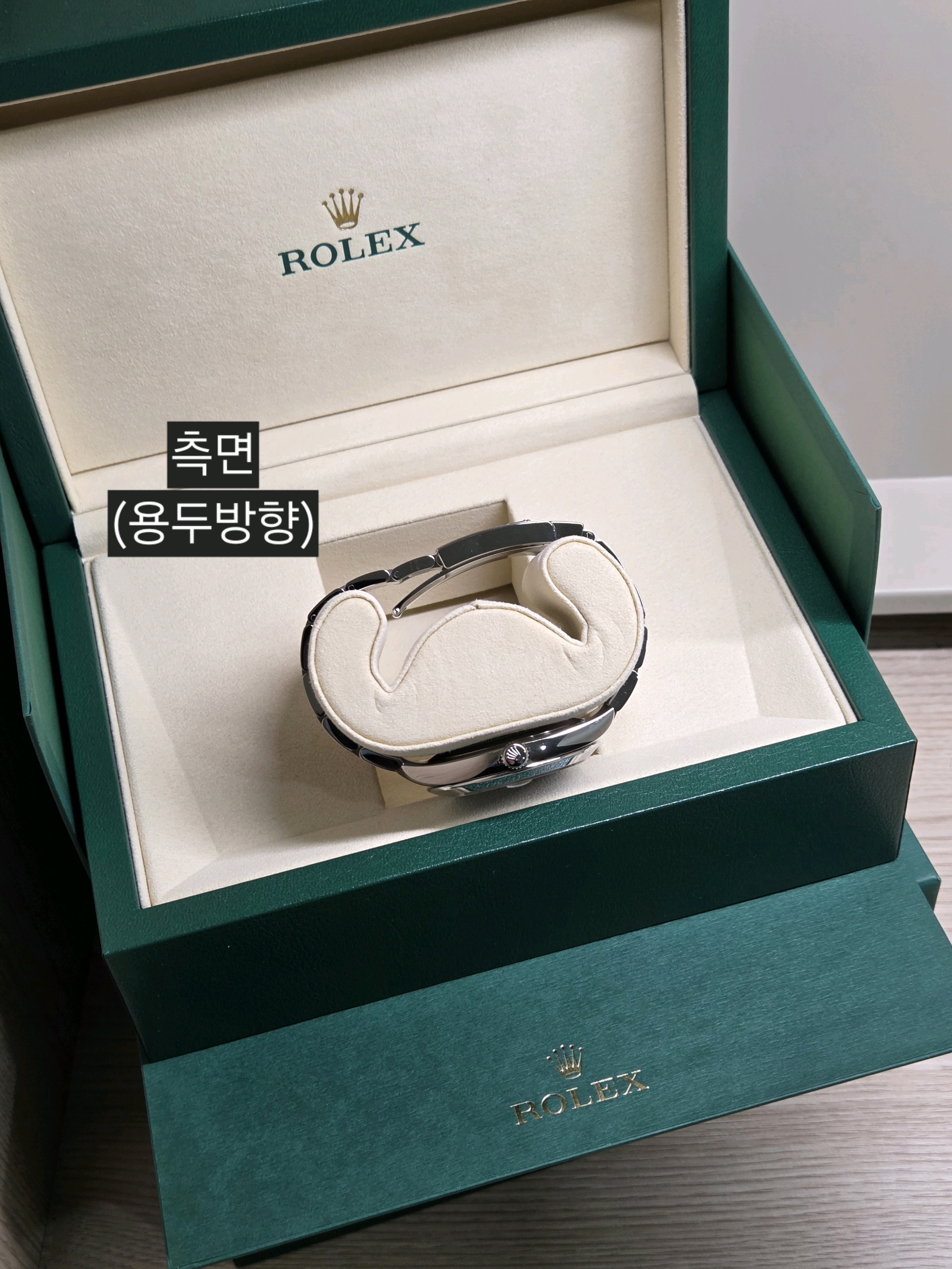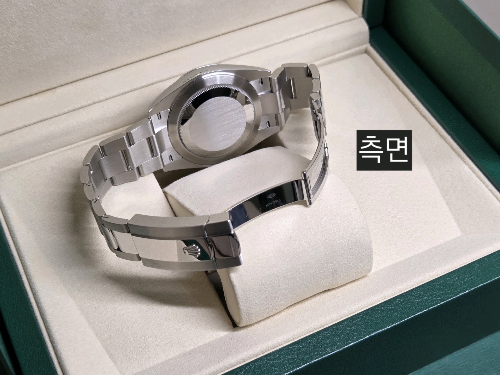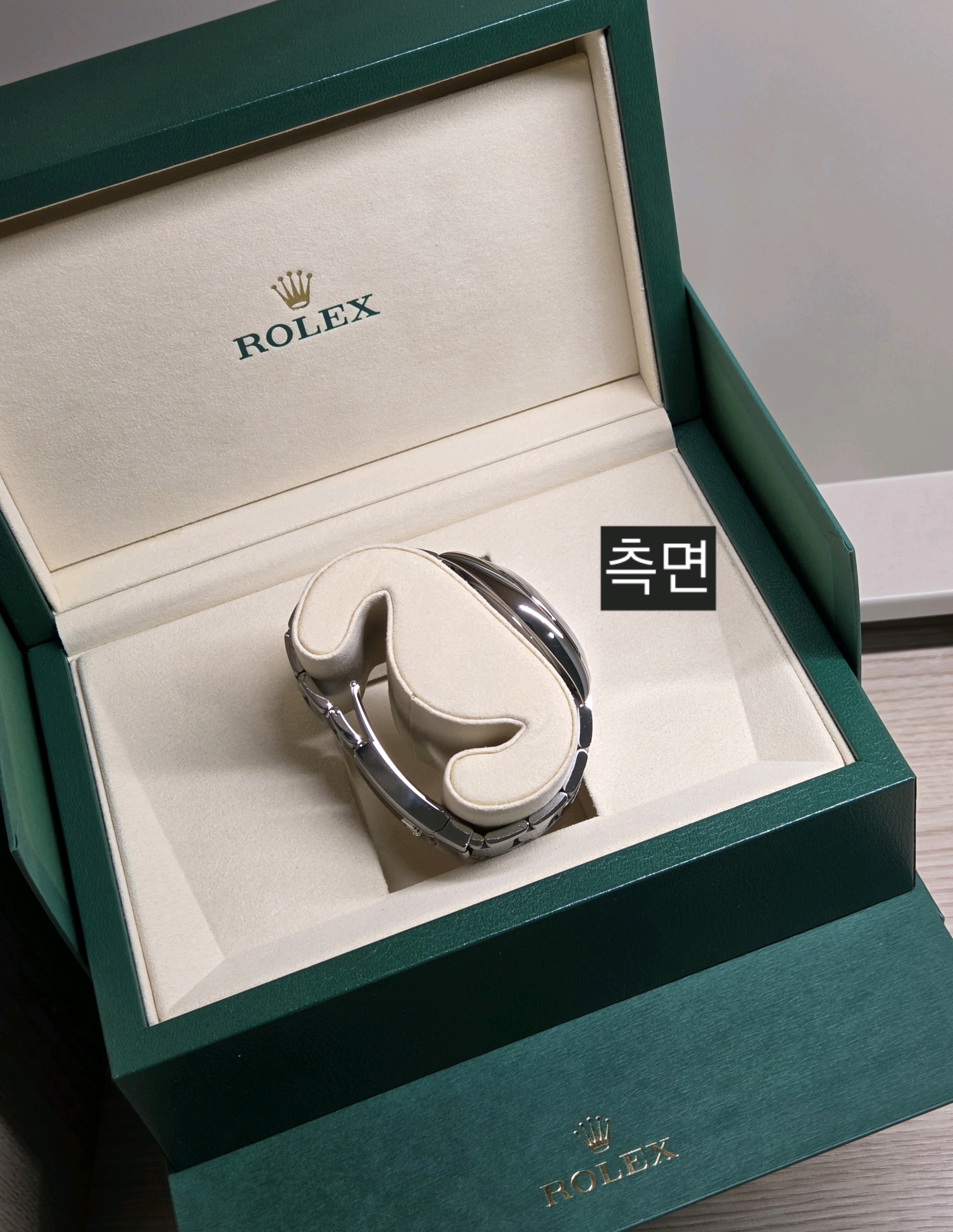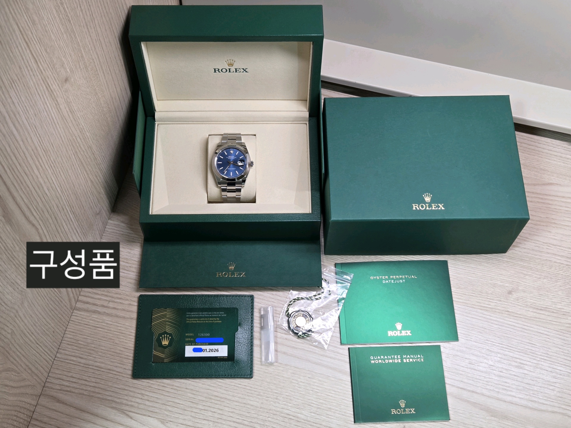 - 구성품: 시계 본품, 롤렉스 보증카드(2026.01), 내/외 박스, 설명서, 여분 링크 1개, 그린 COSC 태그