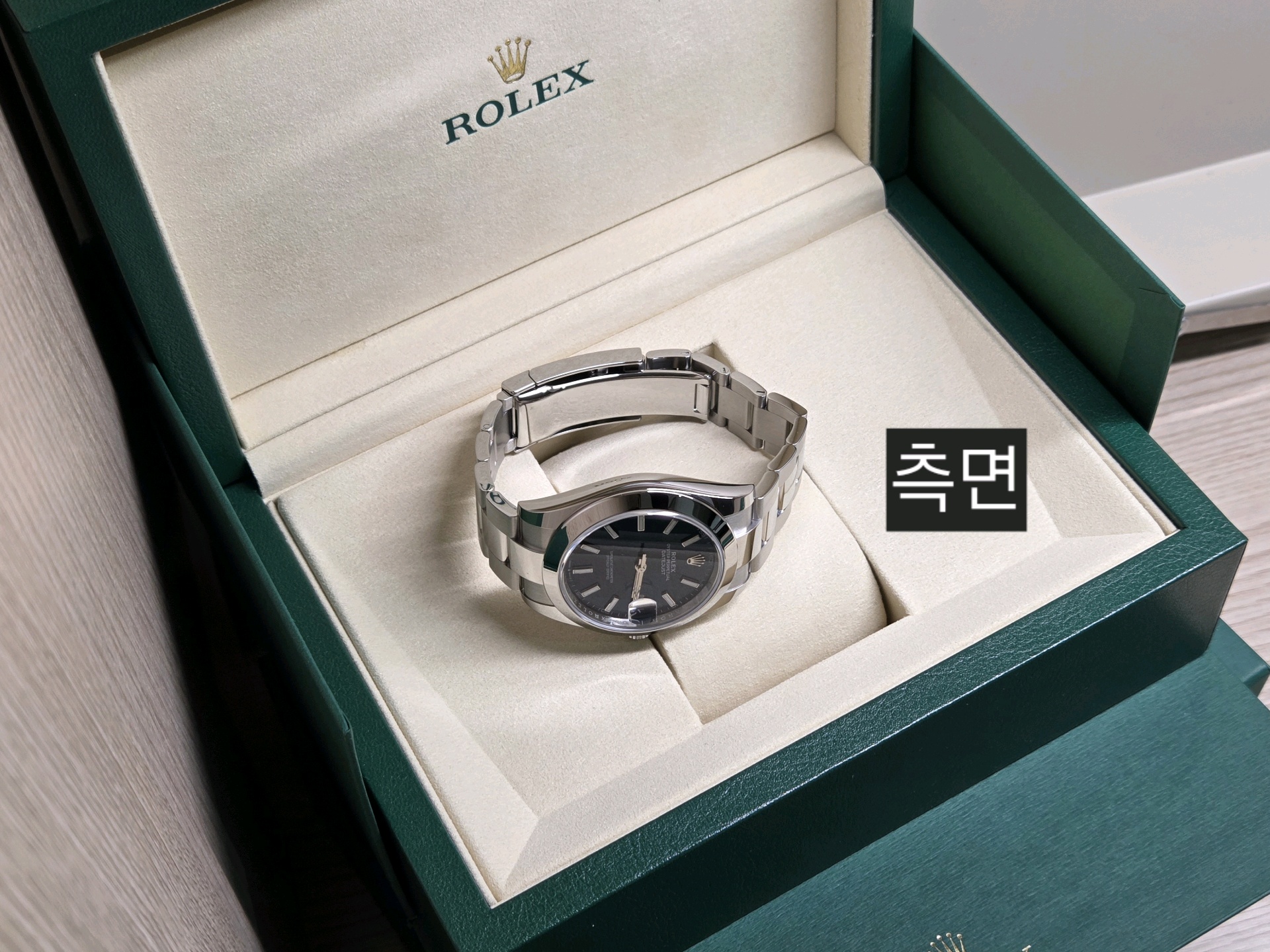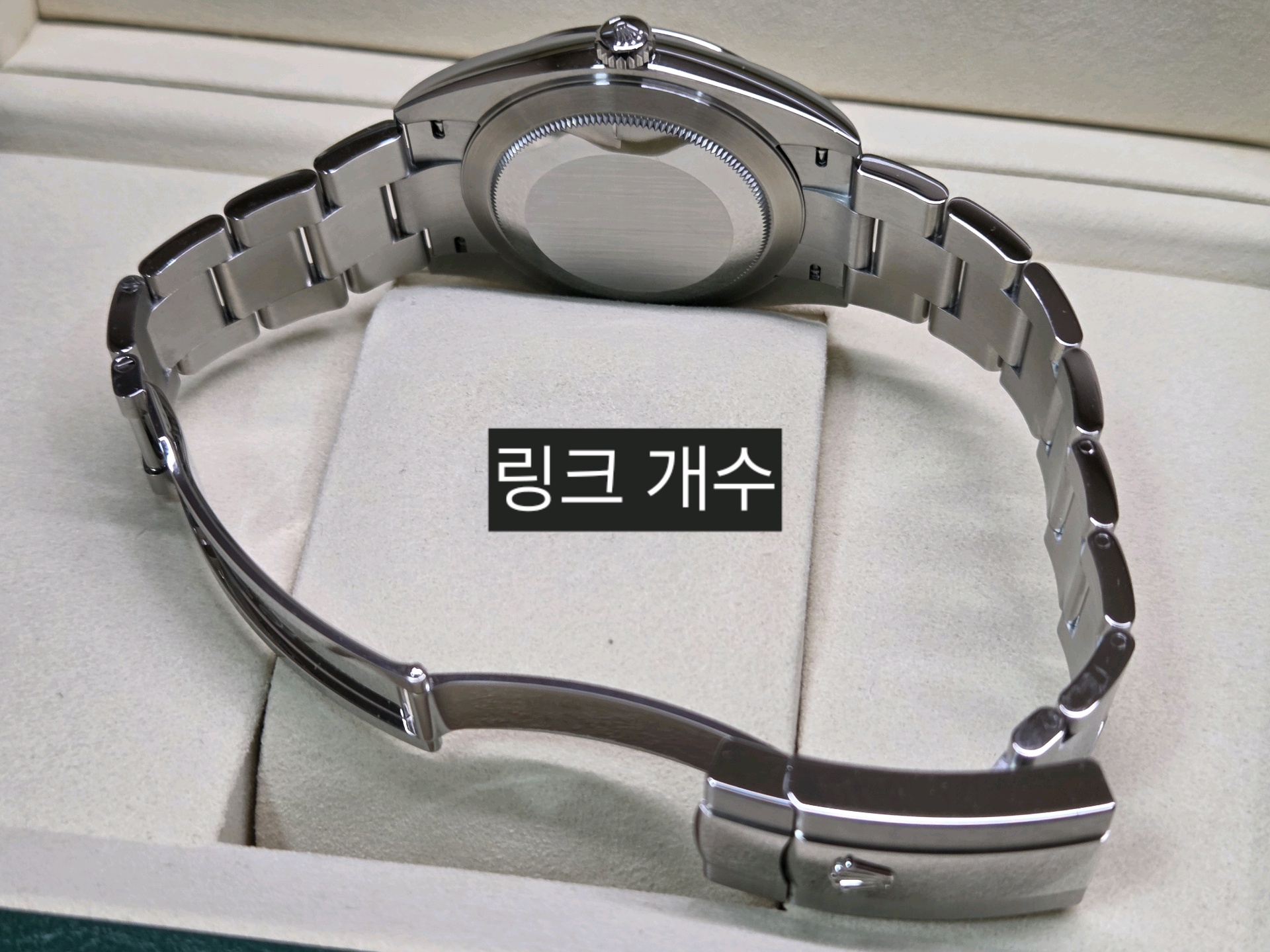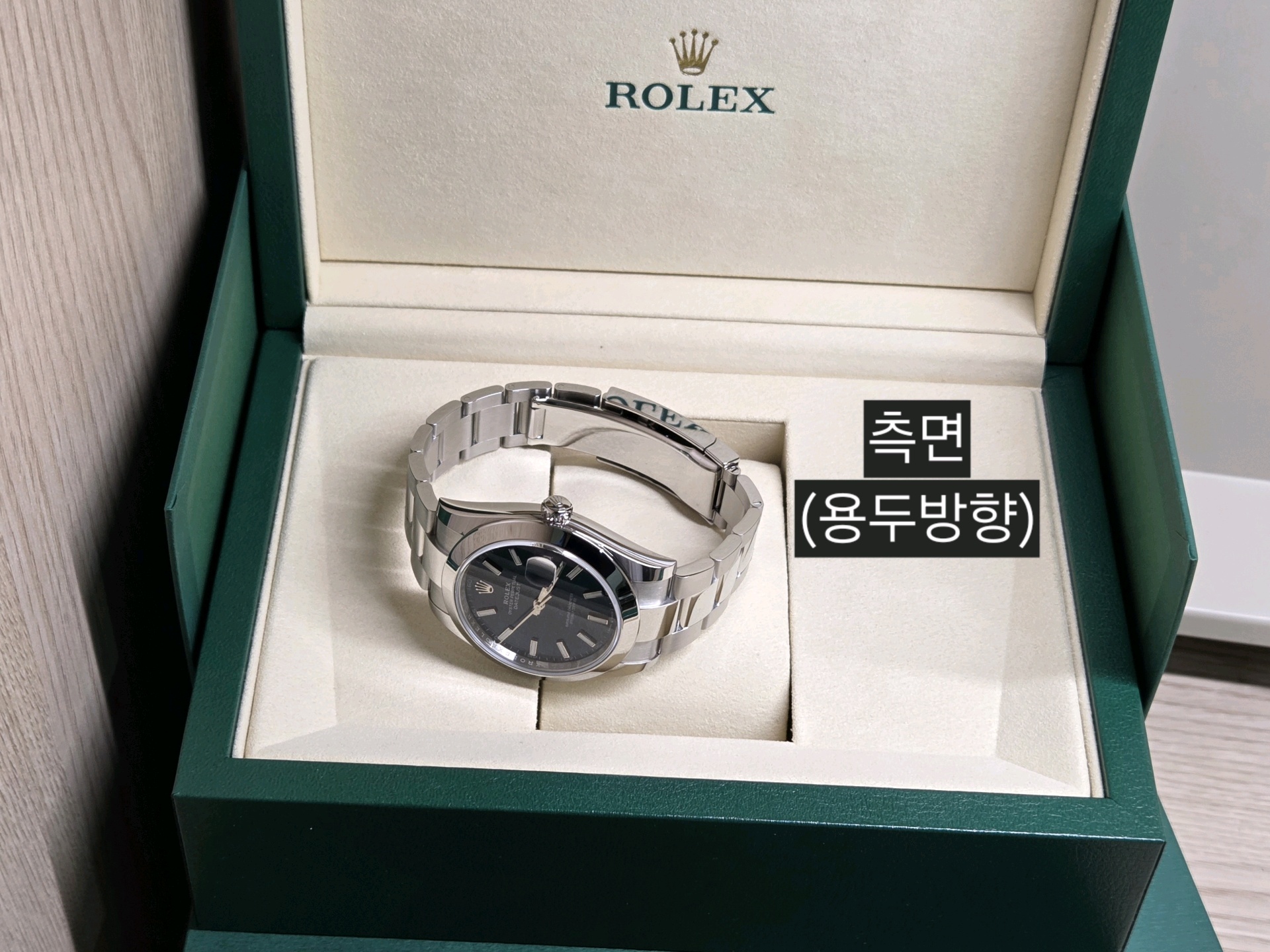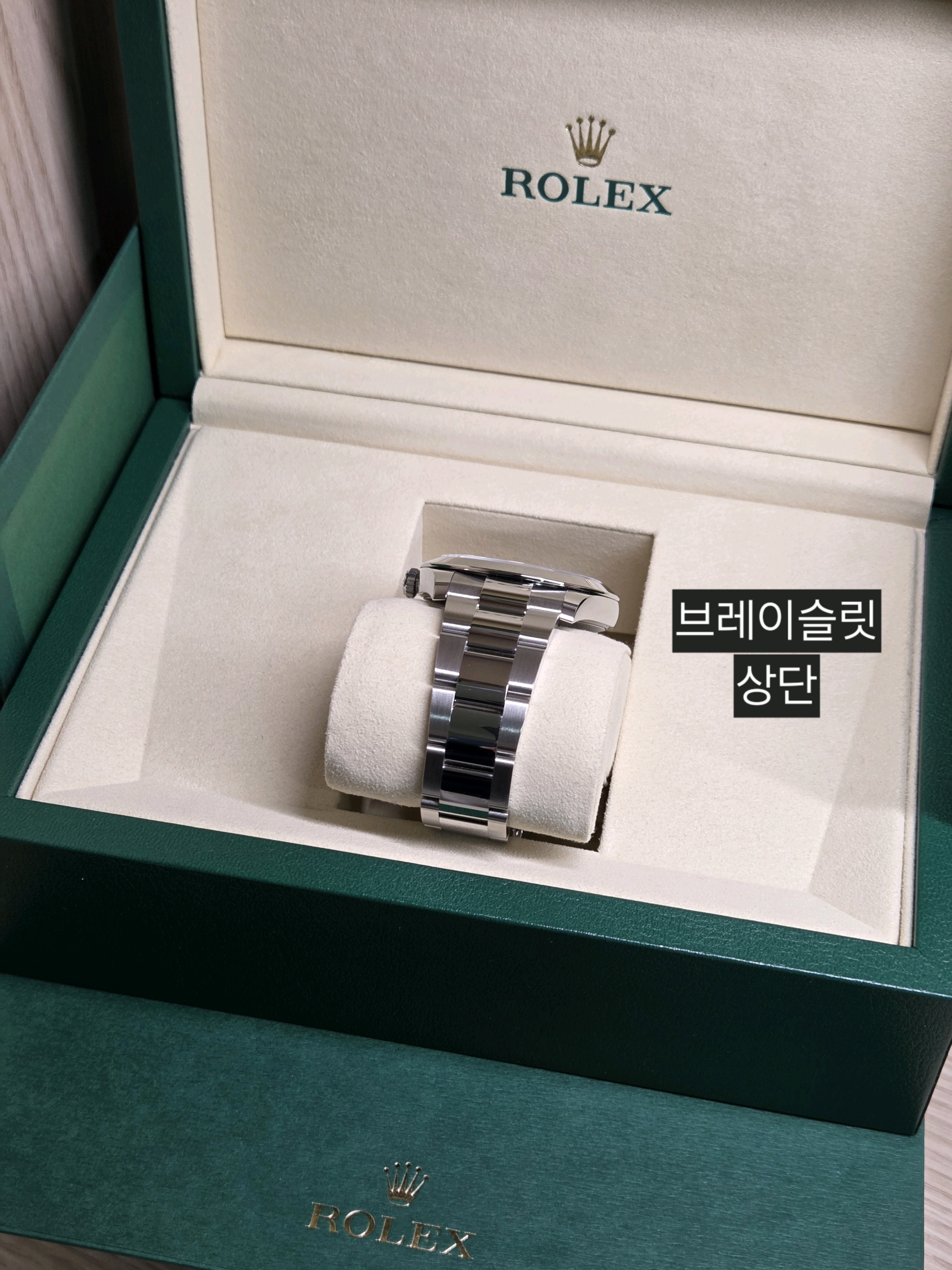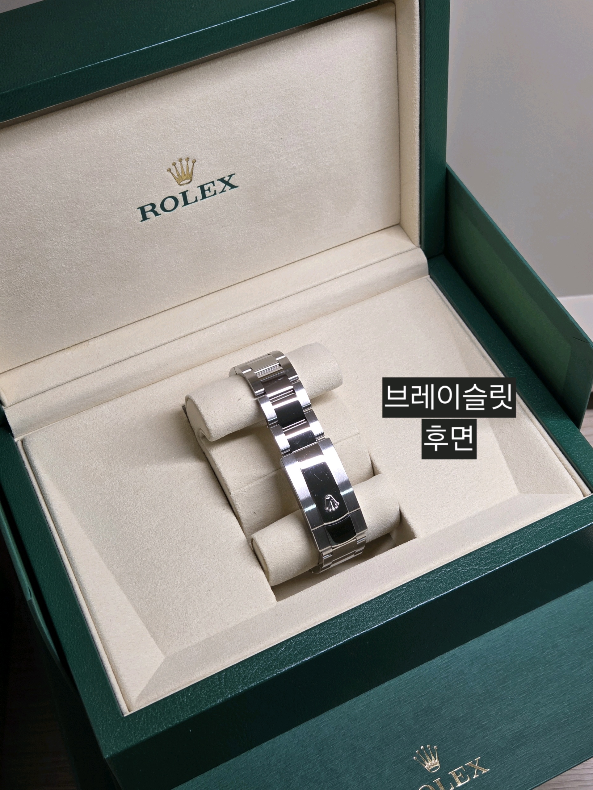 - 구성품: 시계 본품, 롤렉스 보증카드(2026.01), 내/외 박스, 설명서, 여분 링크 1개, 그린 COSC 태그