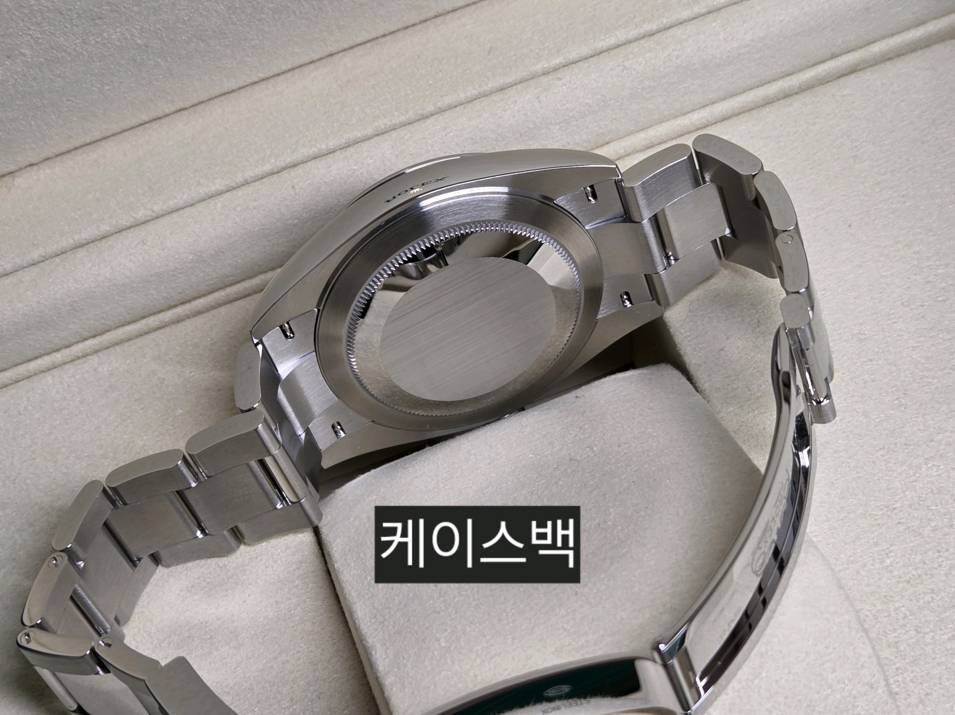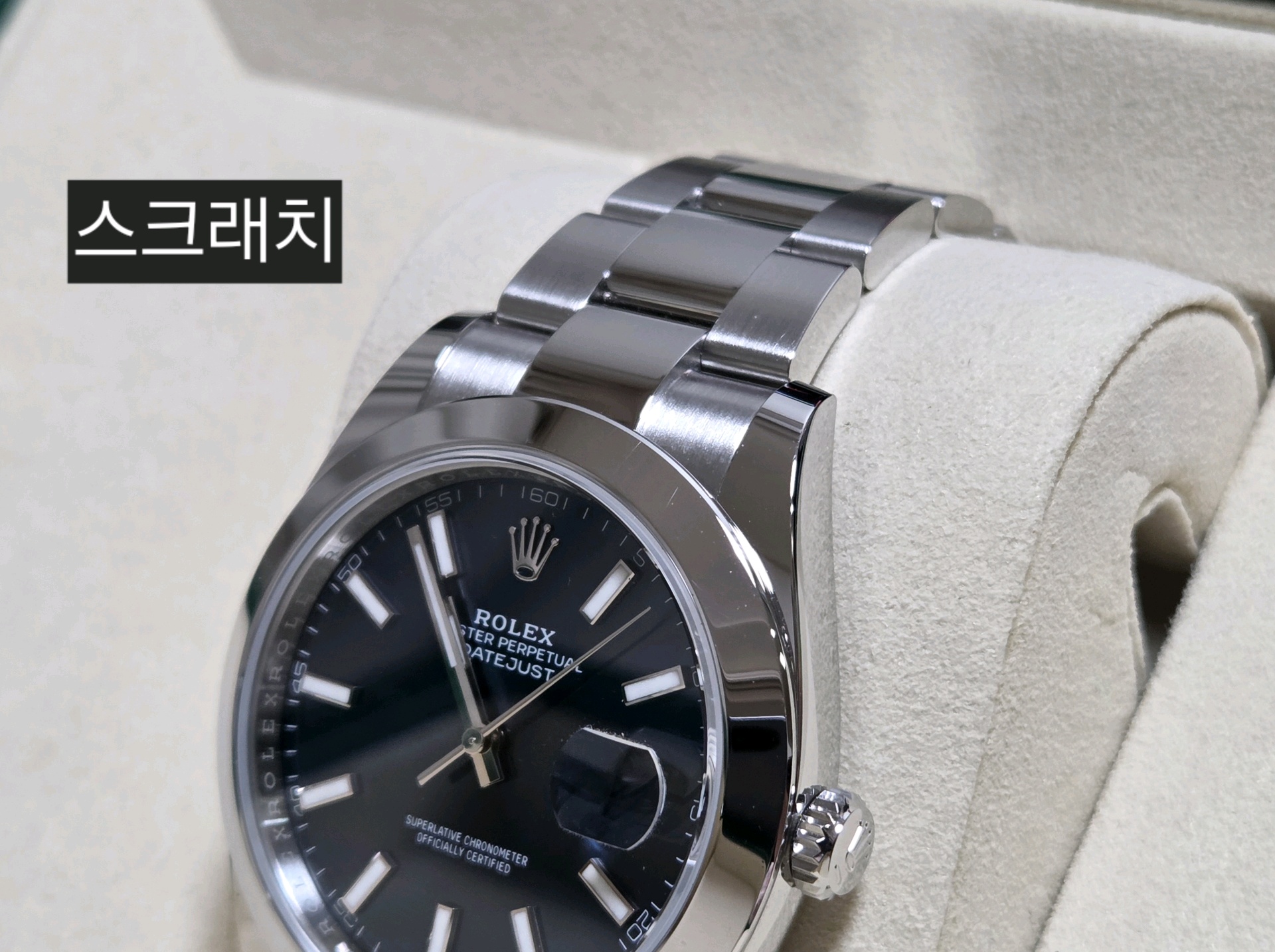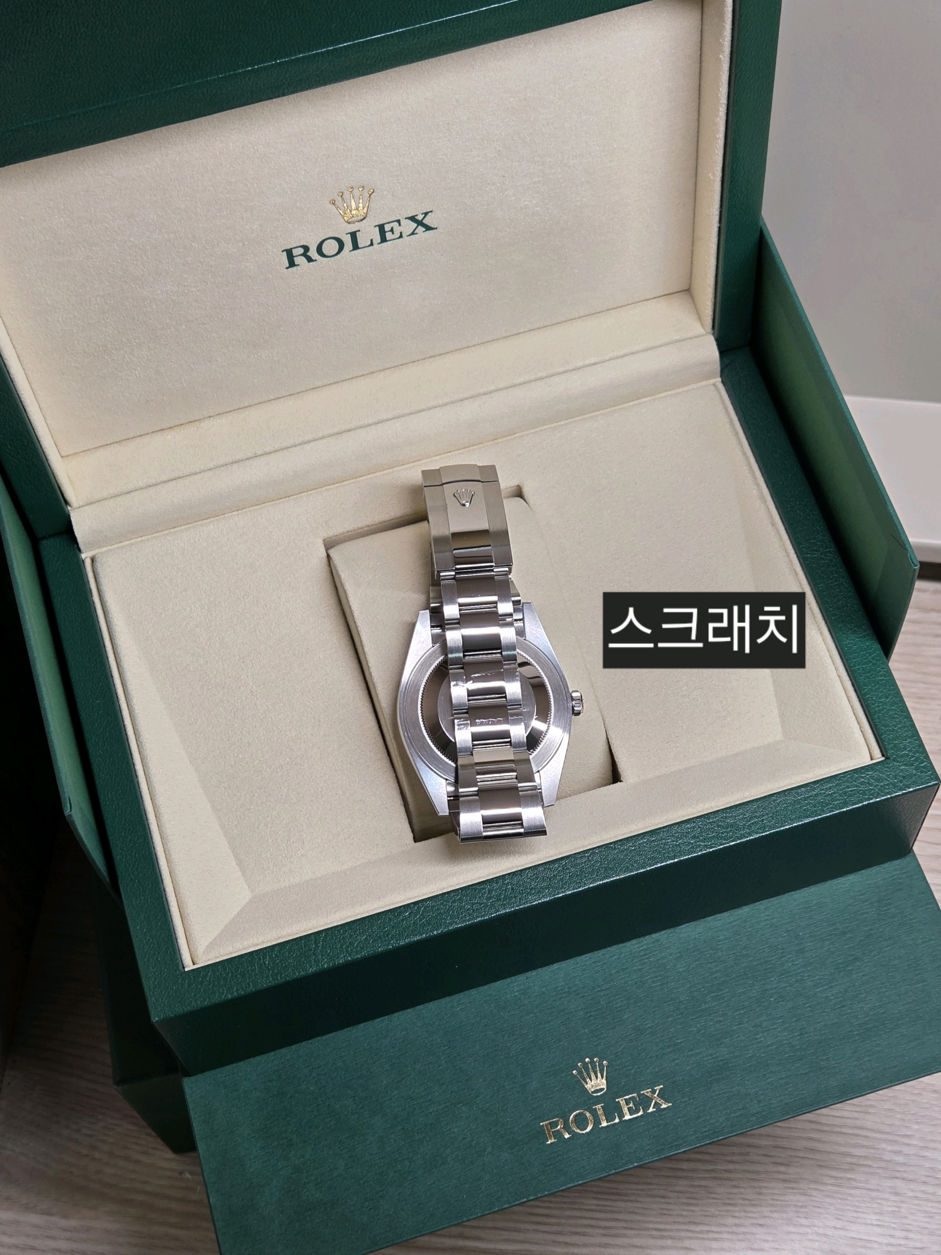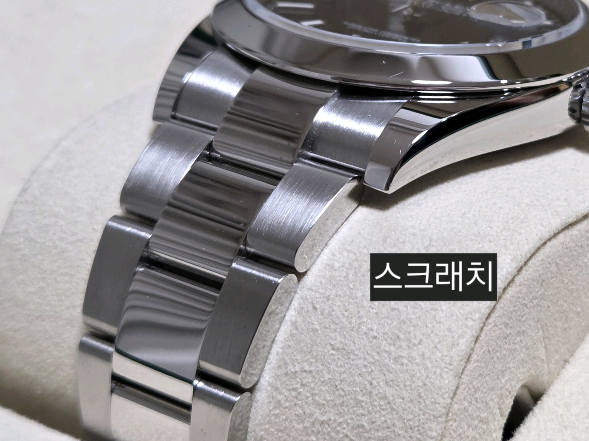 브레이슬릿, 클라스프, 베젤에는 빛 반사 시 확인 가능한 스크래치가 있으며, 깊은 찍힘이나 눌림, 변형은 없습니다.