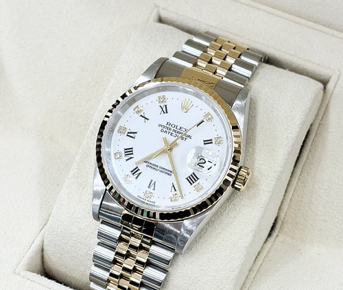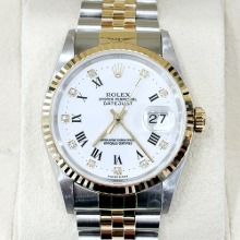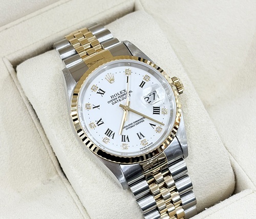 16233-WHROMDIA,Rolex Datejust 36 16233 White Roman Numerals Diamonds,Rolex Datejust 36 Yellow Gold Two Tone White Roman Diamonds,Datejust 36,데이트저스트 36,Datejust,Rolex,롤렉스,롤렉스 데이트저스트 36 16233 화이트 로만 다이아몬드,롤렉스 데이트저스트 36 옐로우 골드 화이트 로만 다이아몬드 쥬빌리,화이트,쥬빌리 브레이슬릿,사파이어 크리스탈,36mm,옐로우 골드,플루티드,Cal. 3135,Hour + minute + seconds,Folding clasp,Date / roman numerals & diamond-set indices,Yellow gold,스테인리스 스틸,스테인리스 스틸, 옐로우 골드