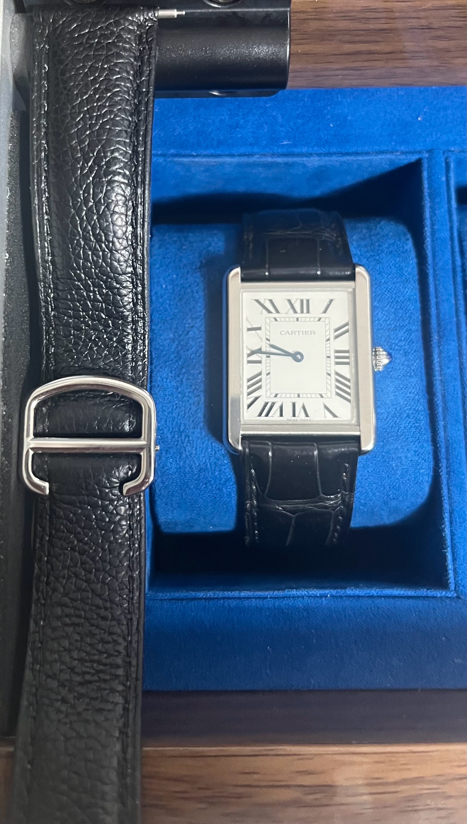 Cartier Tank Solo Large LM Steel WSTA0028,까르띠에 카르티에 탱크 솔로 탱크솔로 탱솔 스틸 라지 LM 스틸 WSTA0028,Tank Solo LM,탱크 솔로 LM,Tank,Cartier,까르띠에,실버,로만,스테인리스 스틸,가죽 스트랩,사파이어 크리스탈,쿼츠,Stainless steel + spinel,Deployant folding clasp,Roman numeral indices,사파이어 크리스탈
