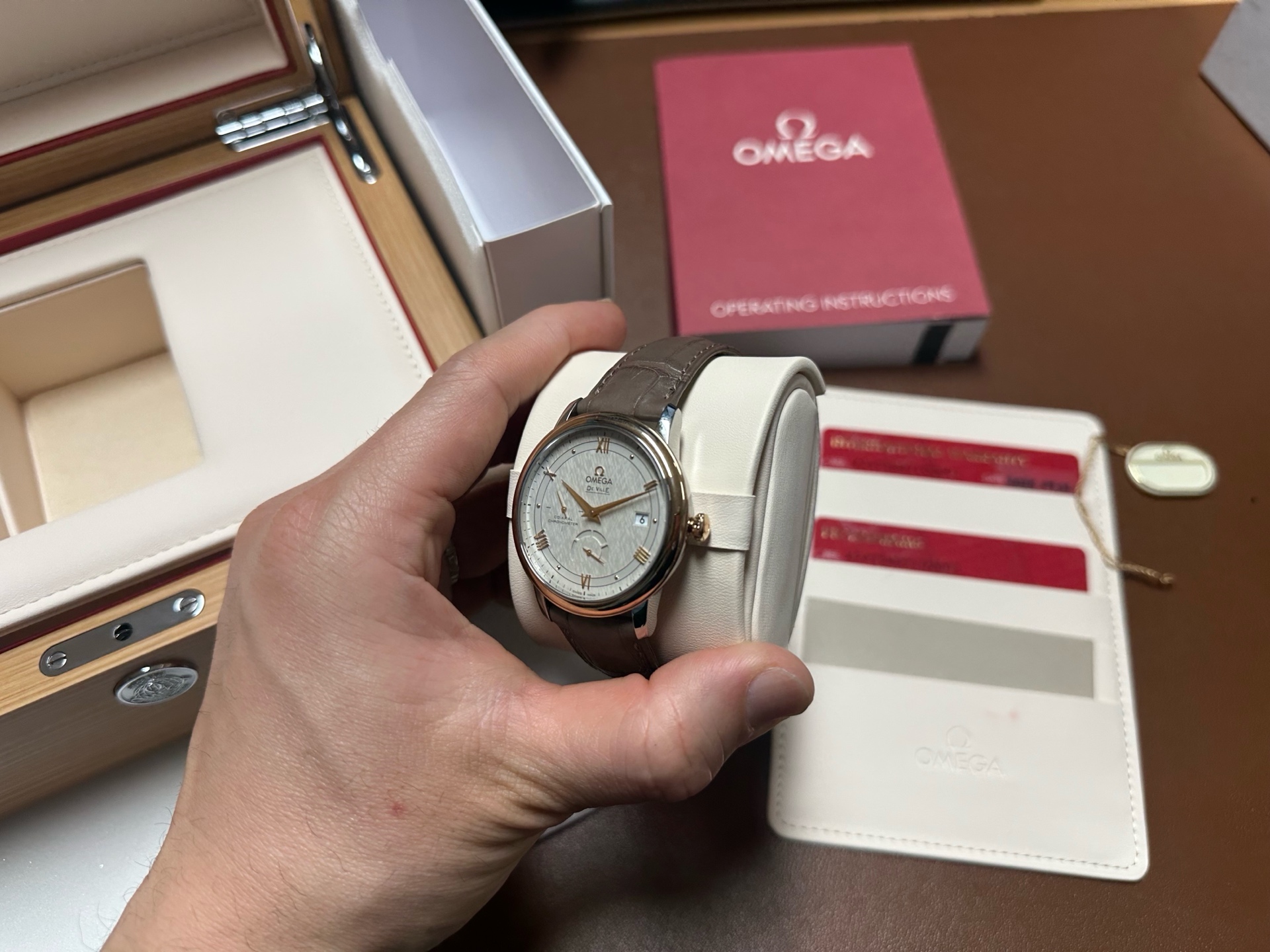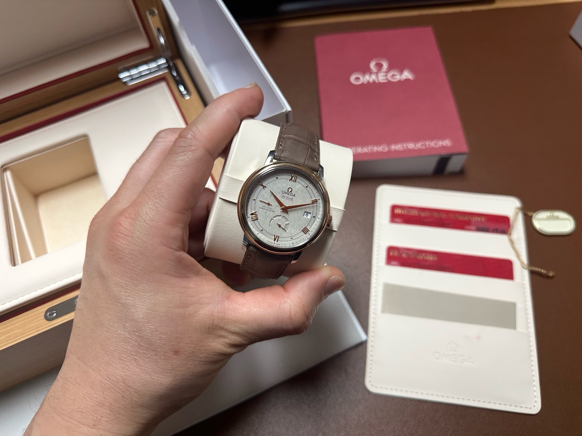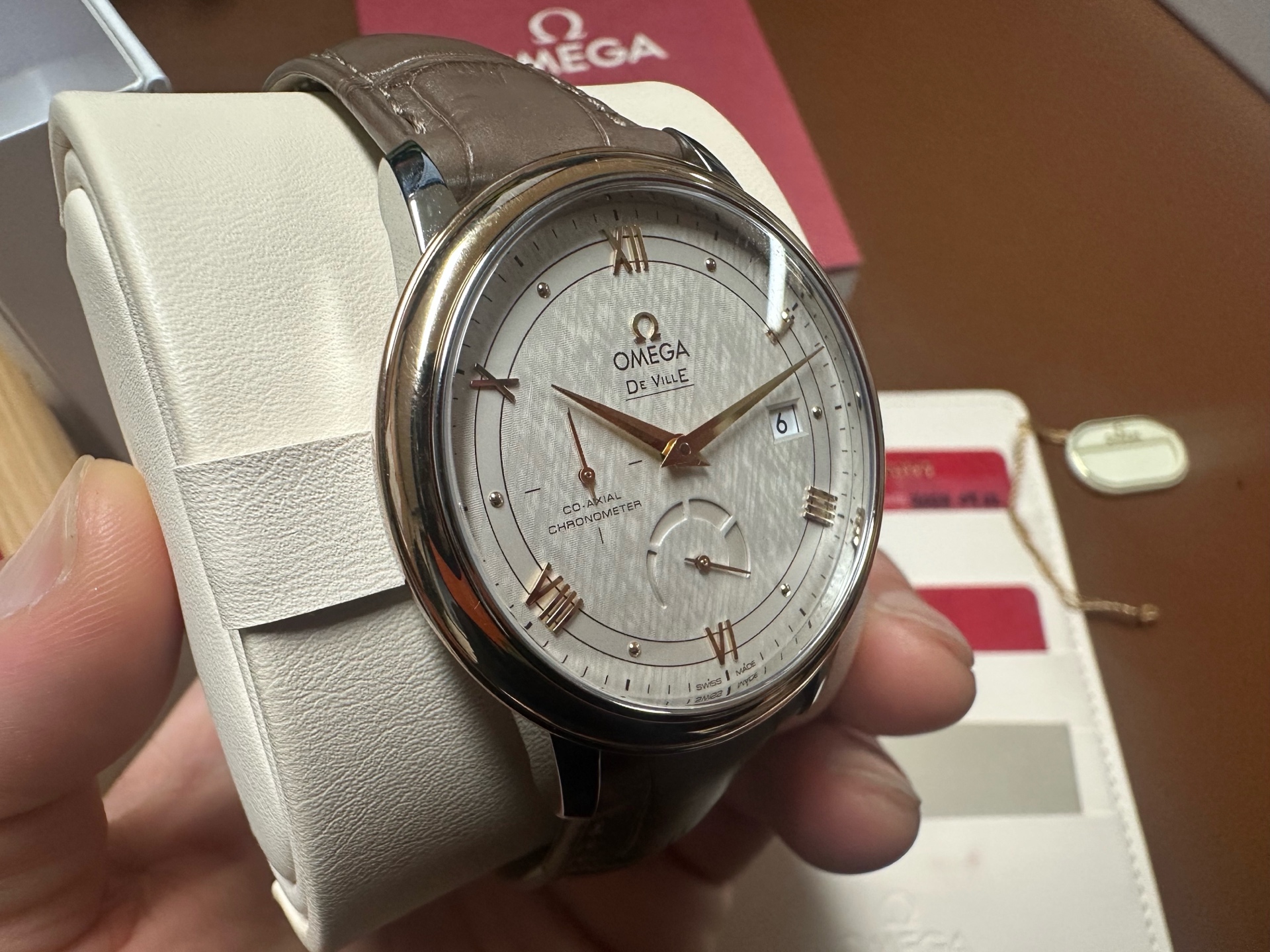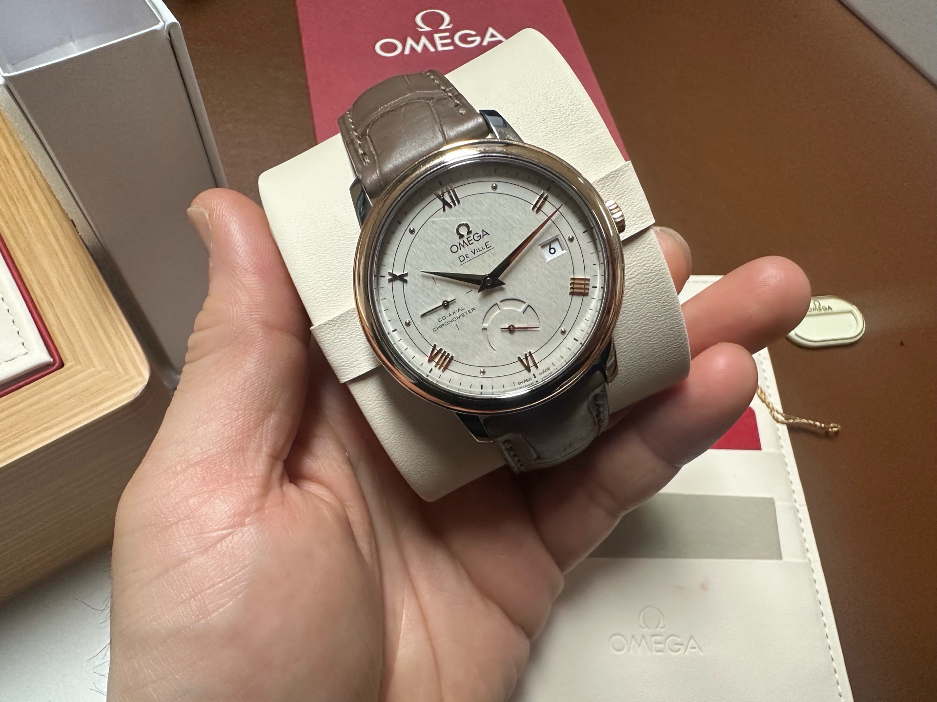 Omega Deville de ville prestige power reserve,오메가 드빌 드 빌 프레스티지 파워리저브 파워 리저브 스몰 세컨즈 세컨드,424.23.40.21.02.001,실버,로만,스테인리스 스틸, 레드 골드,가죽,스트랩,39.5mm,셀프 와인딩,2627,Switzerland,Red gold,Pin buckle,Date, power reserve, small seconds / applied roman numerals & dotted hour markers,De Ville Prestige,드 빌 프레스티지,De Ville,Omega,오메가