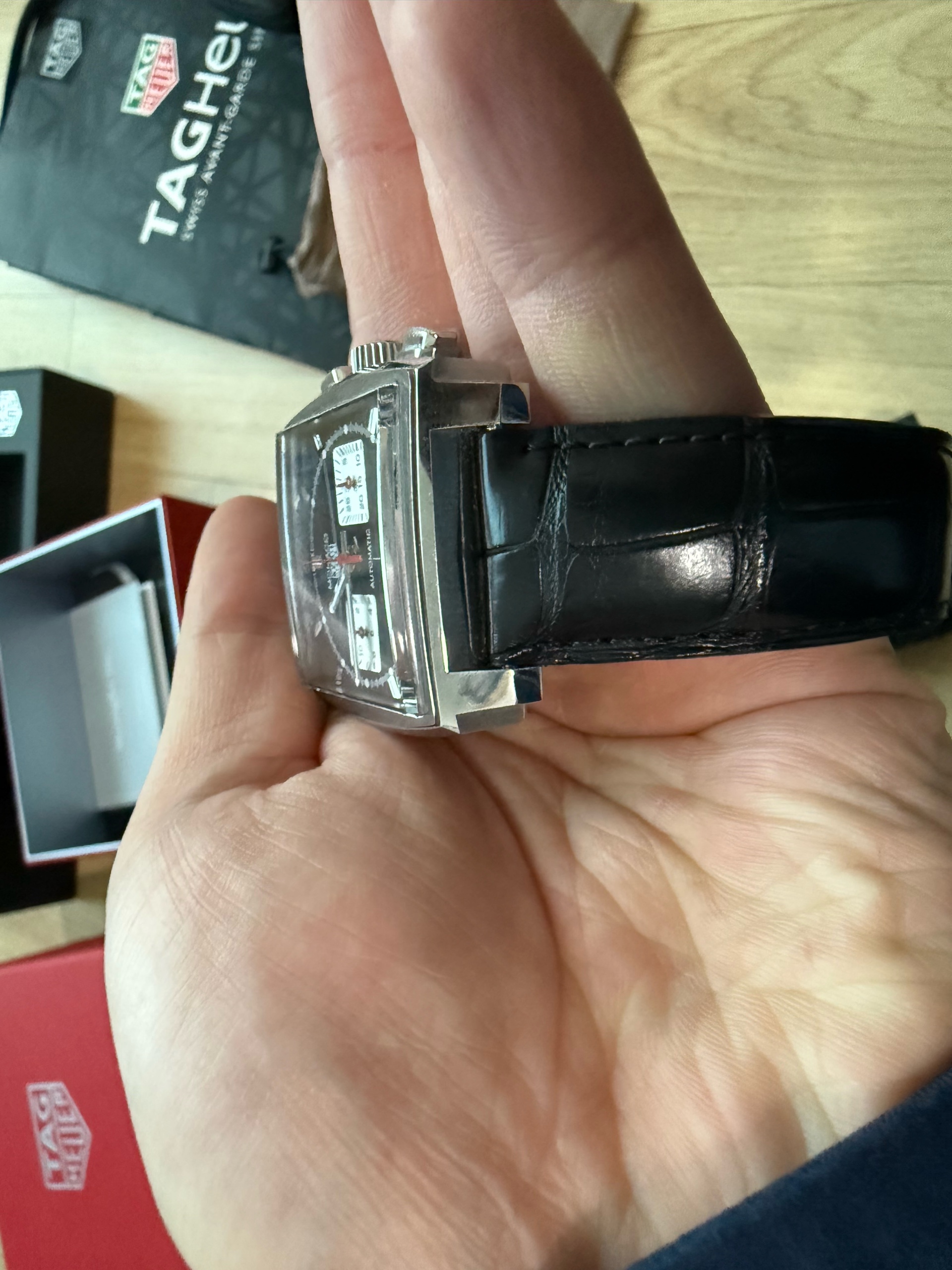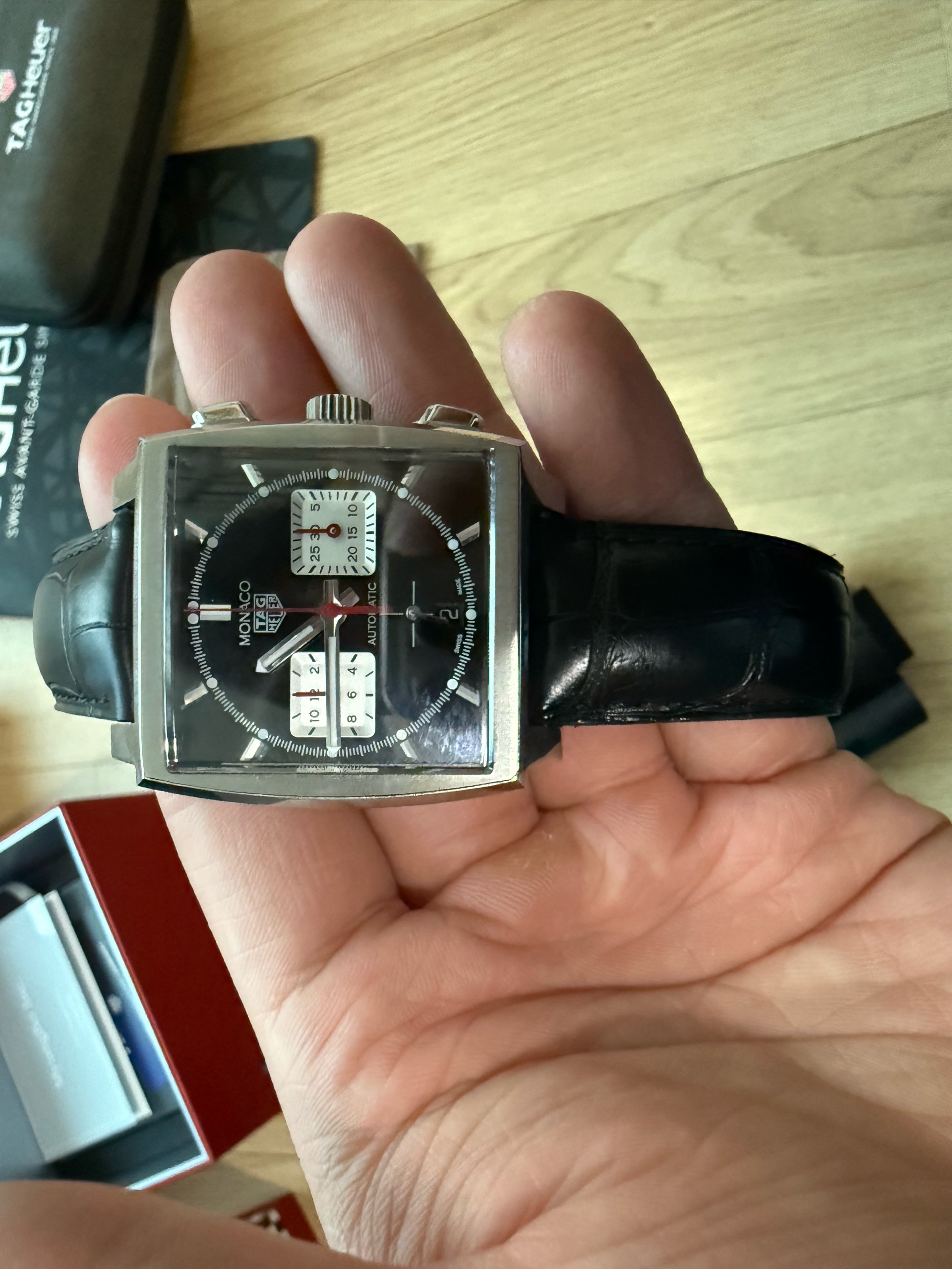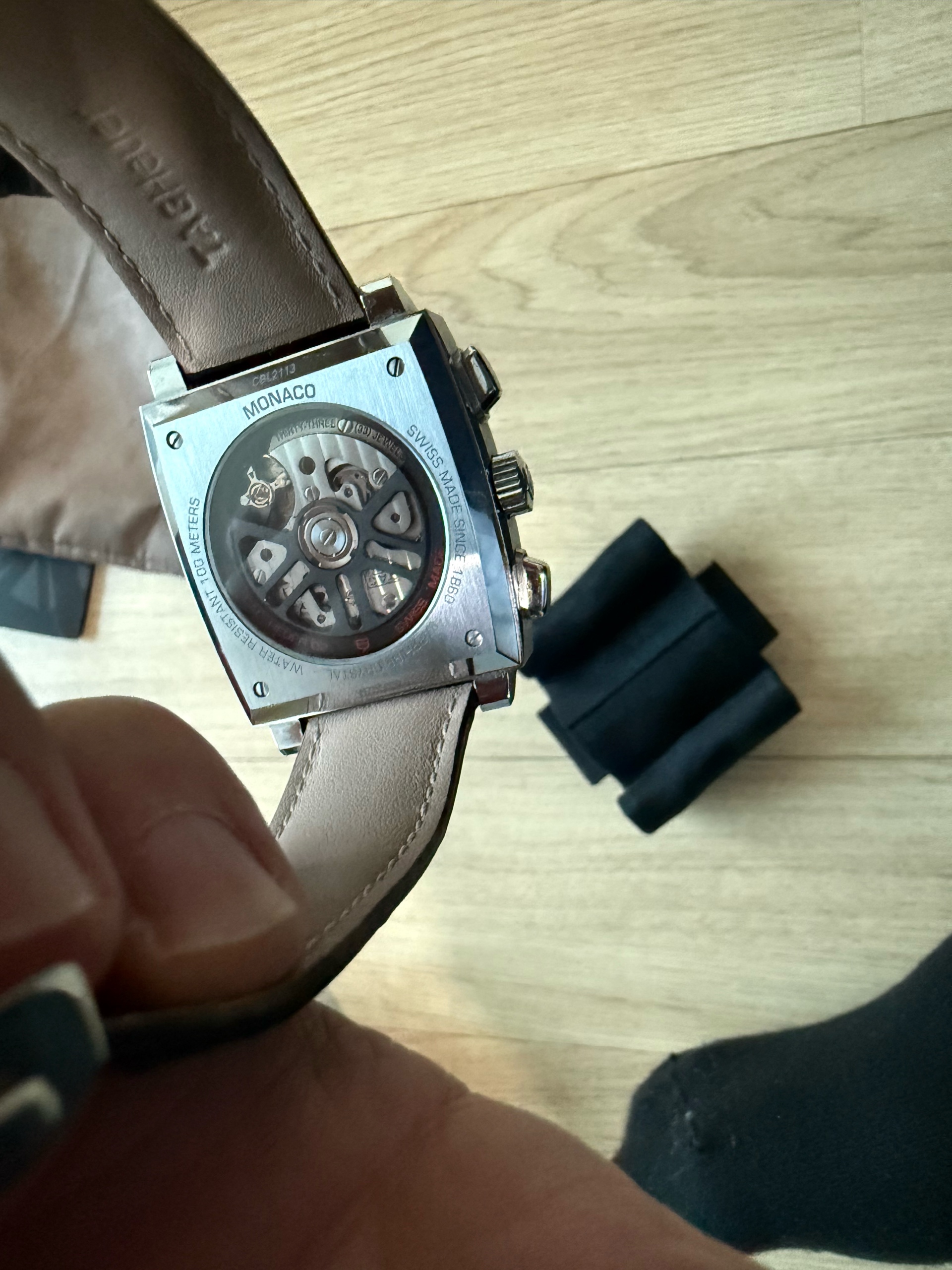 Monaco Chronograph Calibre Heuer 02,Tag Heuer Monaco Leather Strap,태그호이어 모나코 칼리버 호이어 02,태그호이어 모나코 가죽 스트랩,태크호이어 모나코 크로노그래프 블랙,CBL2113.FC6177,블랙,사파이어 크리스탈,셀프와인딩,모나코 크로노그래프 칼리버 호이어 02,Monaco,TAG Heuer,태그 호이어,가죽 스트랩,셀프 와인딩,Stainless steel,Deployant folding clasp,Chronograph subdials,small seconds / applied hour markers,Hour + minute + small seconds + chronograph,투명 케이스백,스트랩,Chronograph subdials, small seconds / applied hour markers