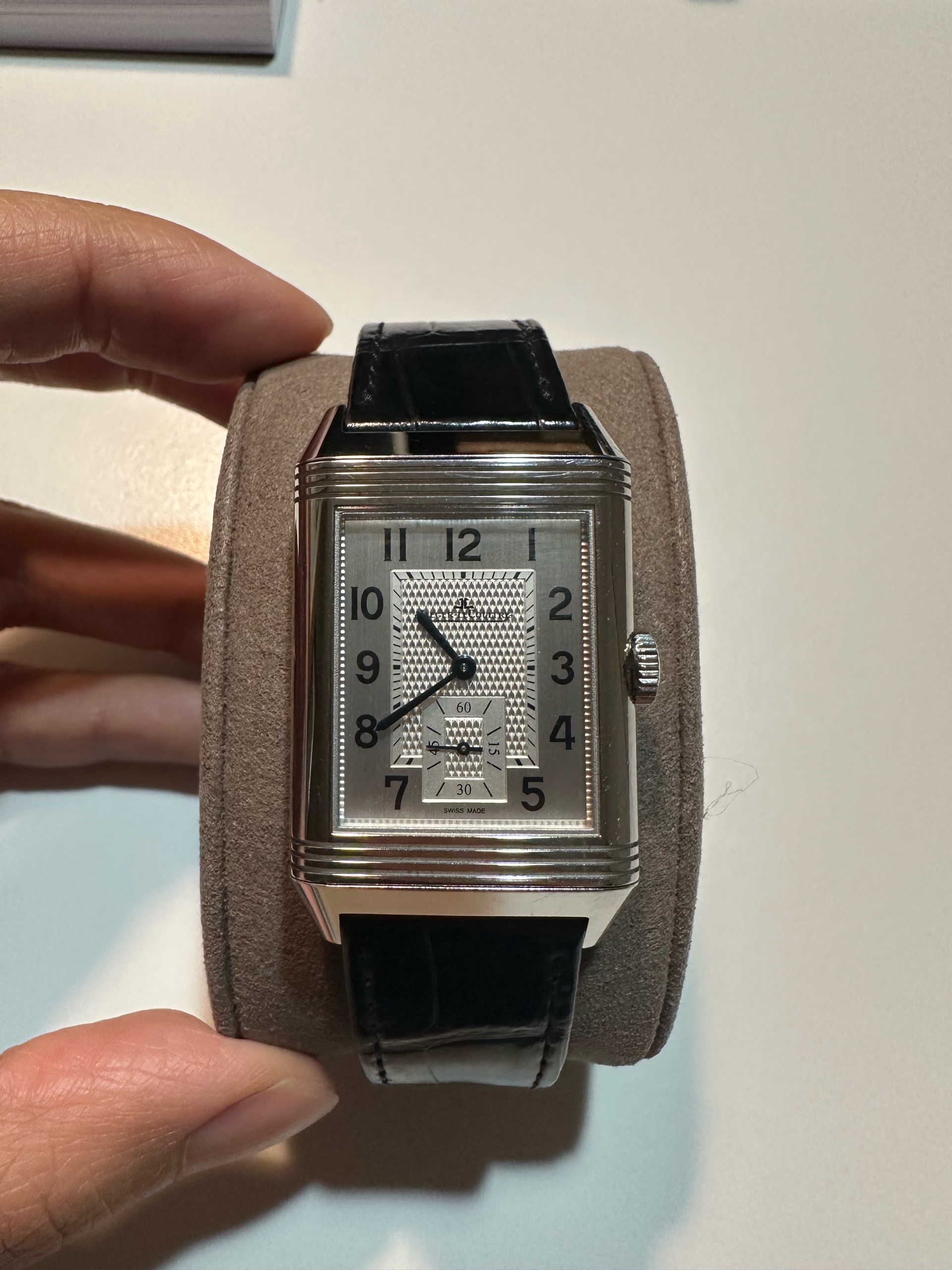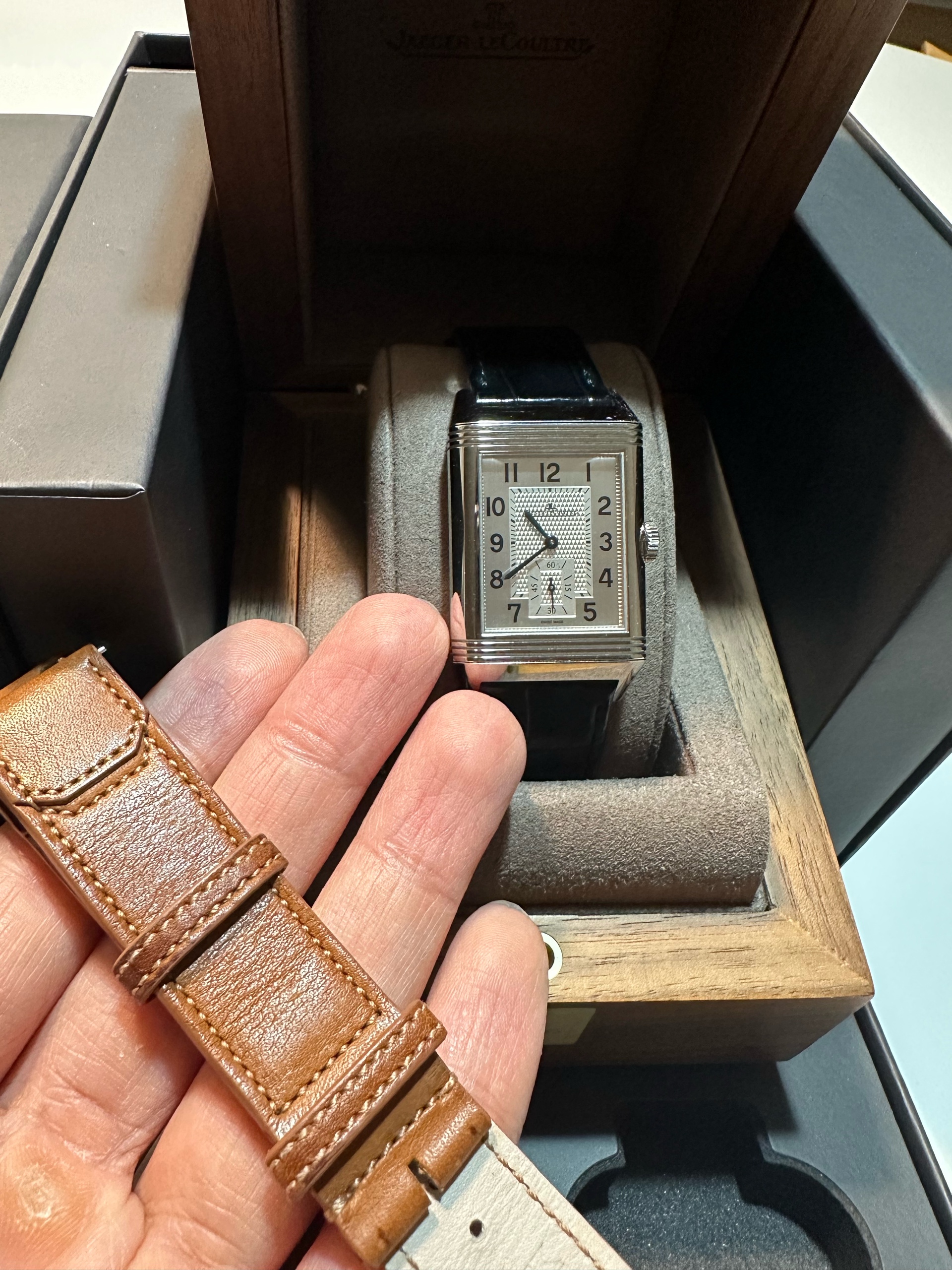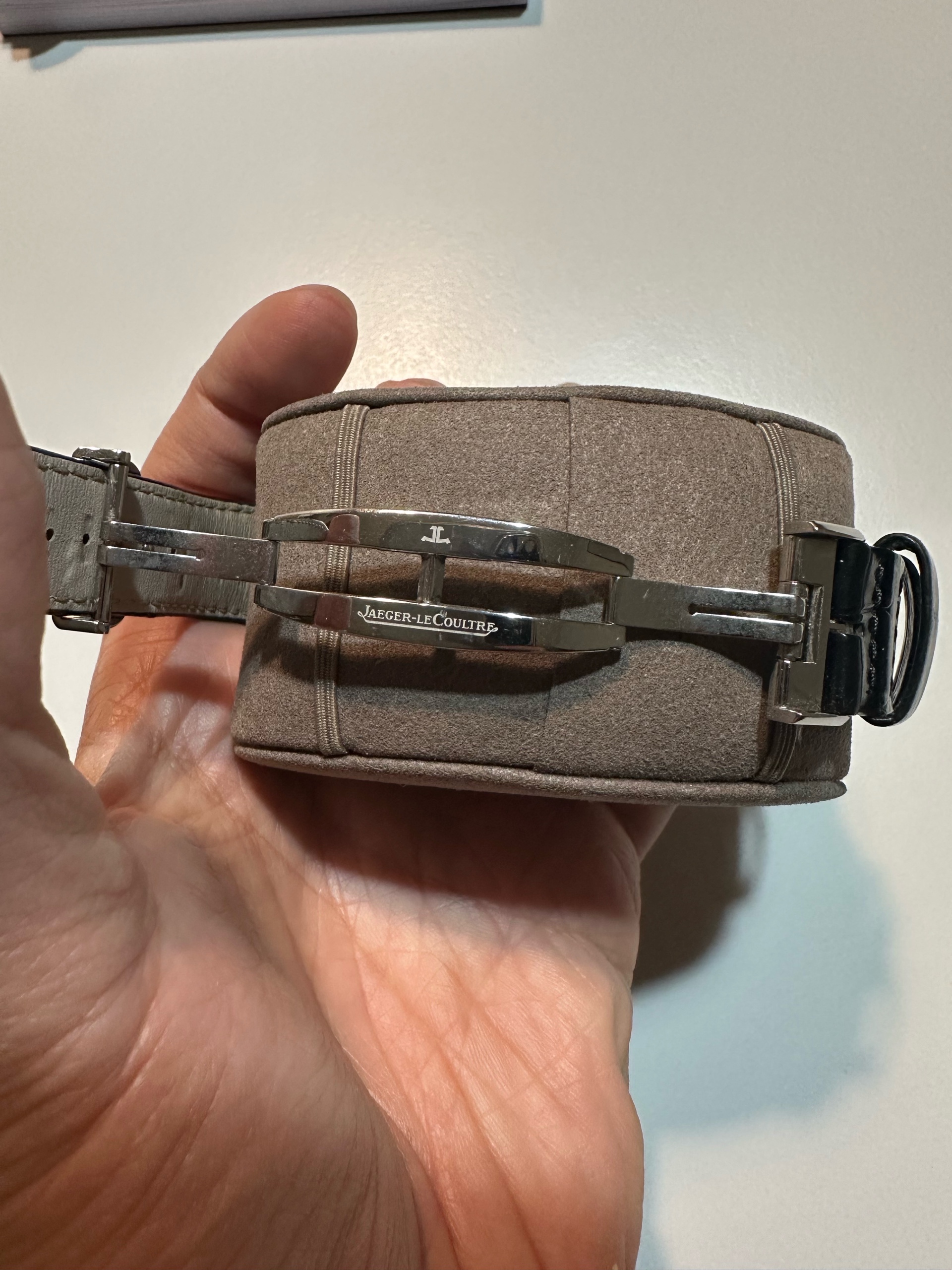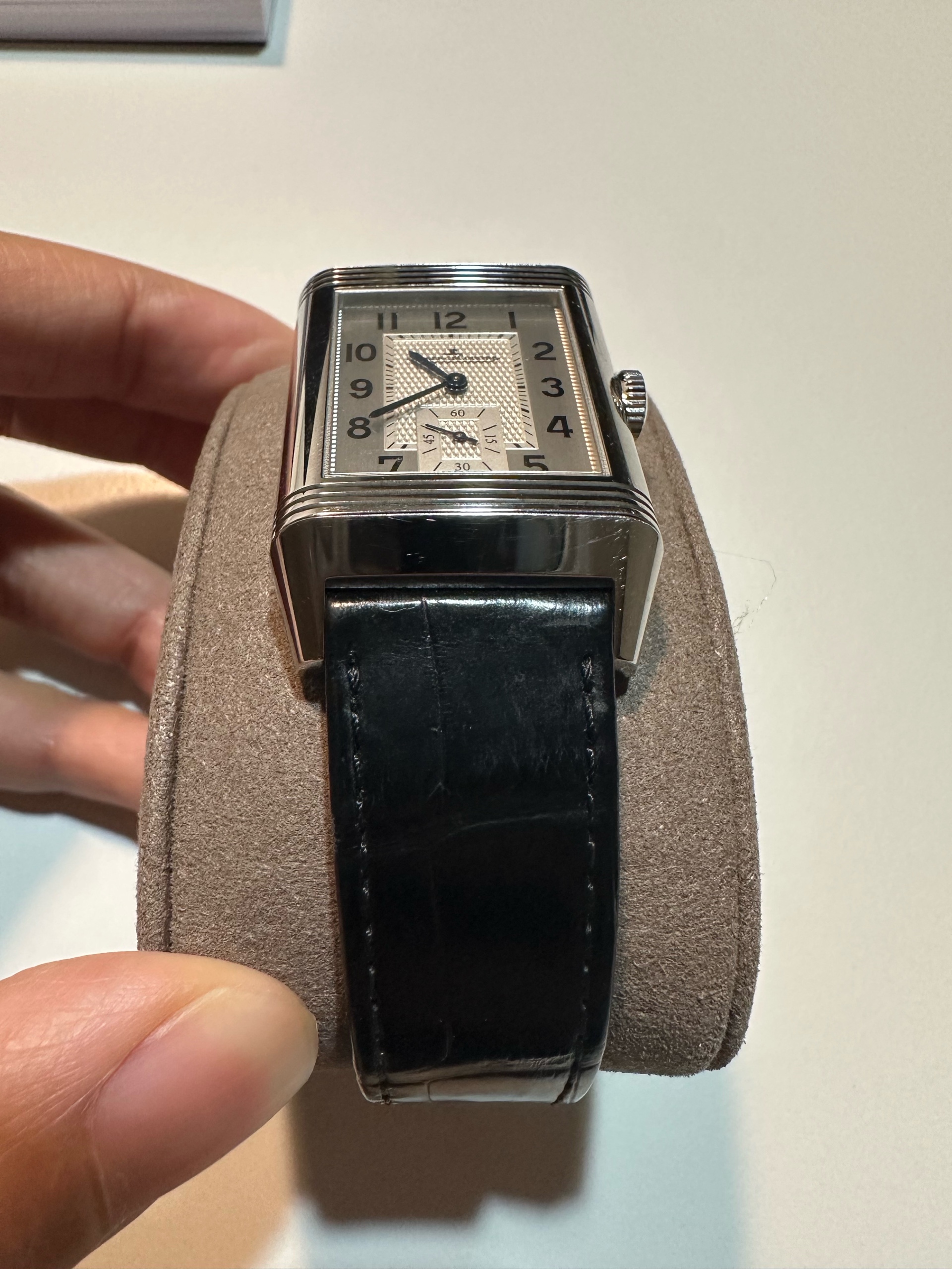 정식 구매 시 기본 줄은 브라운 소가죽 스트랩인데, 현재는 예거 르쿨트르 정품 블랙 악어줄로 교체하여져 있는 상태입니다.