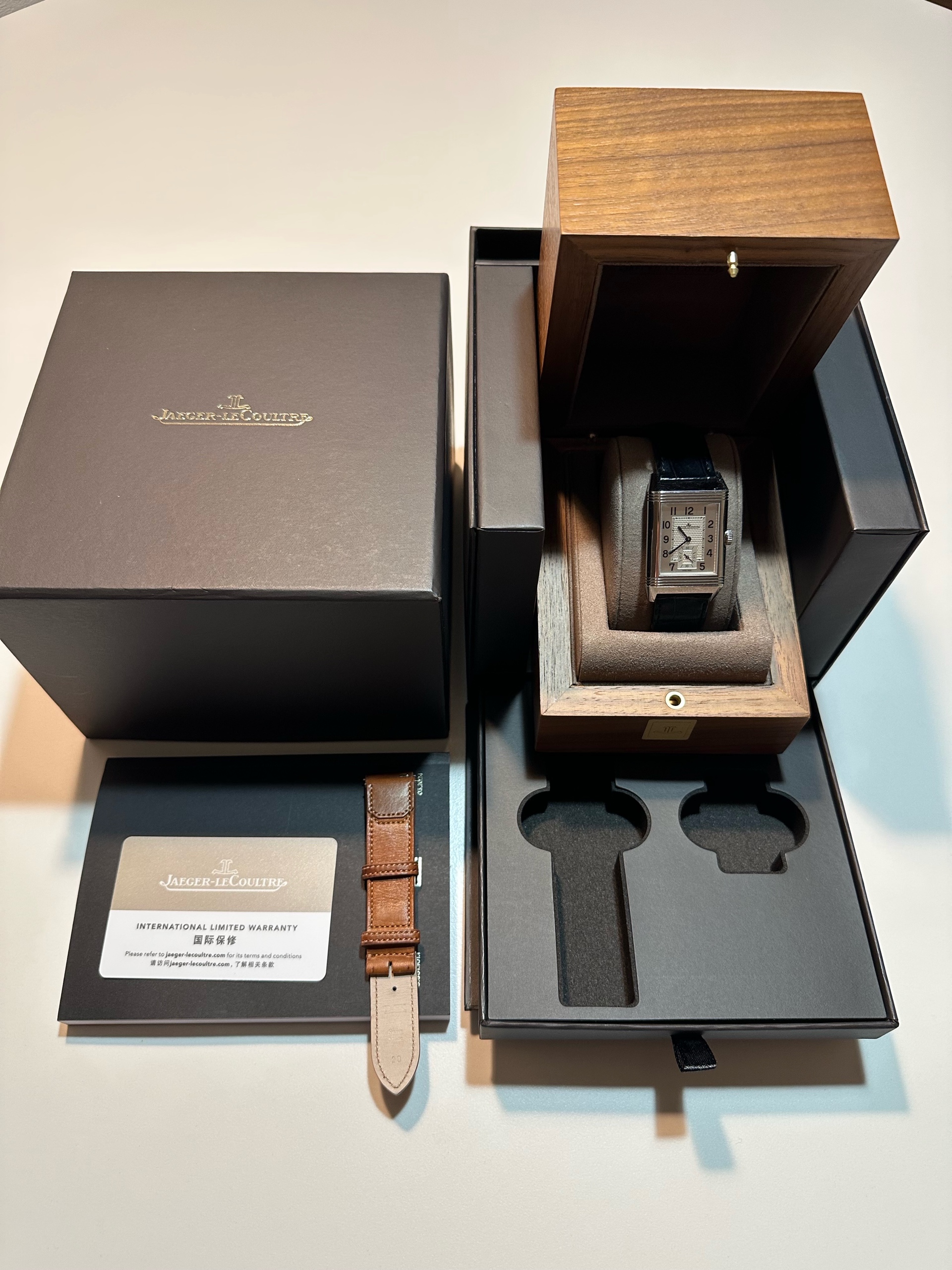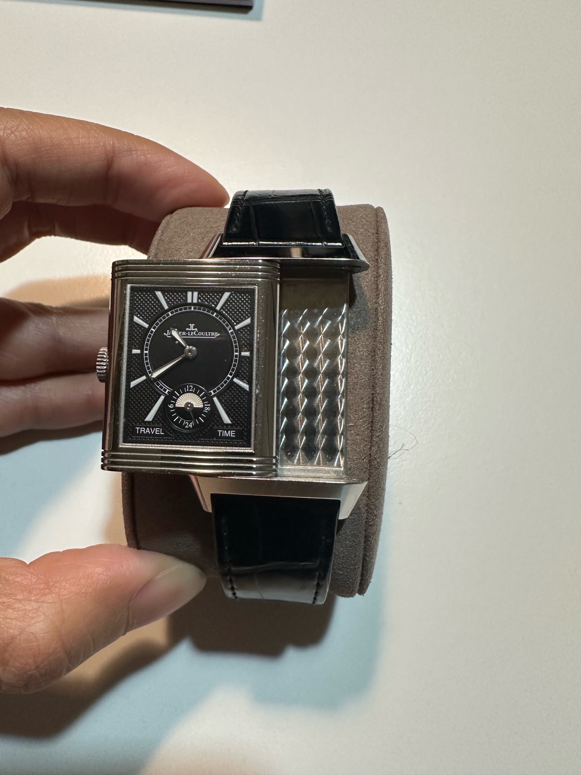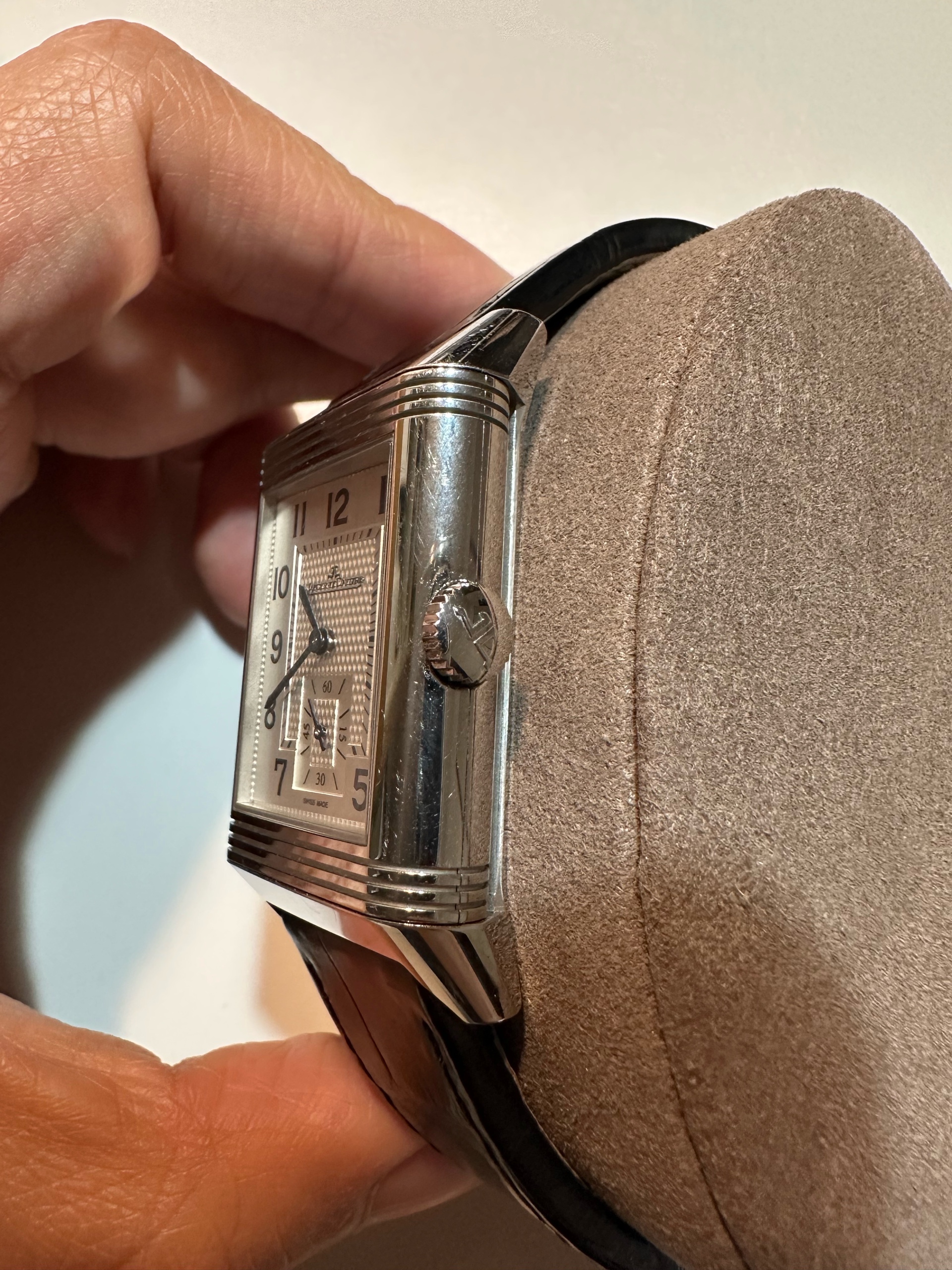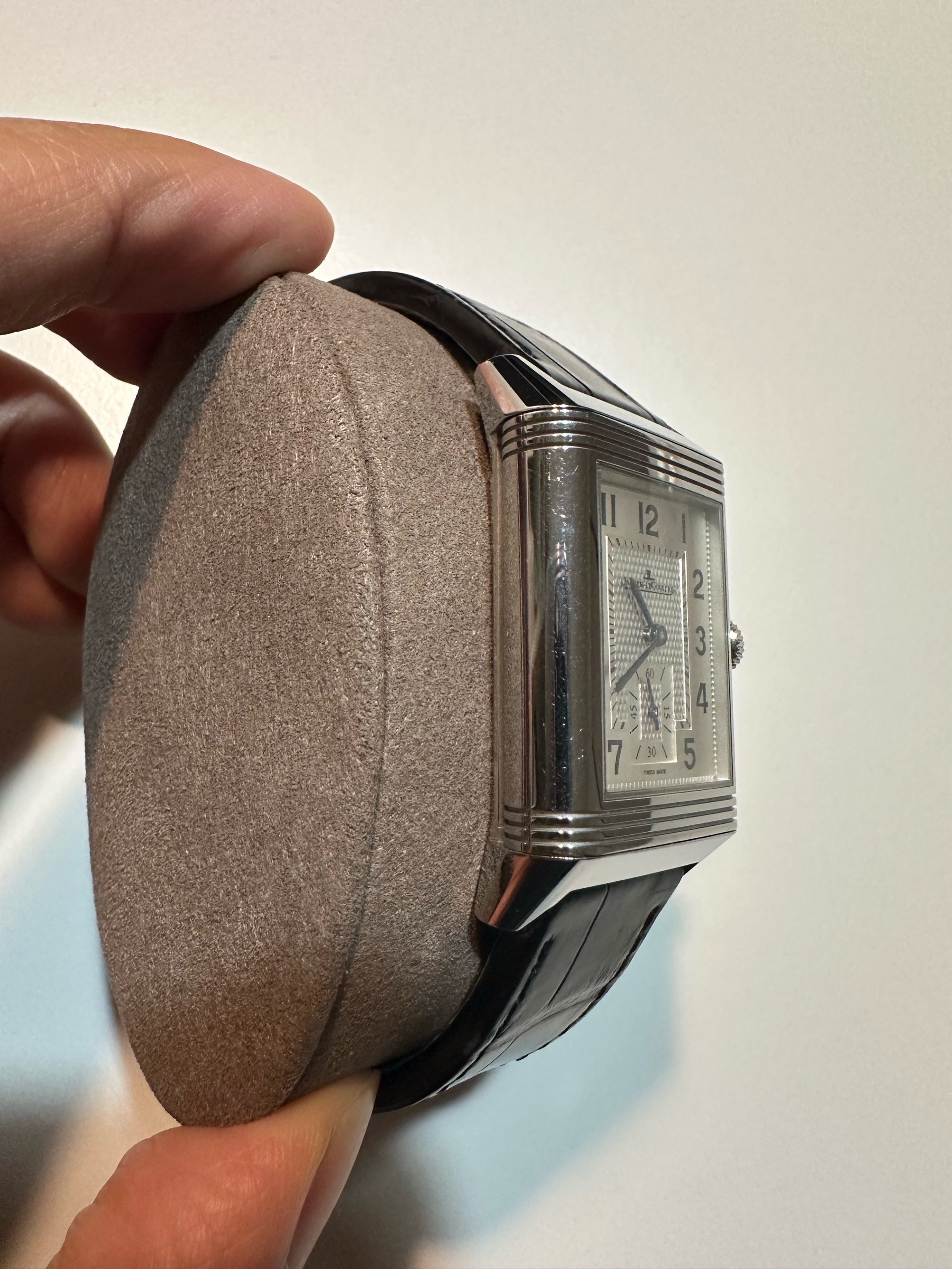 정식 구매 시 기본 줄은 브라운 소가죽 스트랩인데, 현재는 예거 르쿨트르 정품 블랙 악어줄로 교체하여져 있는 상태입니다.
