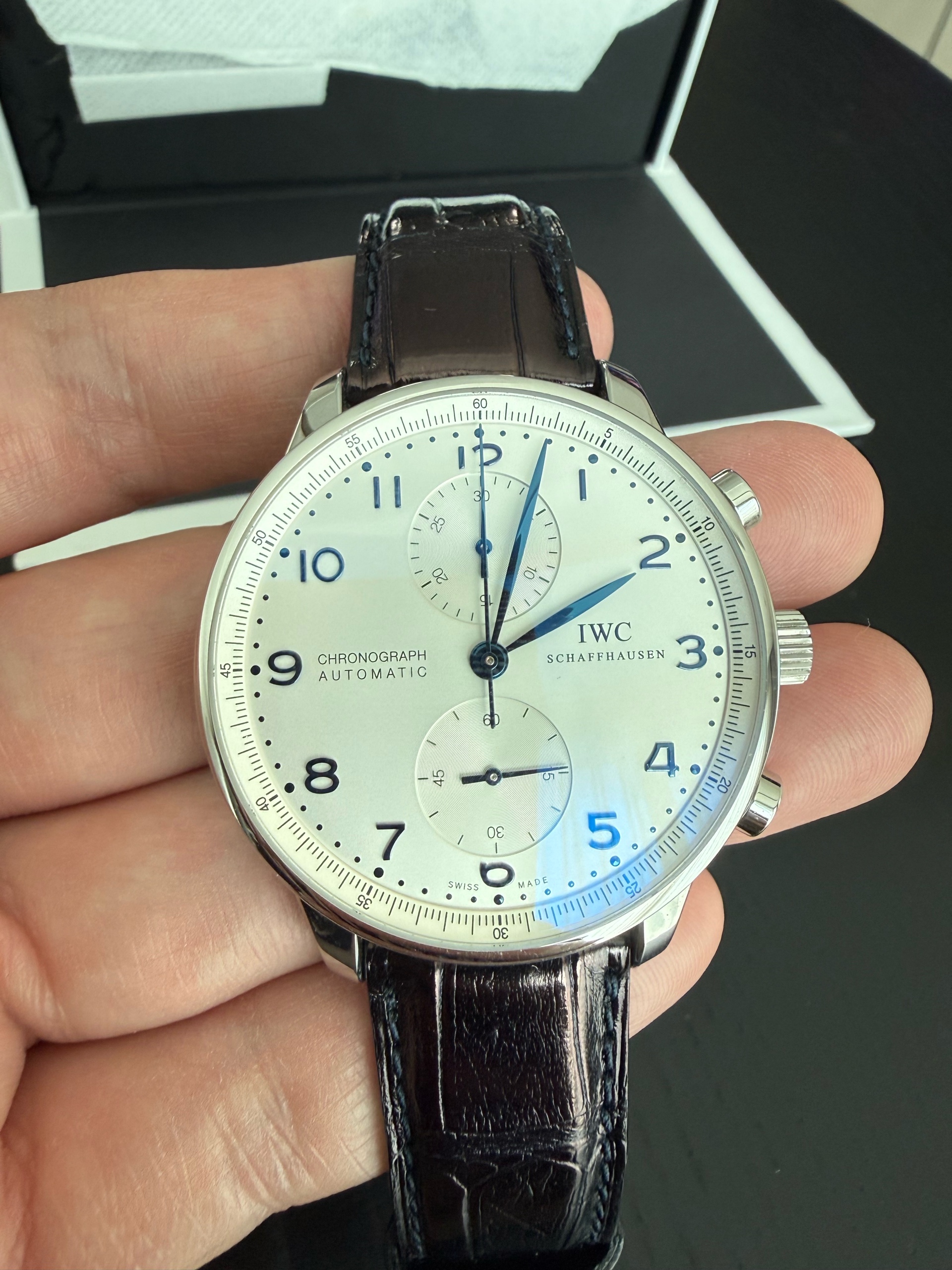 IW371446,실버,가죽 스트랩,이너 타키미터,셀프와인딩,Portugieser Chronograph,Portugieser,IWC,IWC Portugieser Chronograph IW371446,IWC 포르투기저 크로노그래프 41미리,IWC 포투기저 크로노그래프 41미리,IWC 포르투기져 크로노그래프 41미리,IWC 포투기져 크로노그래프 41미리,IWC 포르투기저 41미리,IWC 포르투기져 41미리,셀프 와인딩,Switzerland,Stainless steel,Deployant folding clasp,Chronograph subdial,small seconds / applied arabic numeral indices,minute track,Hour + minute + central chronograph + counter + small seconds,Chronograph subdial, small seconds / applied arabic numeral indices, minute track