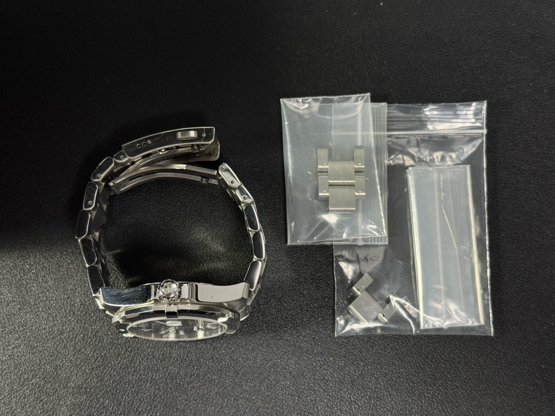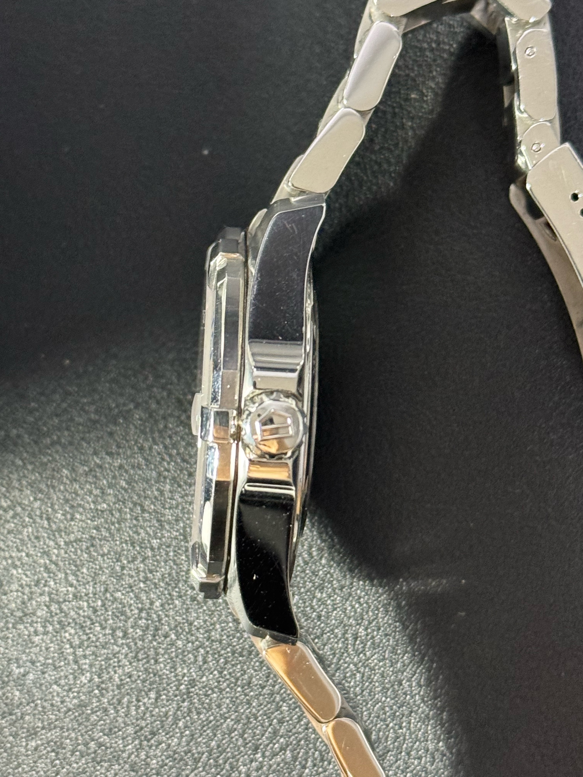 • 외관: 베젤 및 브레이슬릿 생활 기스 / 글라스 기스 / 좌측면 긁힌 자국 존재