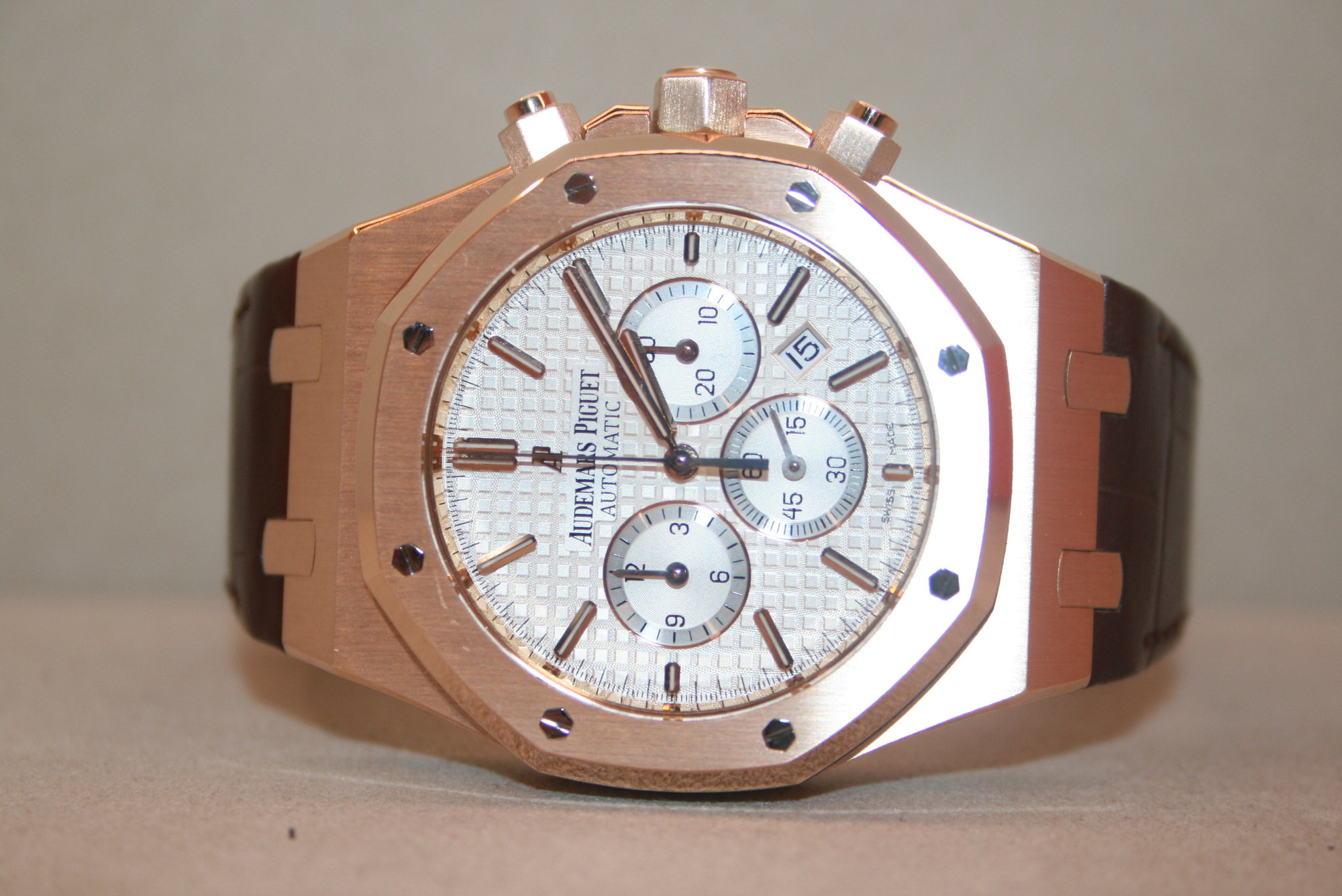 가죽 스트랩,사파이어 크리스탈,41mm,Royal Oak Chronograph,로열 오크 크로노그래프,Royal Oak,Audemars Piguet,오데마 피게,AP Audemars Piguet Royal Oak Chronograph 26320OR.OO.D088CR.01,AP Audemars Piguet Royal Oak Chronograph Pink Rose Gold 41mm 26320OR,AP 로열 오크 로열오크 로얄 오크 로얄오크 크로노 크로노그래프 핑크 로즈 골드 로골 41mm 41미리 26320OR,셀프와인딩,Rose gold,Deployant folding buckle,Date,chronograph subdials,small seconds / applied baton indices,small seconds / applied hour markers,셀프 와인딩,Deployant clasp,실버,Pink gold,Deployant folding clasp with anchor buckle,핑크 골드,그랑 타피세리,가죽,스트랩,Date, chronograph subdials, small seconds / applied hour markers,Royal Oak