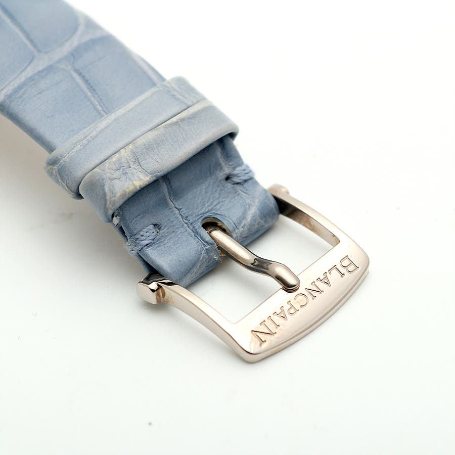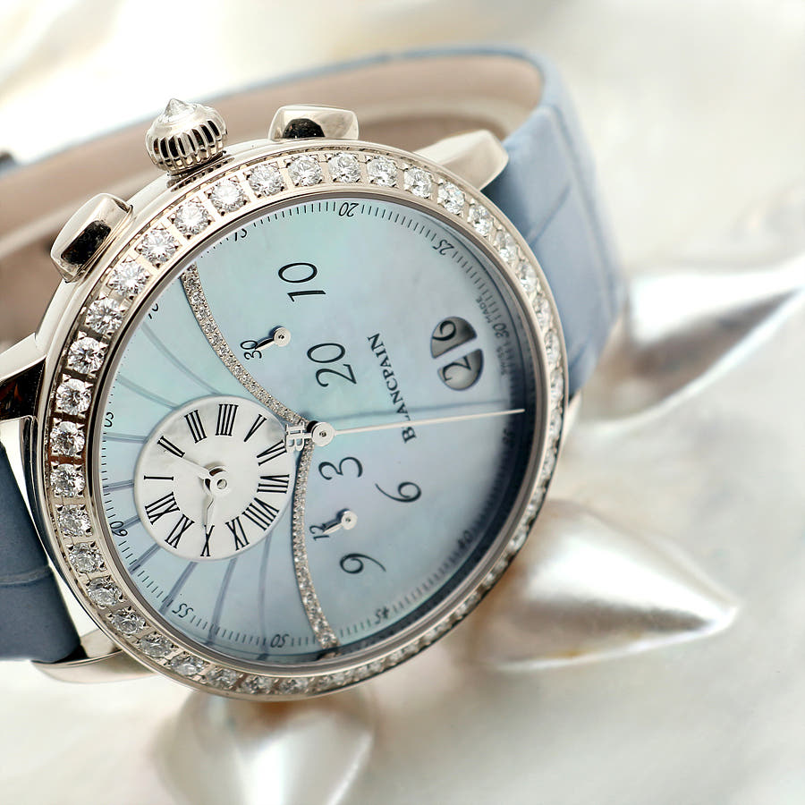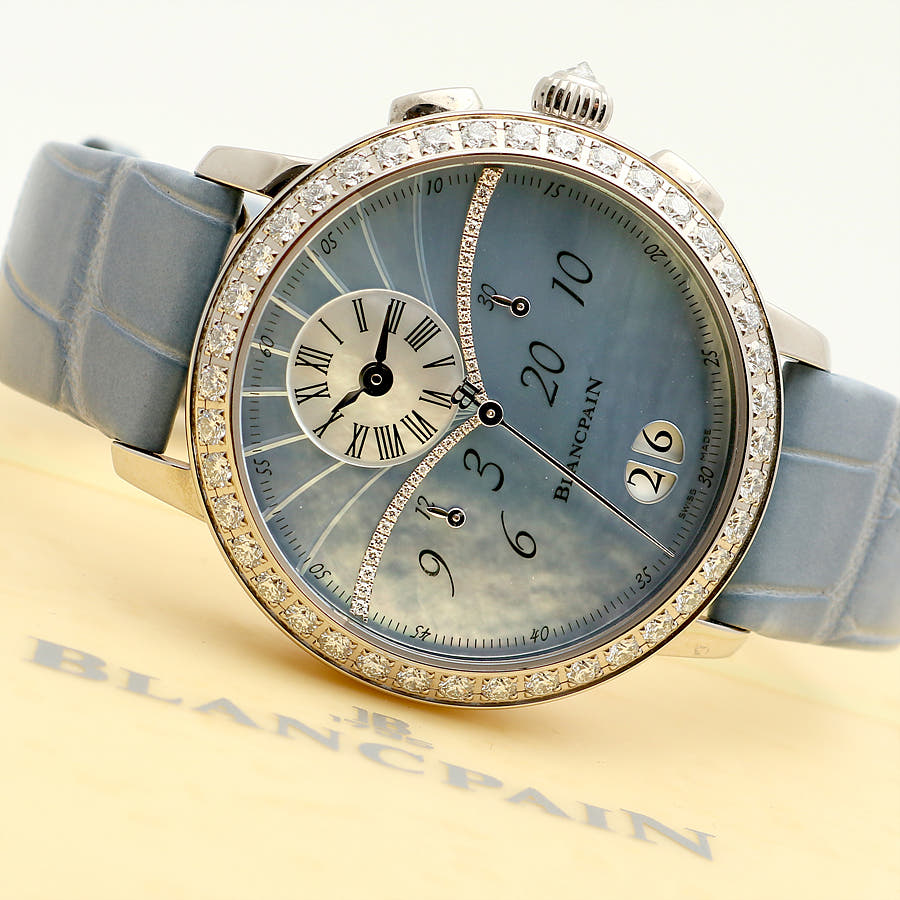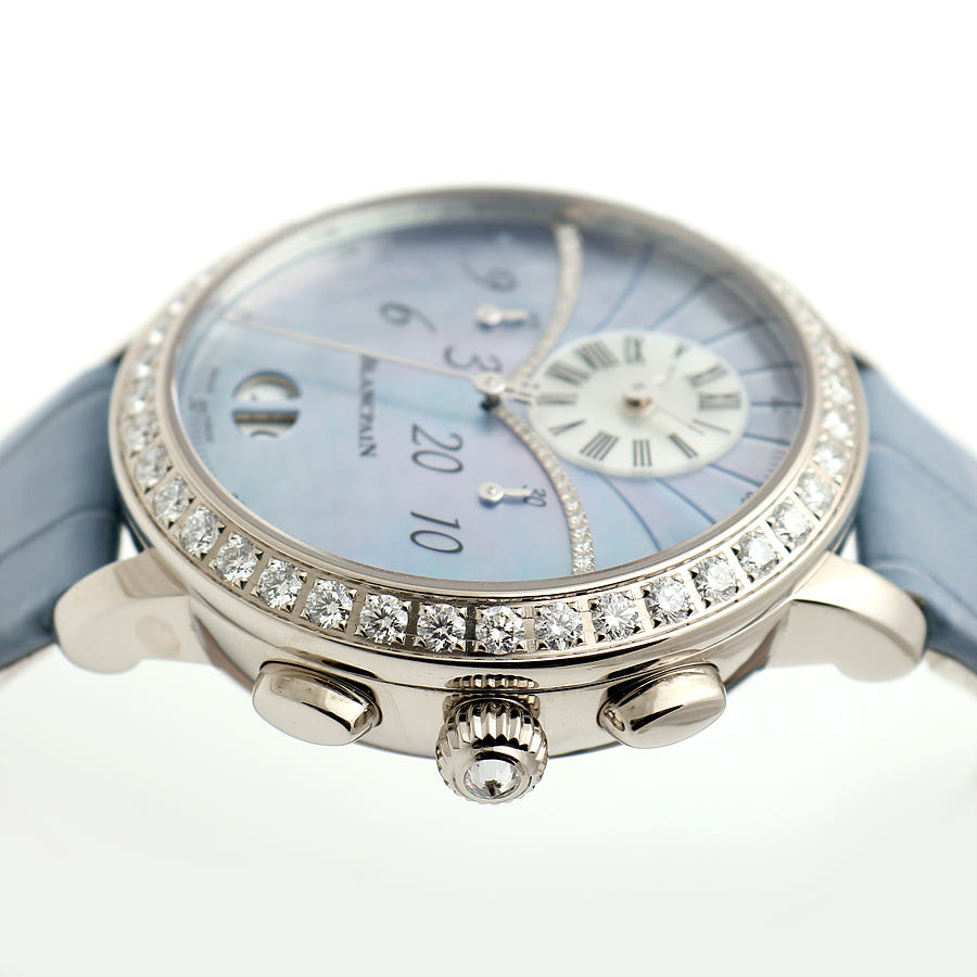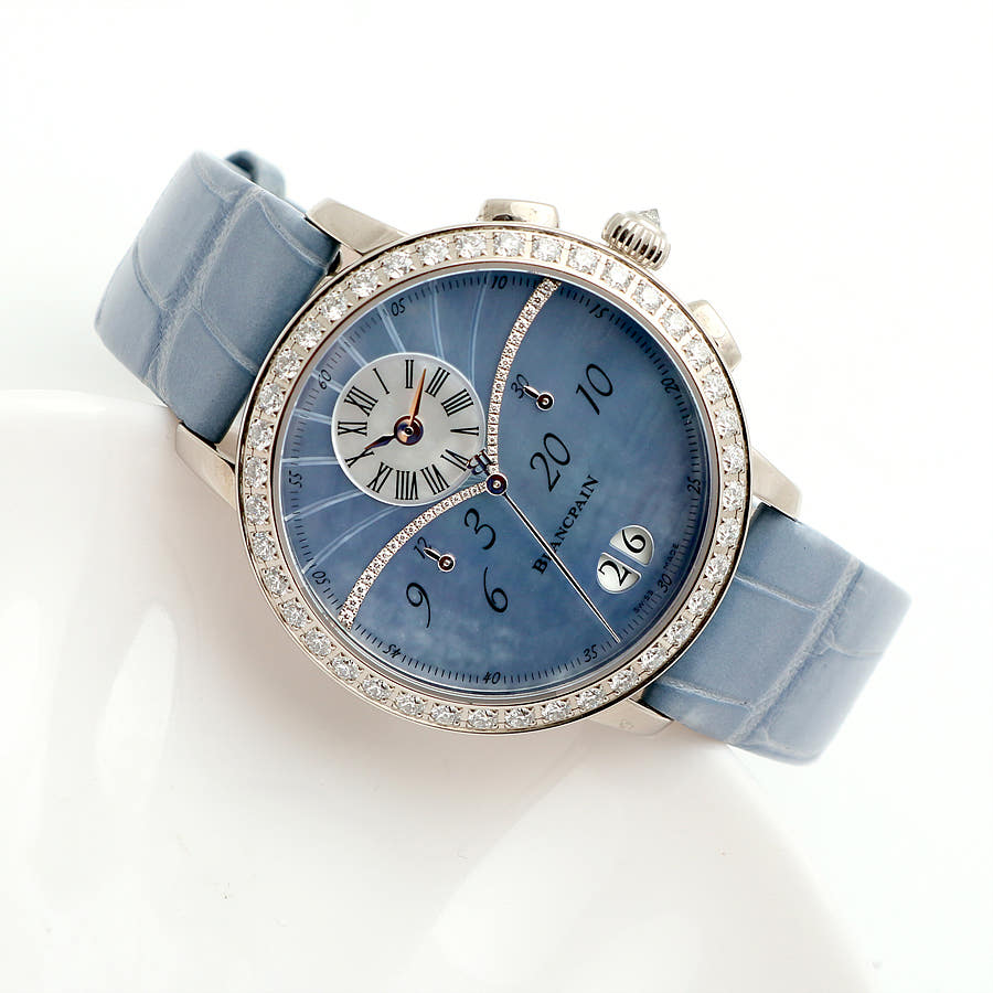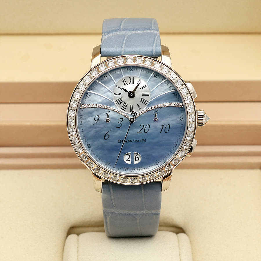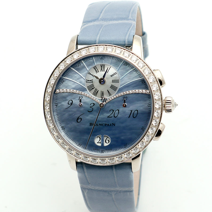 블랑팡 플라이백 크로노그래프 크로노 플라이백 빅 그랑 데이트 빅데이트 그랑데 데이트 그란데 데이트 화이트골드 블루 자개 MOP 마더 머더 오브 펄 화이트 골드 화골 38.6mm 오토매틱 셀프 와인딩 가죽 스트랩,Blancpain Women Collection Flyback Chronograph Chronographe Flyback Grande Date Big Date White Gold Blue Mother of Pearl MOP White Gold 38.6mm Leather Strap,3626-1954L-58A 3626 1954L 58A 3626.1954L.58A,Chronographe Flyback Grande Date,크로노그래프 플라이백 그랑 데이트,Women,Blancpain,블랑팡,블루,자개,가죽 스트랩,사파이어 크리스탈,38.6mm,White gold,Pin buckle,Big date,off-centre dial,chronograph counter subdials,Big date, off-centre dial, chronograph counter subdials