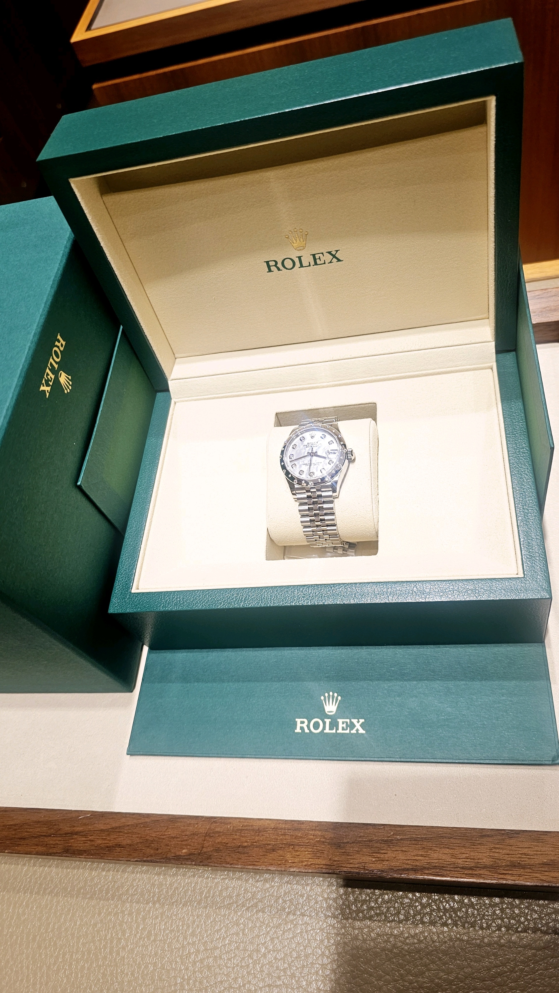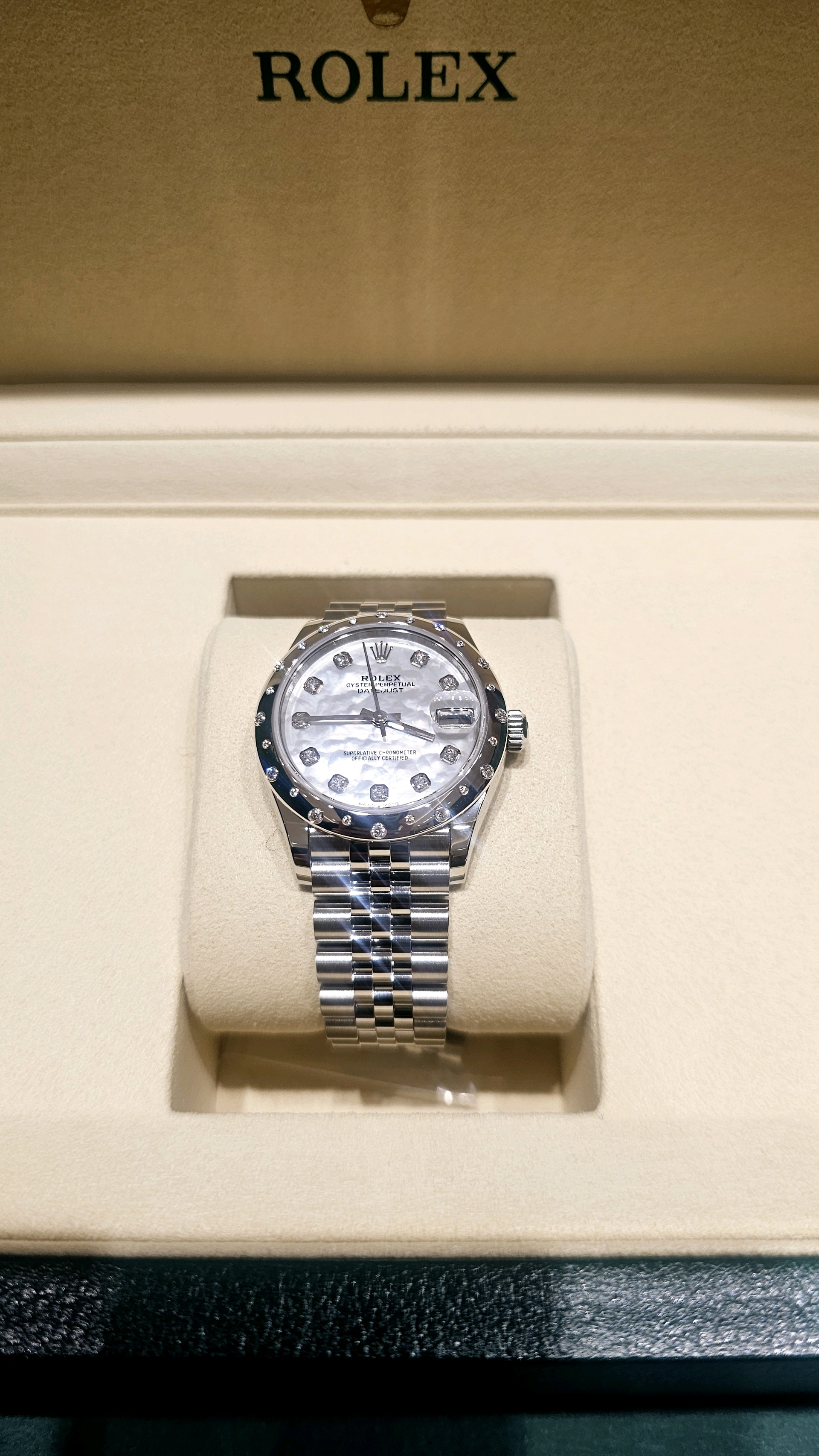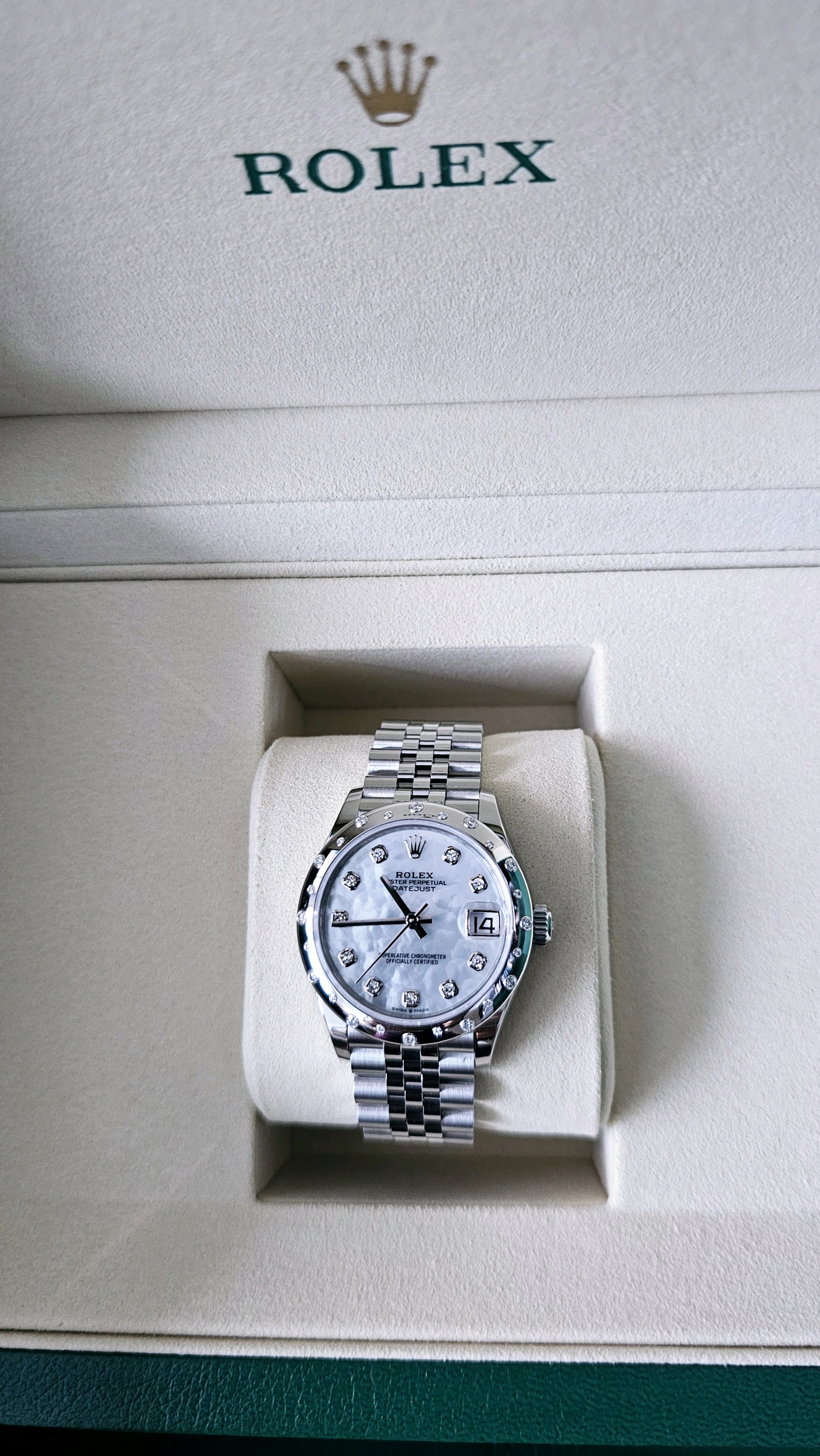 (4월 새상품)롤렉스 데이트저스트 오이스터, 31mm, 다이아몬드 텐 포인트, 화이트골드 다이아몬드 세팅 베젤, 화이트 진주 자개 다이얼, 새제품, 풀구성, 한시적 정가 이하 판매