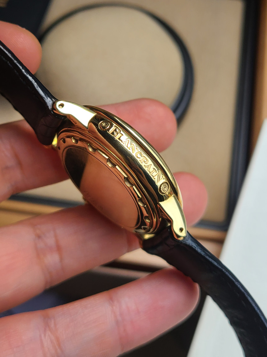 시계 옆면에 새겨진 자랑스러운 BLANCPAIN 로고가 돋보이는 모델이며, 케이스와 버클 전부 18K 옐로우골드로 구성된 매우 고급스러운 전통 스위스 하이앤드 명품 시계입니다.