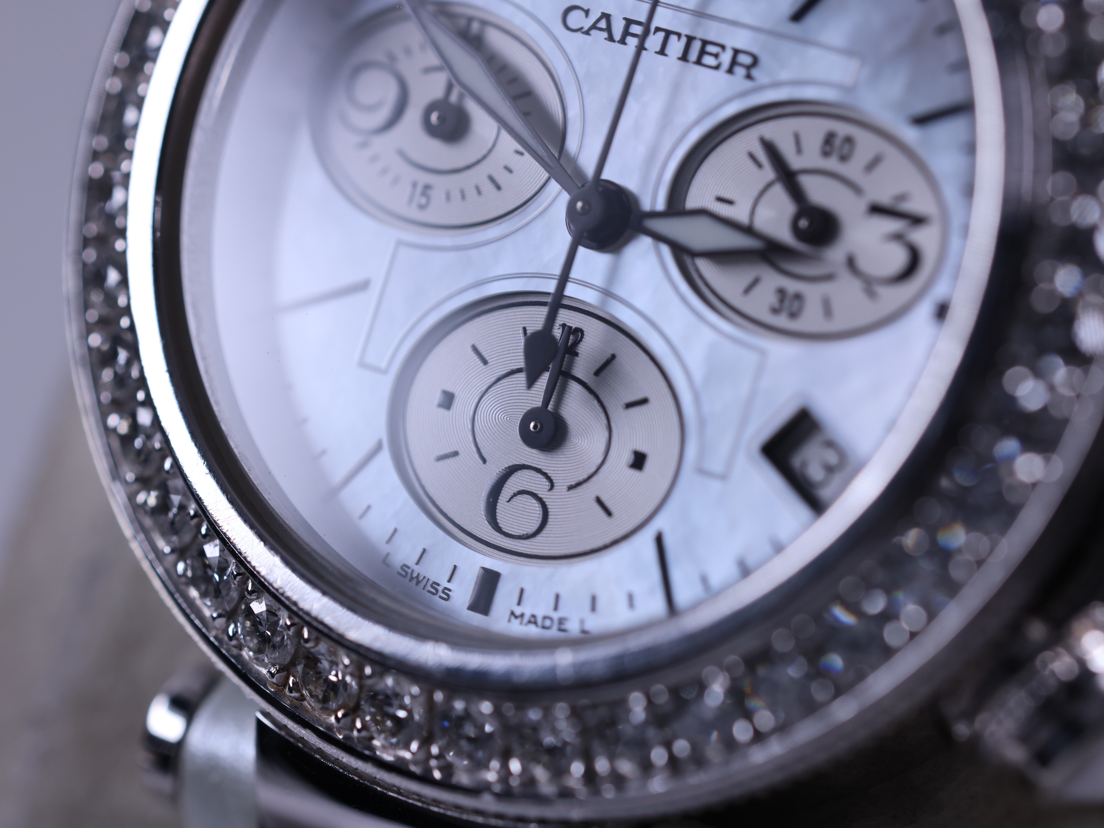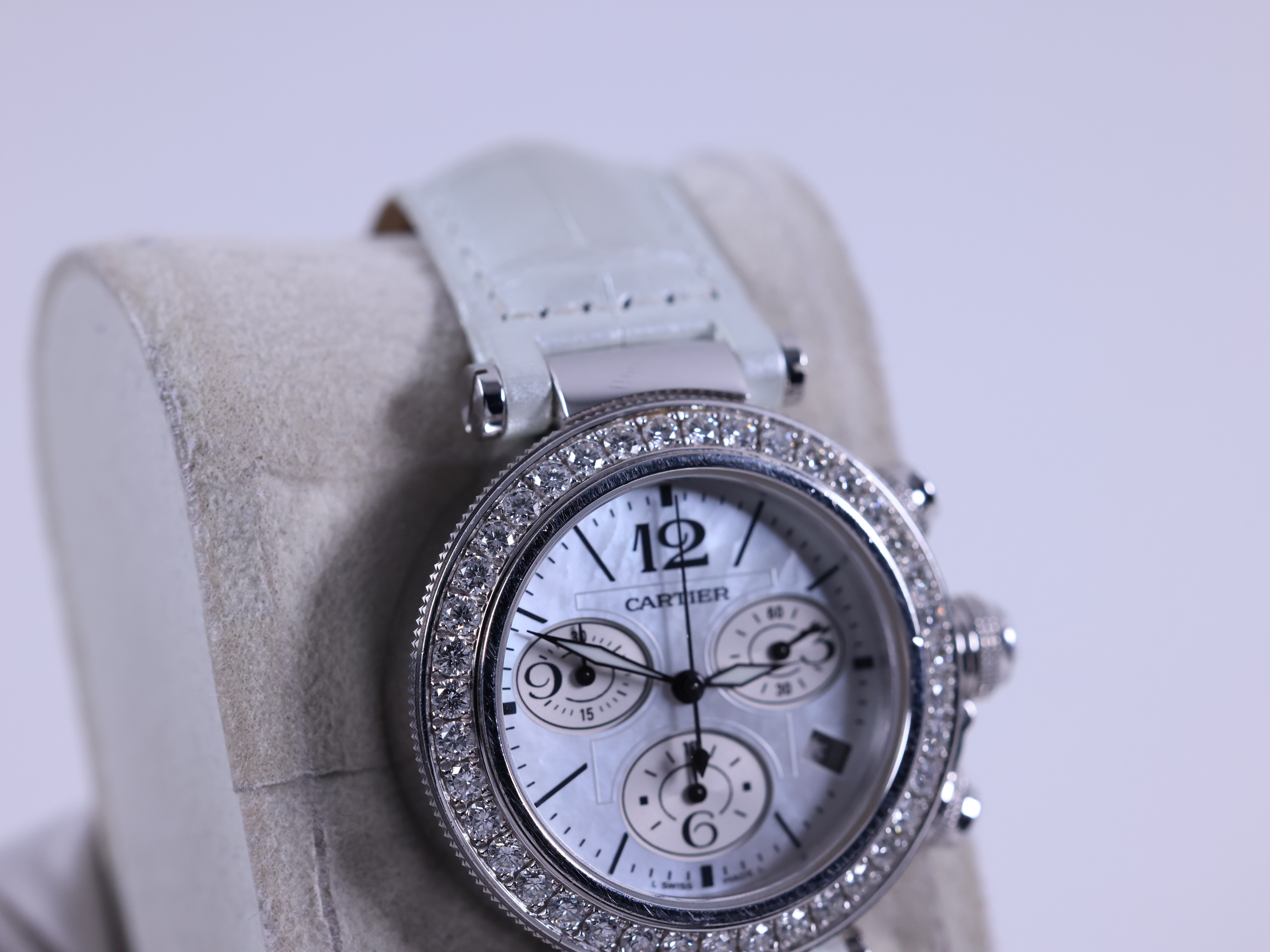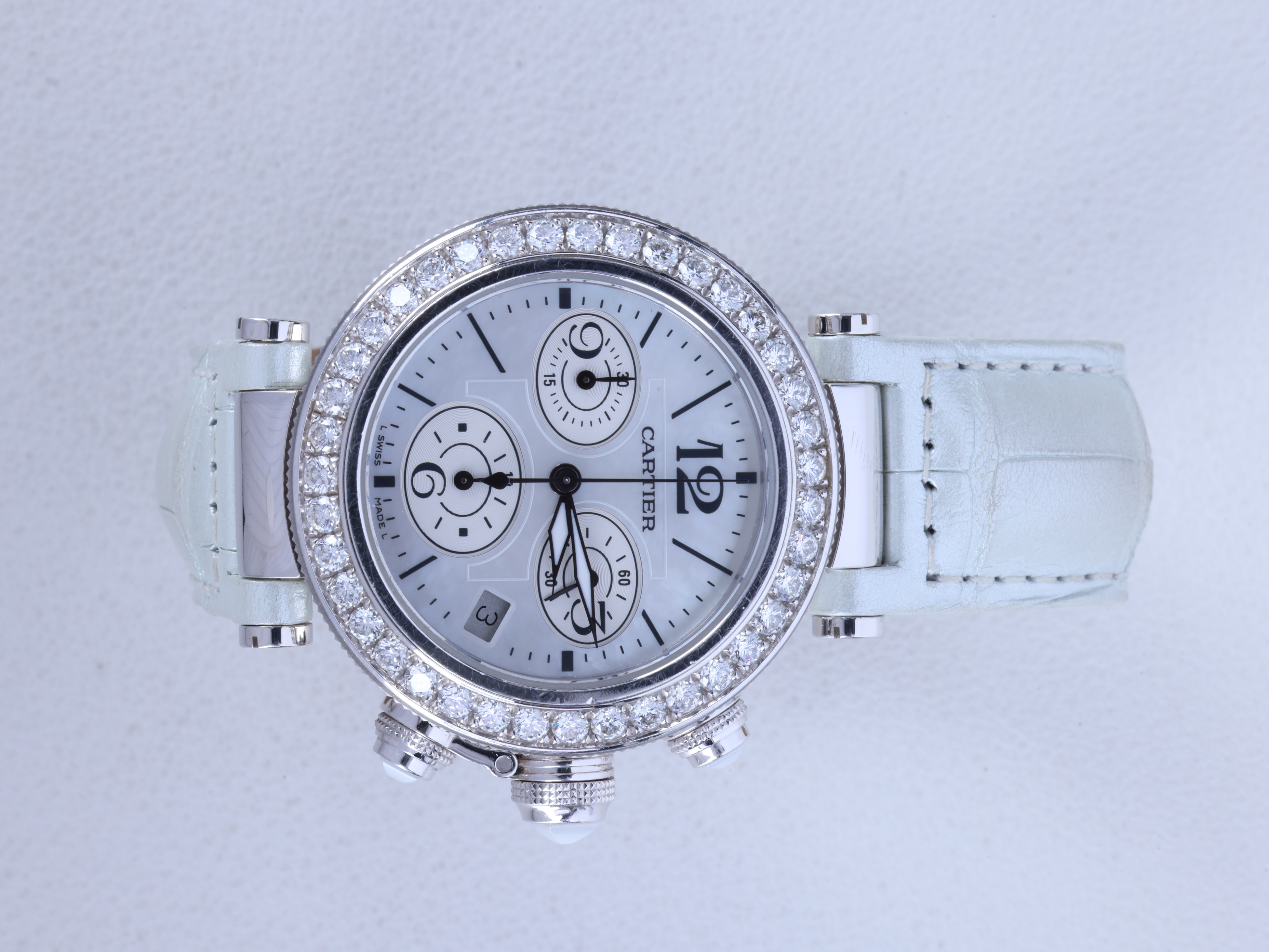 WJ130003,까르띠에 카르티에 파샤 씨타이머 레이디 크로노 크로노그래프 레이디 화이트 골드 37 화이트 mop 자개 다이아 화이트 골드 다이아몬드 쿼츠,화이트,자개,화이트 골드,37mm,다이아몬드 세팅,Stainless steel + spinel,Deployant folding clasp,Date,chronograph subdials,small seconds / arabic numerals & baton idices,Pasha Seatimer Lady Chronograph,파샤 씨타이머 레이디 크로노그래프,Pasha de Cartier,Cartier,까르띠에,Stainless steel + ceramic,Date, chronograph subdials, small seconds / arabic numerals & baton idices