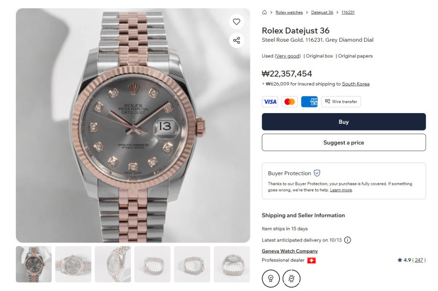 일반 옐로우골드 모델보다 훨씬 고가의 시계이며, 아름다우며 고급스러운 핑크 색상의 로즈골드 컬러와 함께 회색빛 고스트 그레이 다이아몬드 다이얼이 아름다운 조화를 이룹니다.
