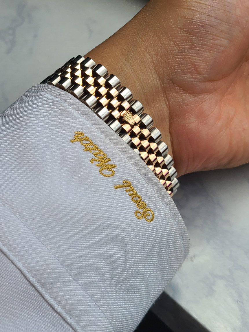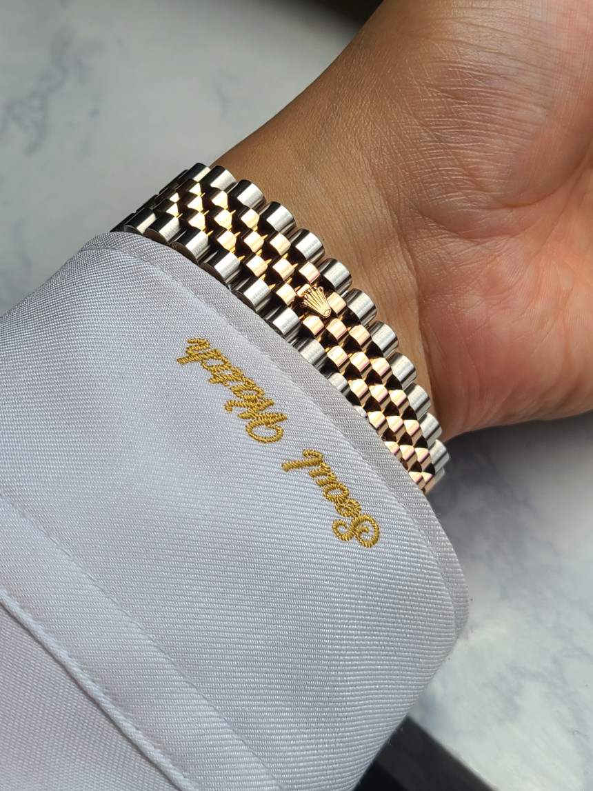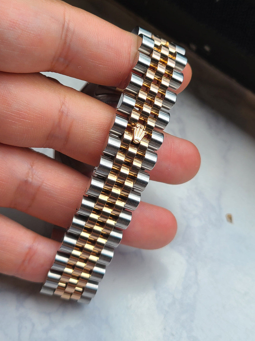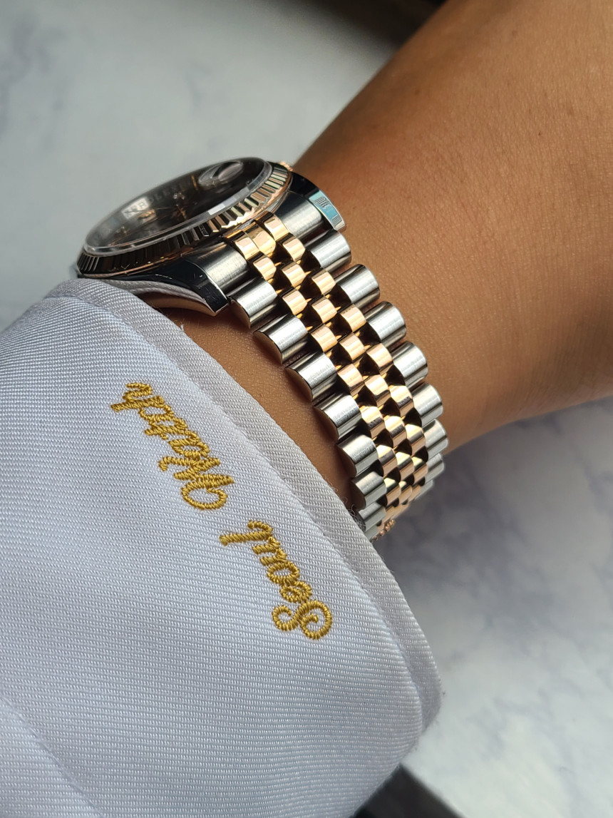 롤렉스의 상징과도 같은 플루티드 베젤과 5연 쥬빌레 브레이슬릿이 들어간 완벽한 콤비데이션 모델입니다. 핑크색 로즈골드 부분은 전부 18K 골드가 들어간 콤비 모델로 일반 스틸보다 훨씬 높은 리테일가를 형성하는 시계입니다. (★사진참조)