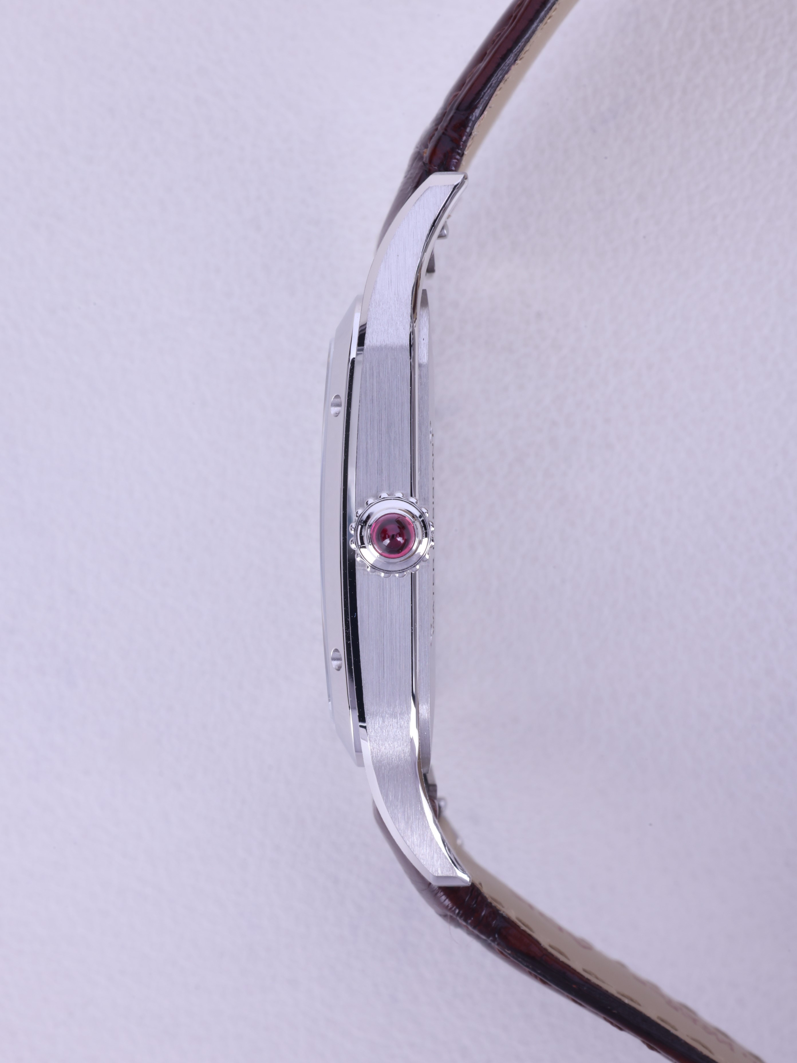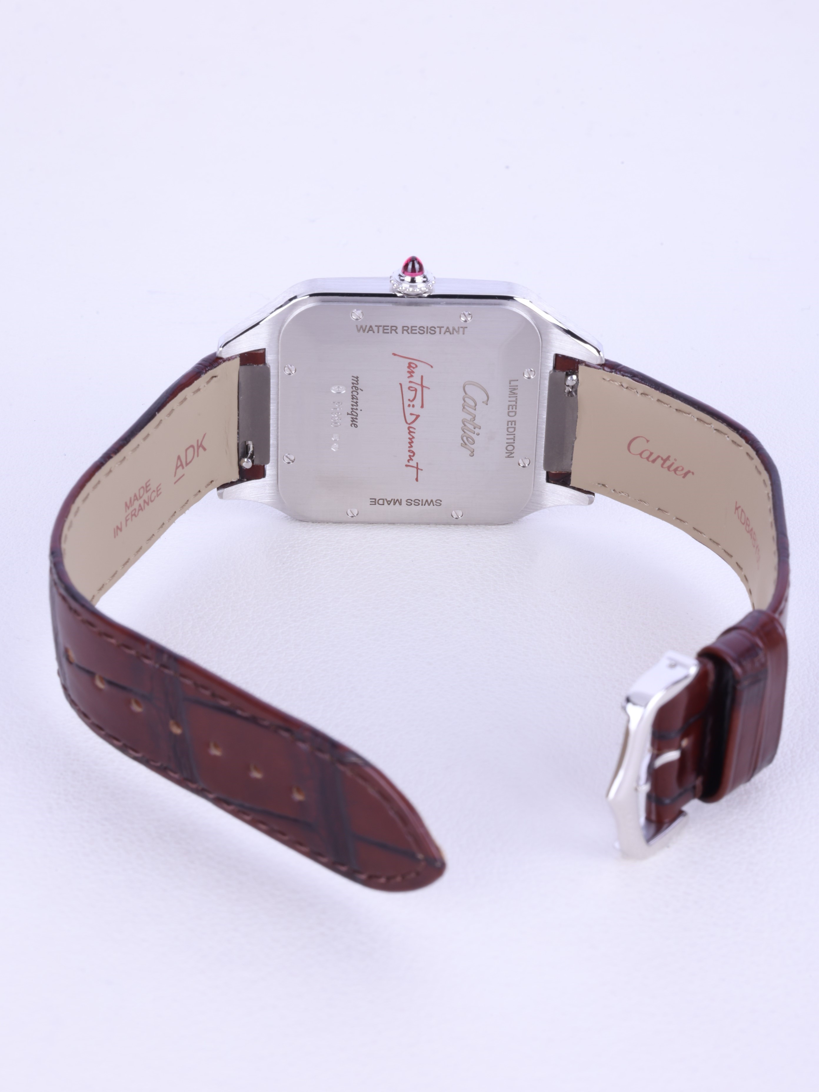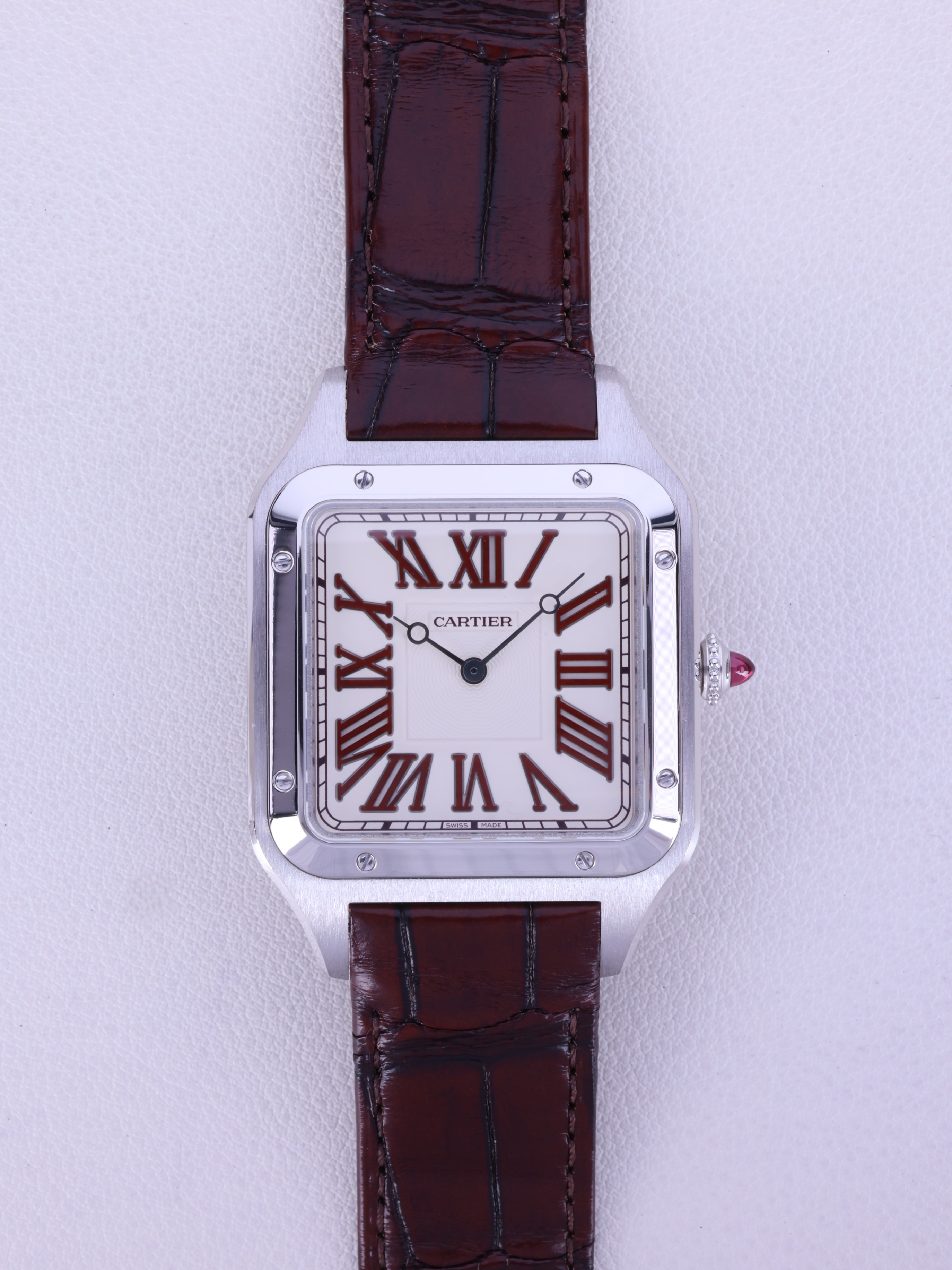 Cartier Santos Dumont XL Platinum Limited Edition Platinum Burgundy Text LEather Strap Handwound Handwinding Hand winding WGSA0082,까르띠에 카르띠에 산토스 뒤몽 XL엑스트라 라지 버건디 플래티넘 버건디 리미티드 에디션 WGSA0082 버건디 플래티넘 버건디 핸드와인딩 매뉴얼 와인딩 핸드 와인딩 가죽 스트랩,아이보리,가죽 스트랩,사파이어 크리스탈,핸드 와인딩,Platinum,Pin buckle,Red jasper roman numeral indices,Santos Dumont XL Limited Edition,산토스 뒤몽 XL 리미티드 에디션,Santos de Cartier,Cartier,까르띠에,Platinum + ruby